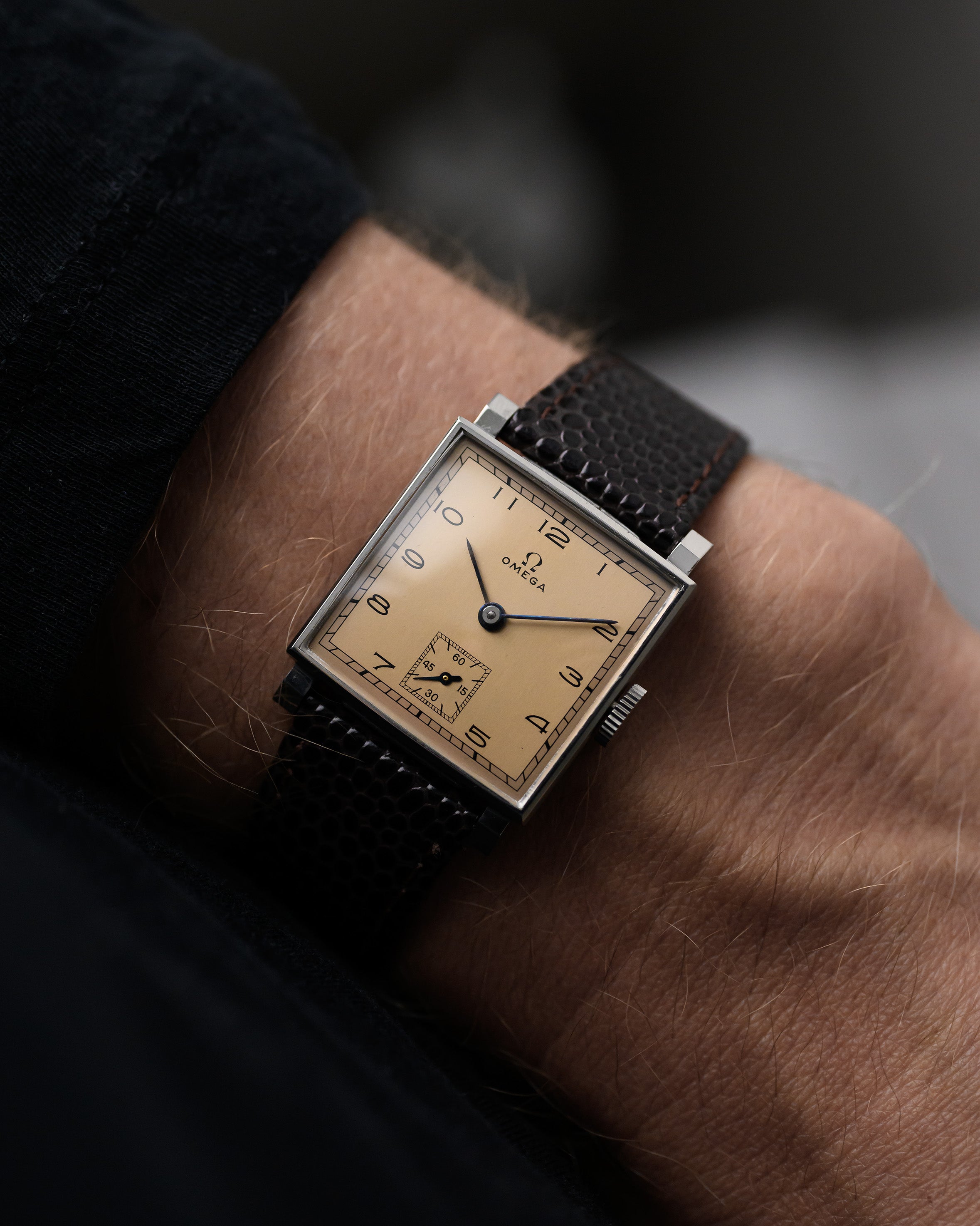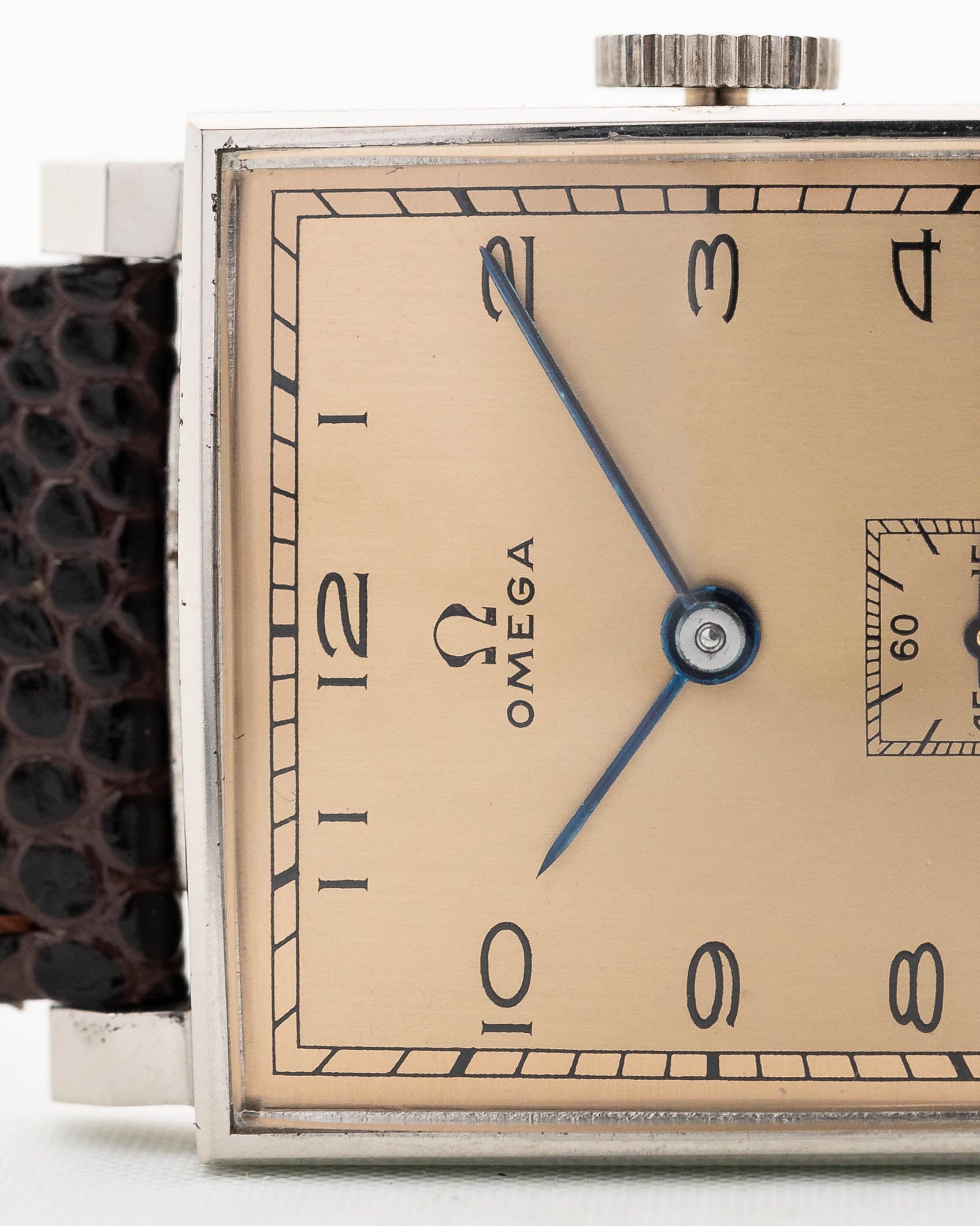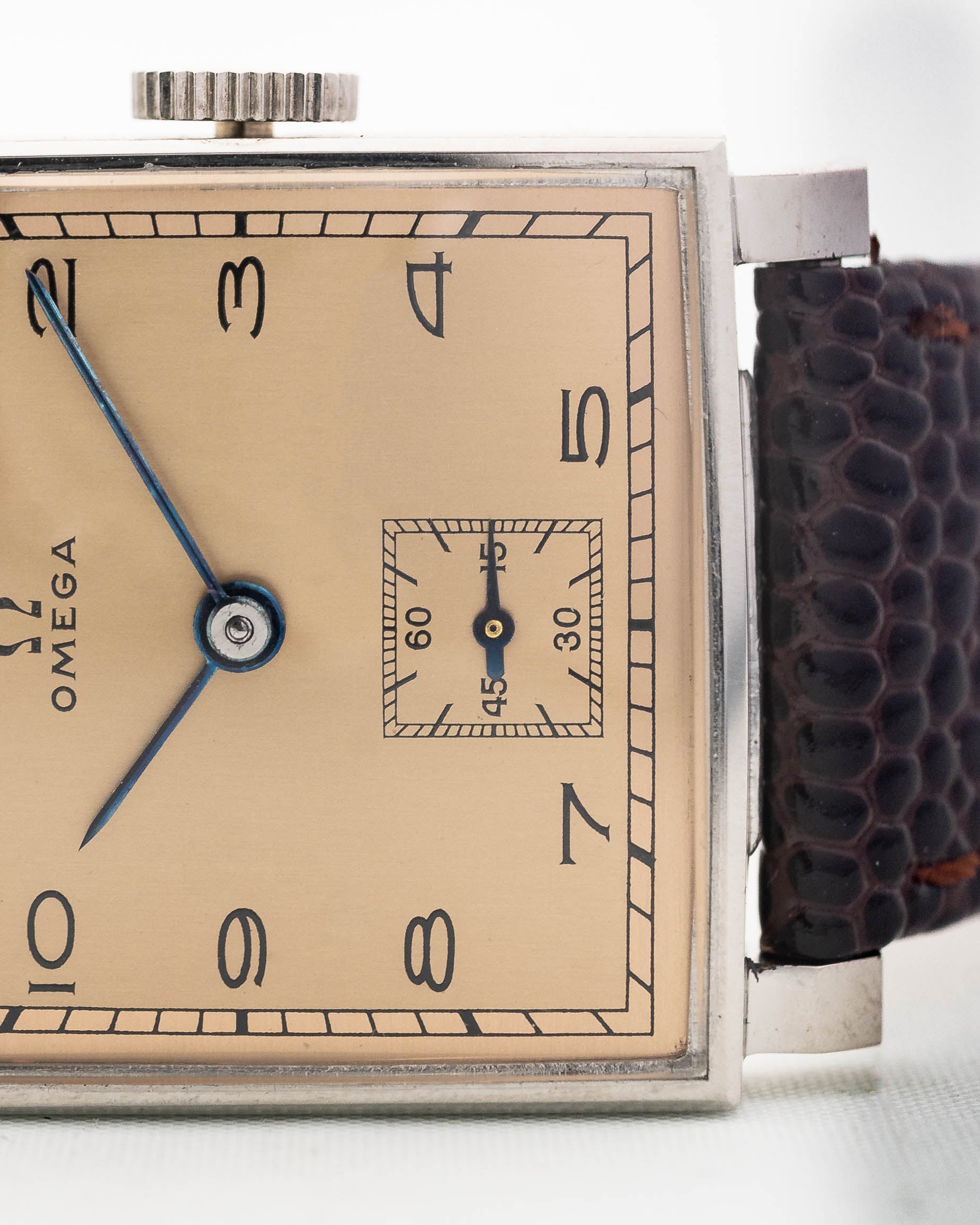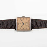 Qui può vedere un affascinante orologio da abito rettangolare Art Déco realizzato da Omega nel 1935. Presenta una cassa quadrata in acciaio inossidabile con anse sottili e semplici e uno splendido quadrante Art Déco color salmone con numeri romani. La ciliegina sulla torta è la condizione straordinaria.