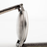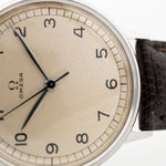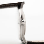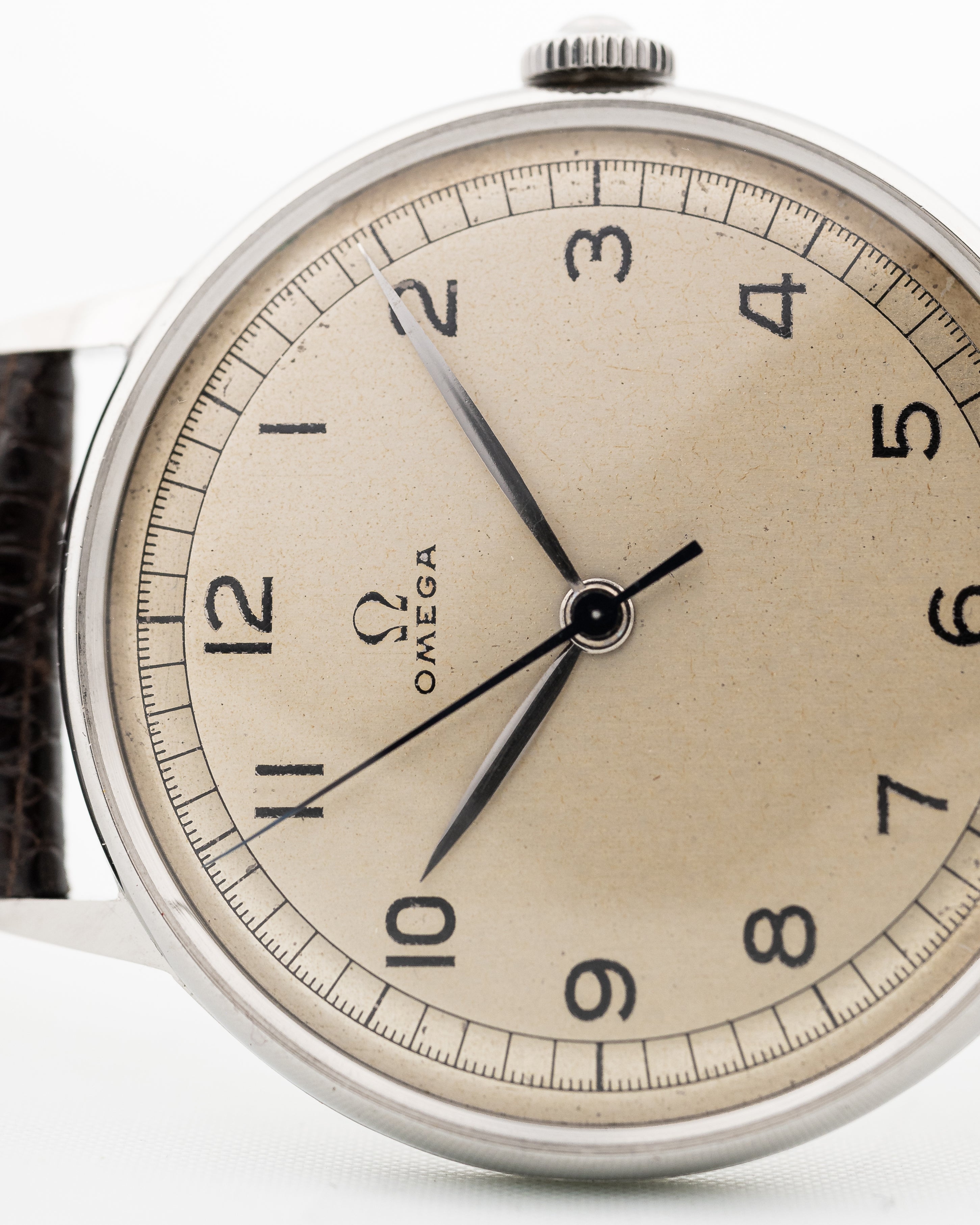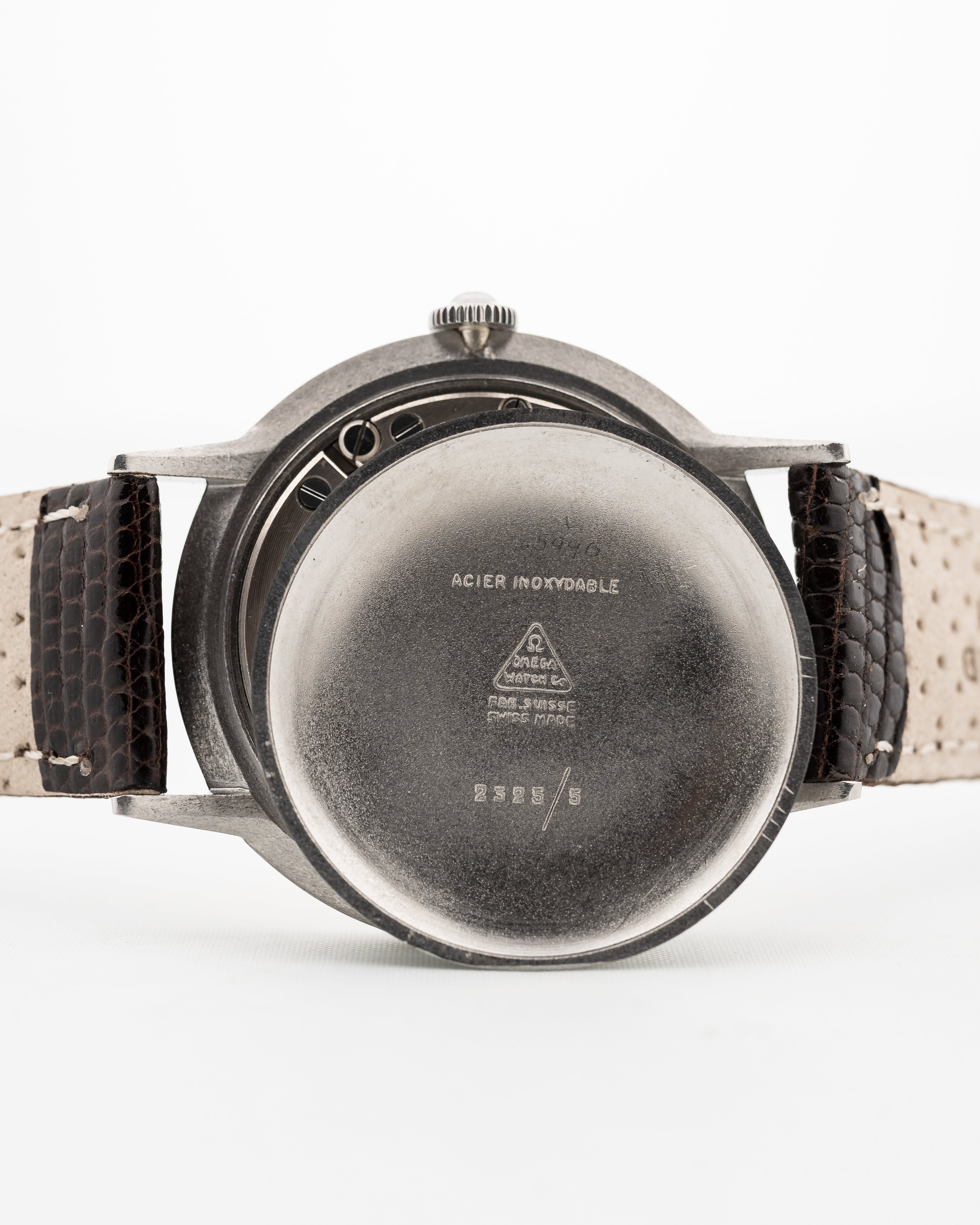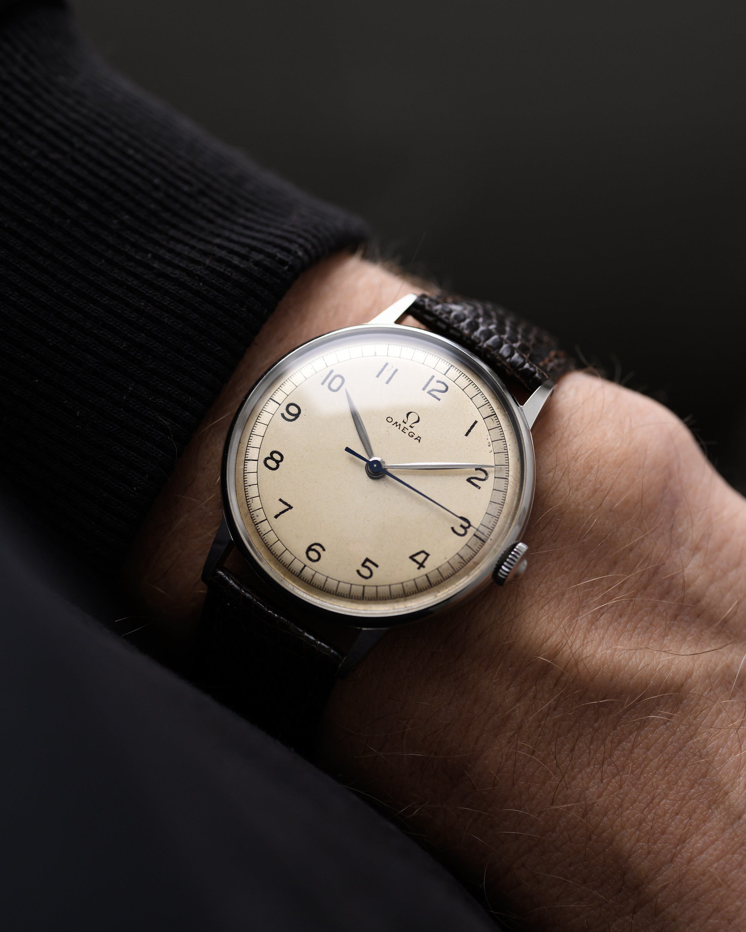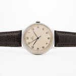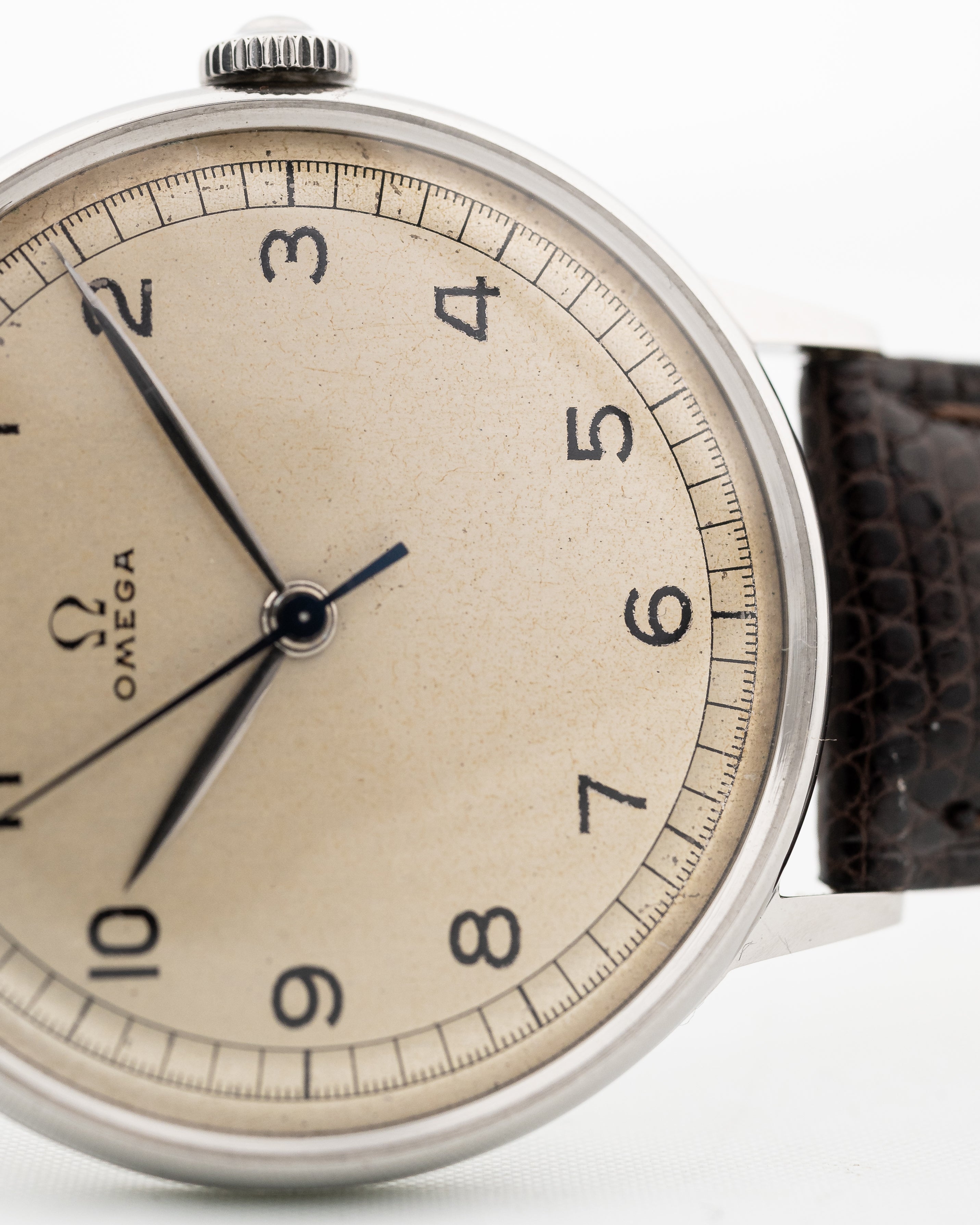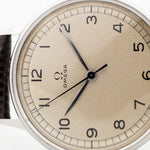 Questo bellissimo Omega con cassa Jumbo e quadrante Railroad ha tutto ciò che si desidera in un orologio da sera: Cassa Jumbo in acciaio inossidabile da 37,5 mm, secondi centrali azzurrati, un bellissimo quadrante Railroad color crema con numeri romani e lancette a foglia in acciaio inossidabile, uff!