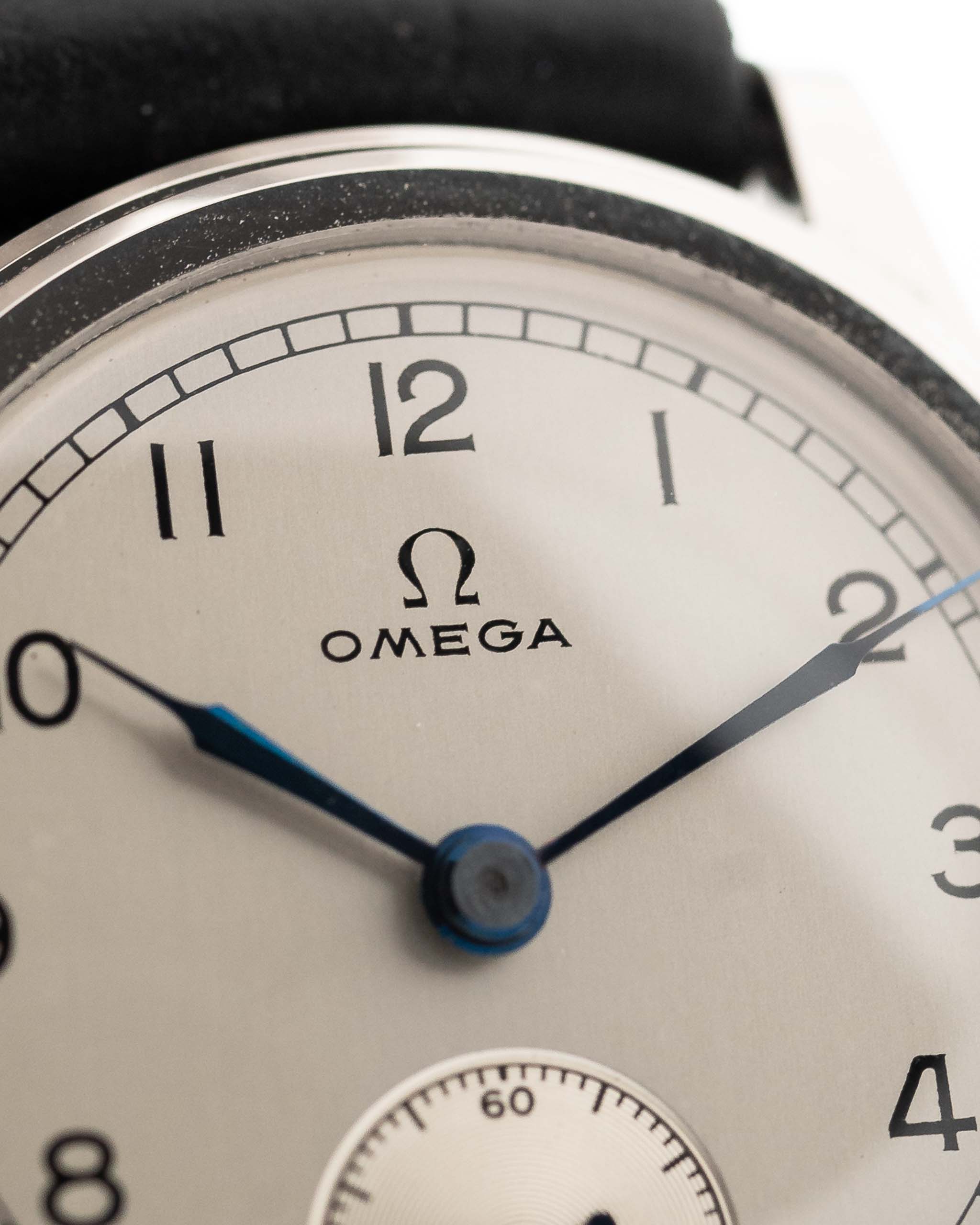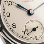 Un altro raro reperto Omega degli anni '30 in condizioni incredibili. Quadrante argento pulito, numeri arabi, lancette a siringa in acciaio azzurrato e secondi secondari alle sei - una composizione di eleganza.