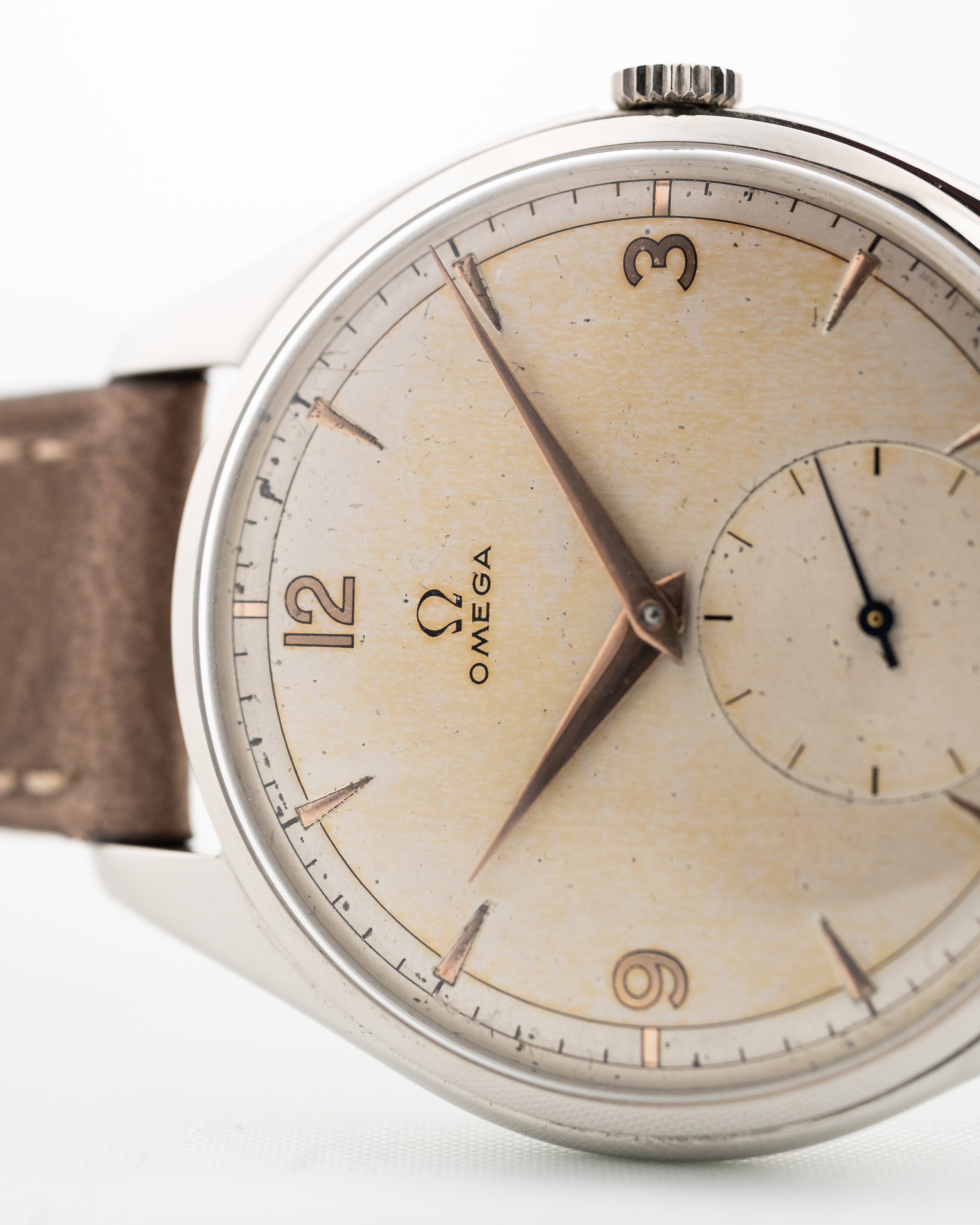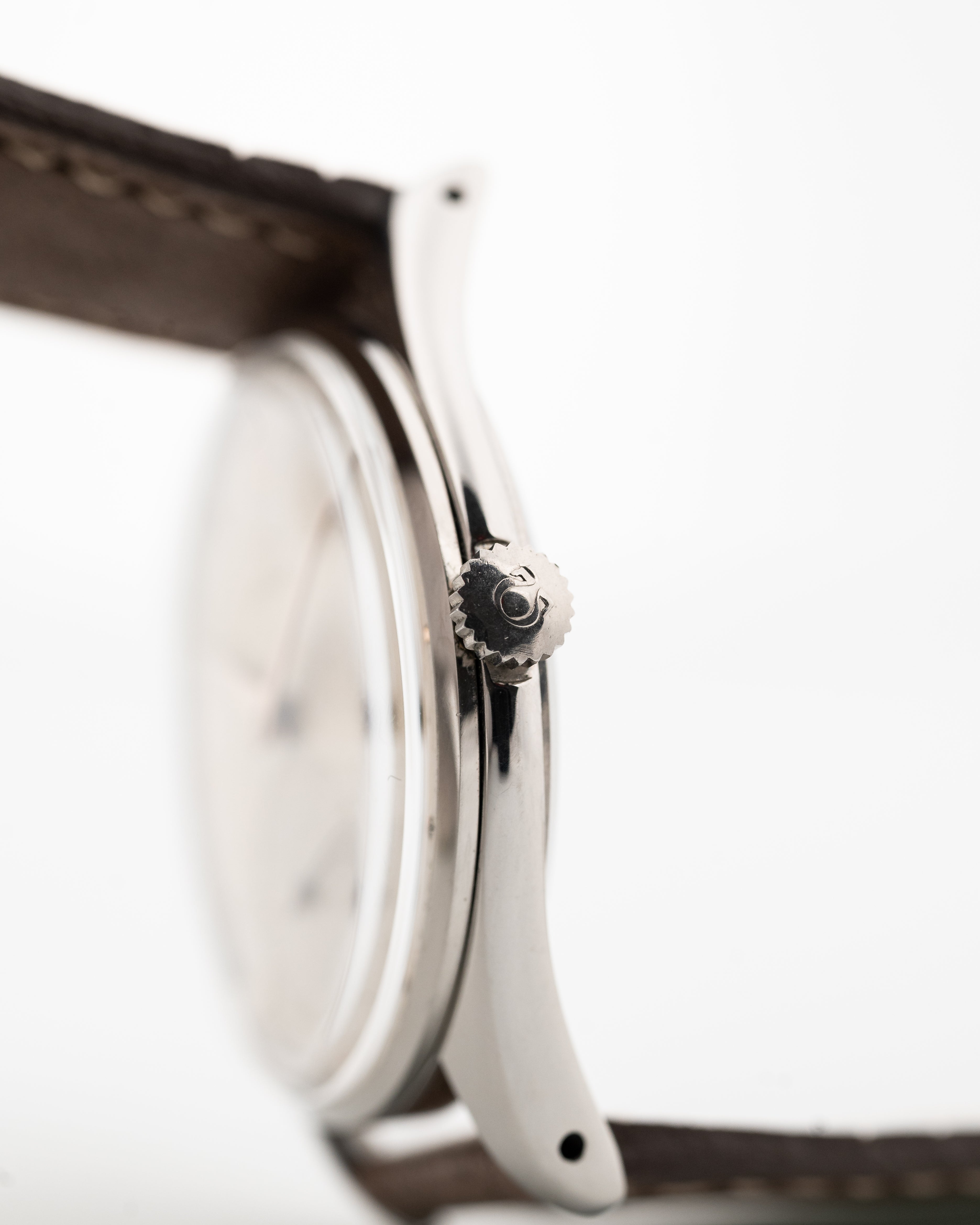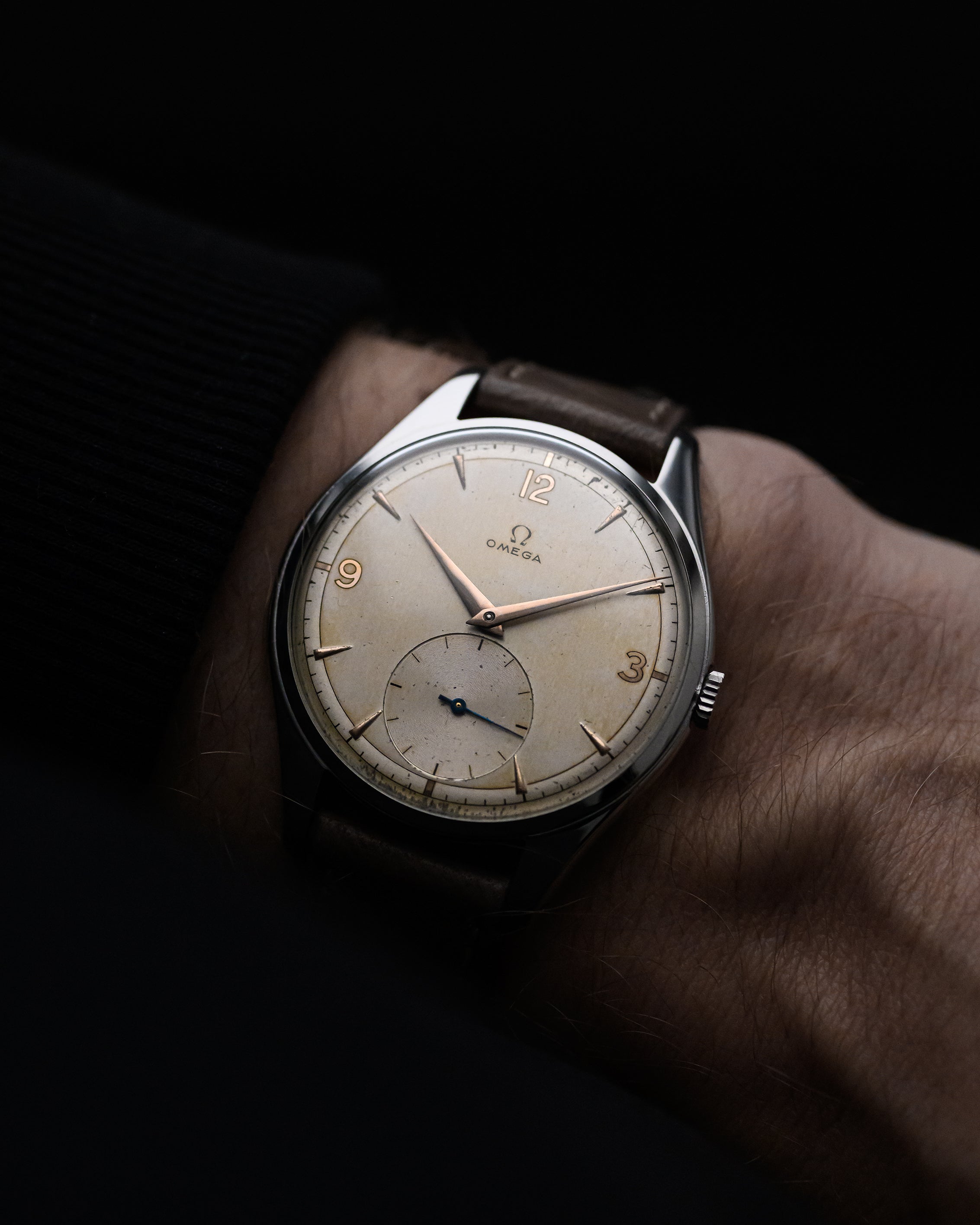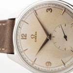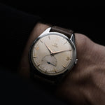 Gli anni '50 sono stati un buon periodo per Omega, come dimostra questo bellissimo orologio da sera. Questo esemplare non è solo bello, ma anche sostanzioso. Dotato di un'enorme cassa in acciaio da 38 mm, di anse ribaltate e di uno splendido quadrante bicolore leggero, questo orologio è davvero imbattibile.