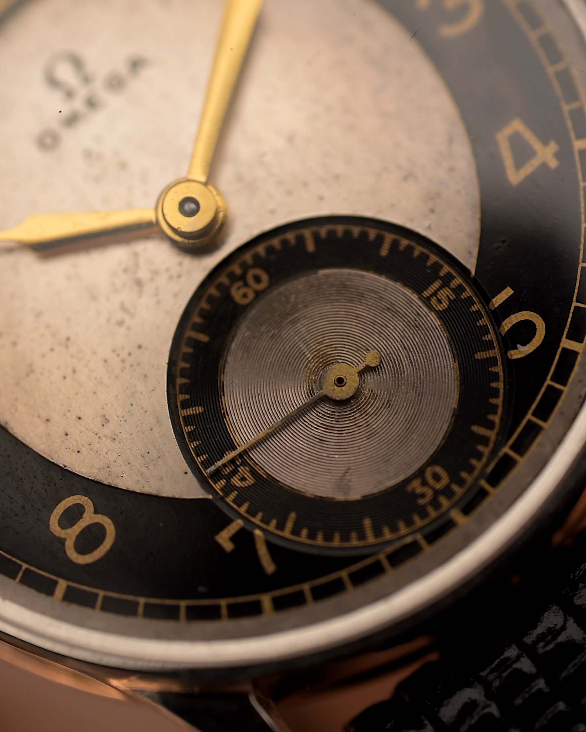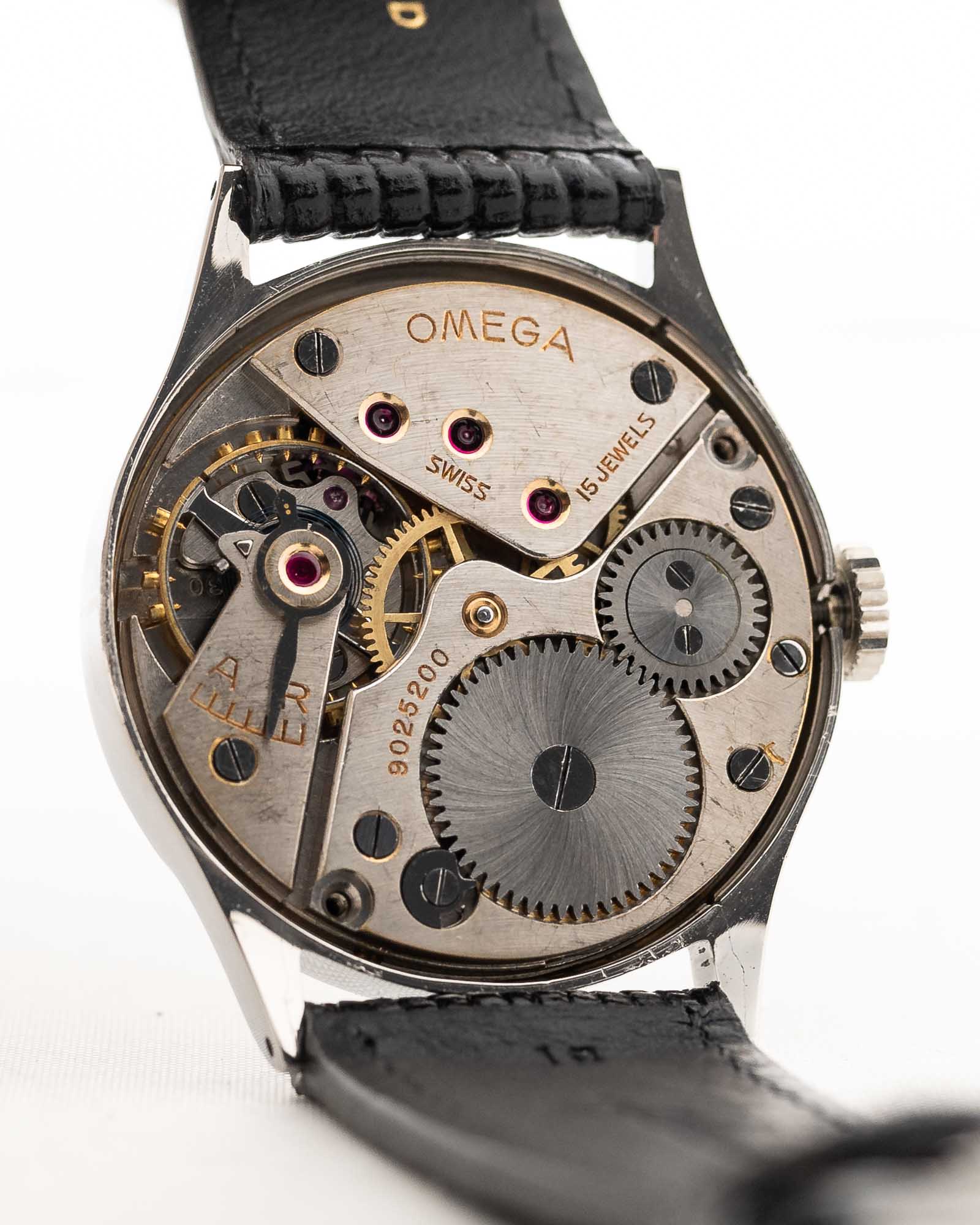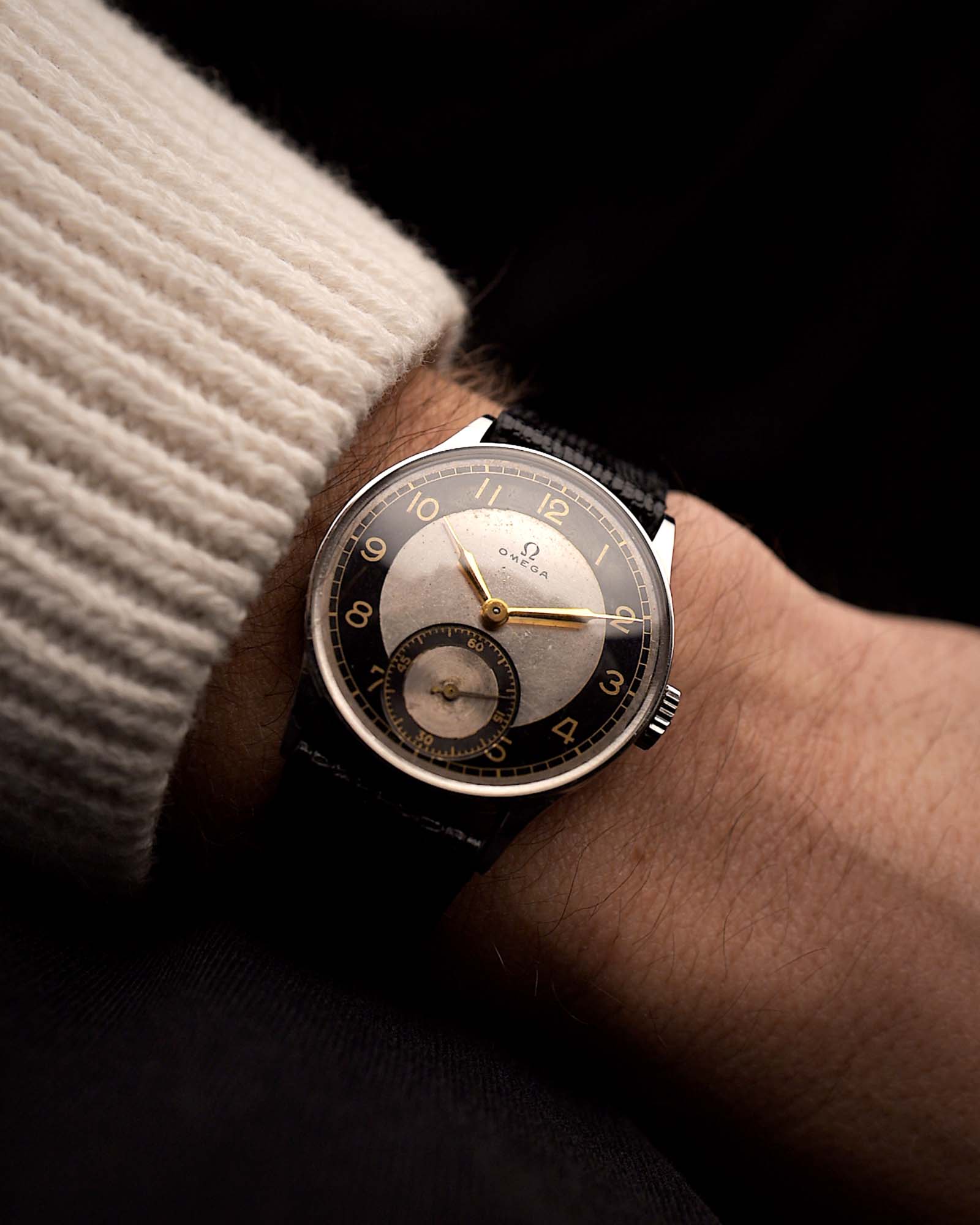 Un altro raro gioiello Omega degli anni '40, conservato in condizioni eccezionali. Il quadrante bicolore argento e nero "tuxedo" presenta numeri arabi, minuteria ferroviaria ed eleganti lancette dorate a siringa: una composizione splendidamente equilibrata del design Omega dei primi anni.