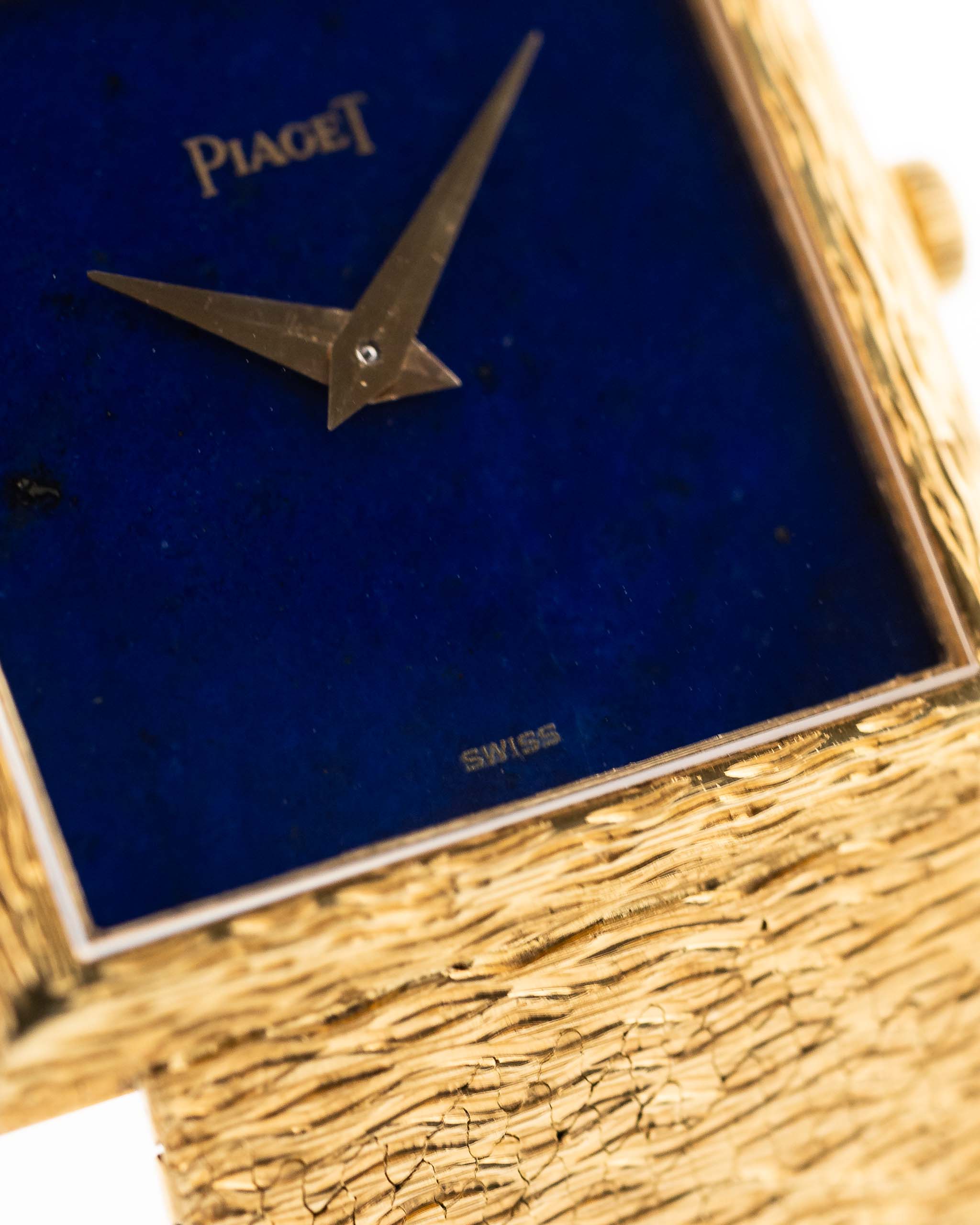 La sua sottigliezza non era solo un risultato tecnico, ma consentiva anche alla manifattura di montare quadranti in pietre dure, mantenendo un profilo sottile, come questo impeccabile quadrante Piaget 18k con pietra Lapislazzuli.