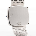 Il nostro pezzo si presenta in condizioni fantastiche, con uno splendido bracciale Piaget integrato in oro bianco 18 carati, il quadrante bianco con numeri romani e lancette a foglia bluastre è in condizioni impeccabili. L'aspetto generale, con la forma quadrata della cassa e il design senza anse, è un pezzo d'arte.