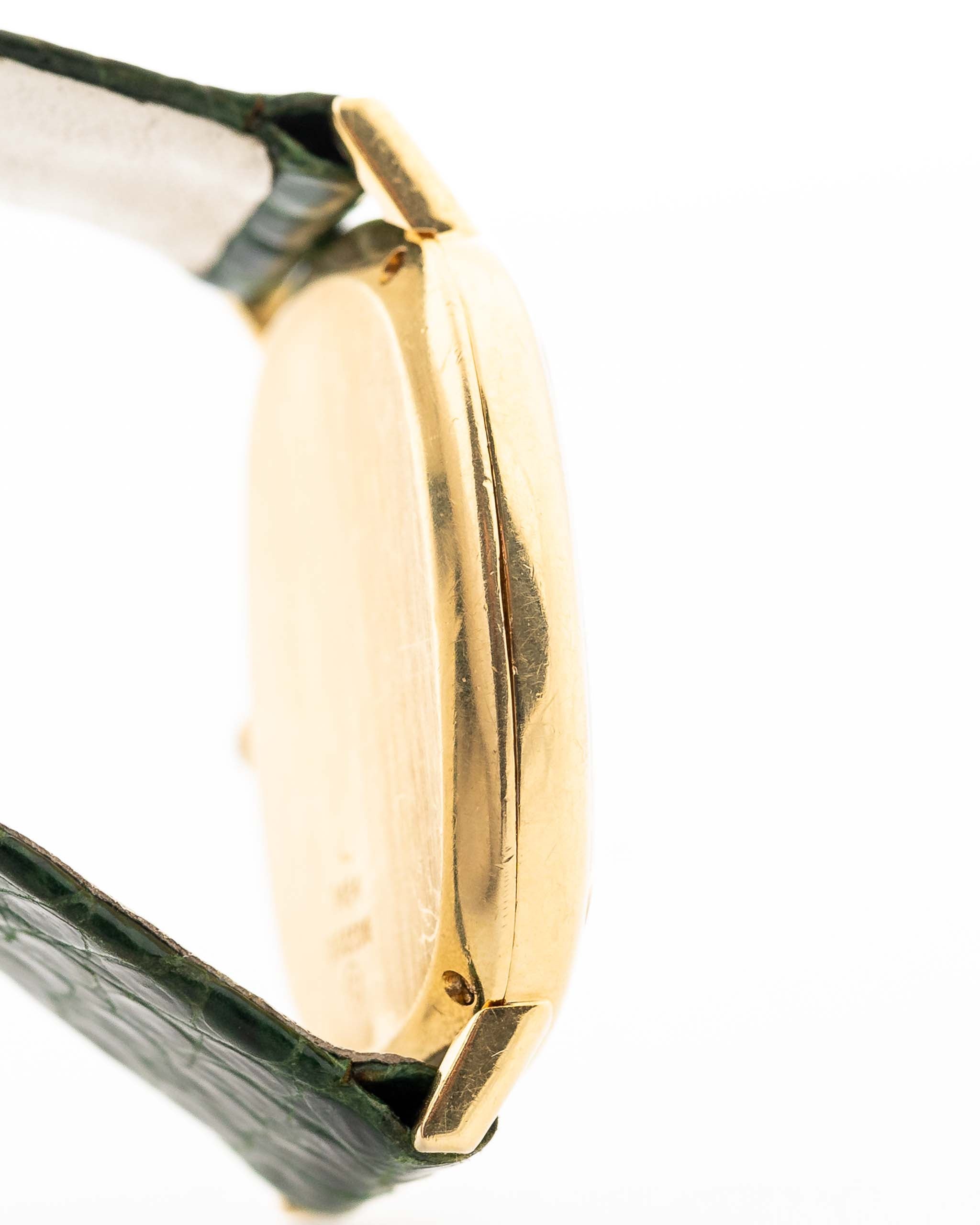 La sua sottigliezza non era solo un risultato tecnico, ma consentiva anche alla manifattura di montare quadranti in pietre dure, mantenendo un profilo sottile, come questo impeccabile Piaget 18k con un bellissimo quadrante in pietra verde giada.
