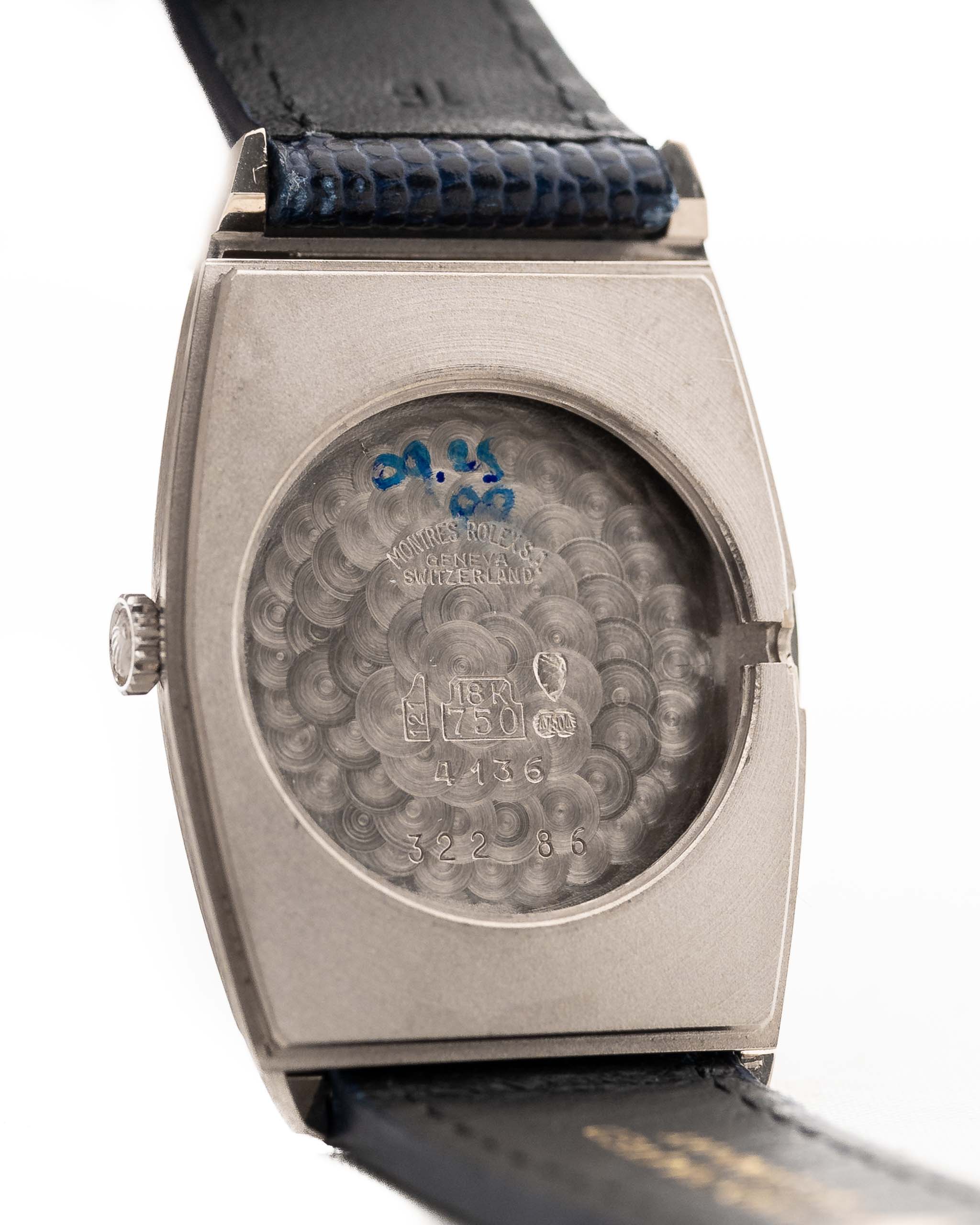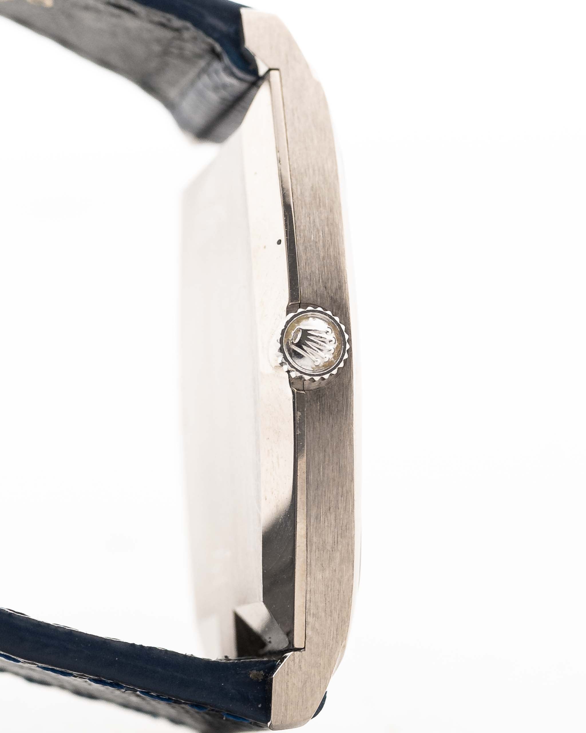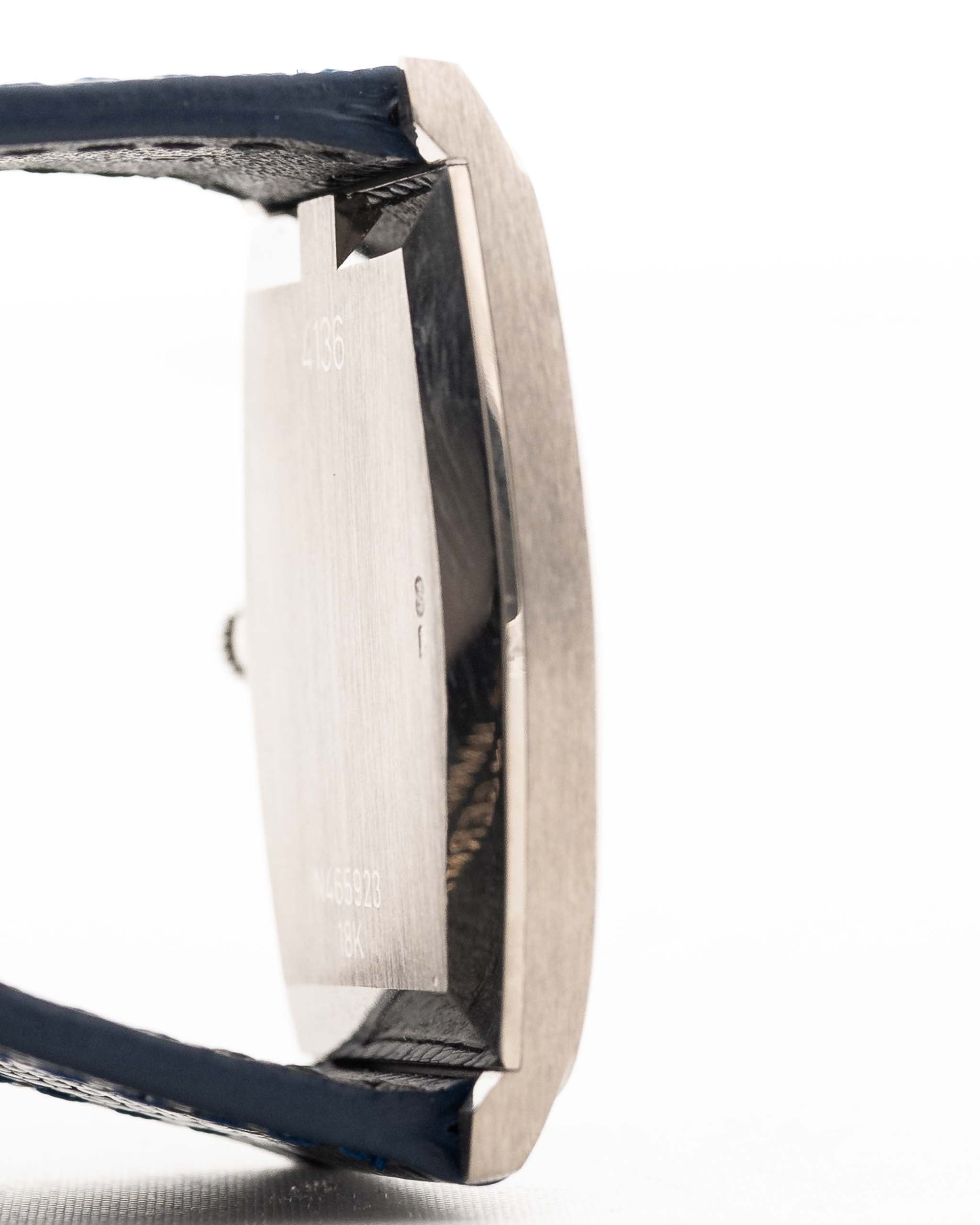 Questo modello Ref. 4136 del 1991 incarna perfettamente tale filosofia. Lasua cassa rettangolare in oro bianco 18 caratiincornicia un quadrante blu intenso che rimane intatto, creando un suggestivo contrasto con le lancette e gli indici applicati. Il design minimalista è impreziosito dalla caratteristica corona Rolex a ore 12.