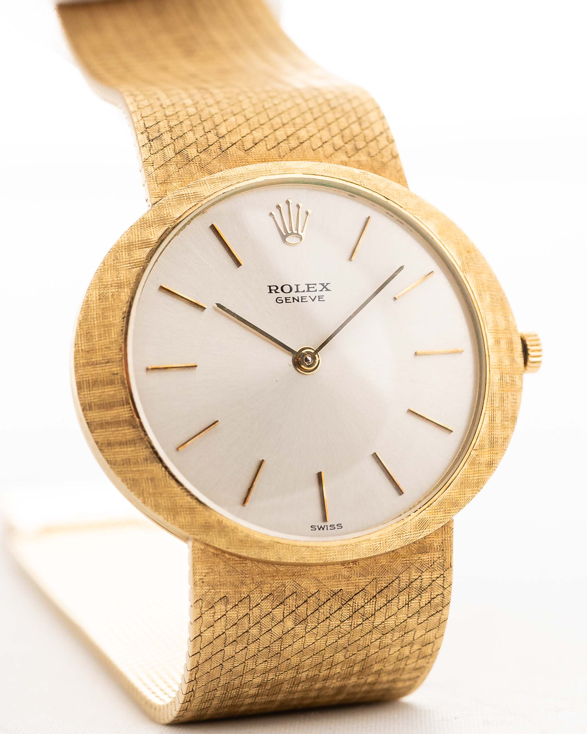 Rolex è noto per i suoi leggendari modelli sportivi. Questo Rolex Geneve (Pre Cellini) mette in mostra il lato più elegante di Rolex ed è dotato di una cassa a forma di ellisse in oro giallo 18k, una forma insolita per Rolex.