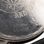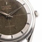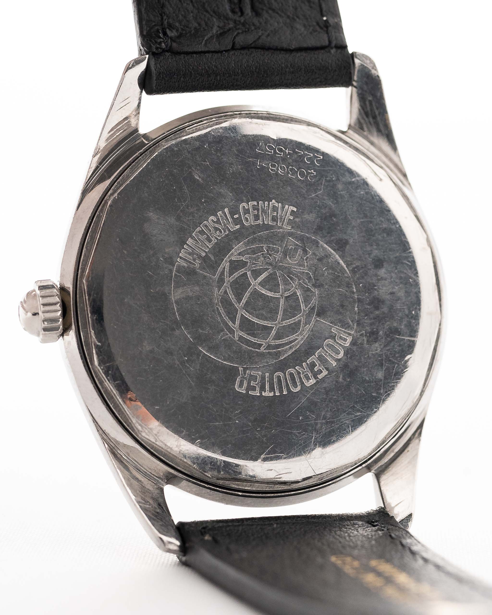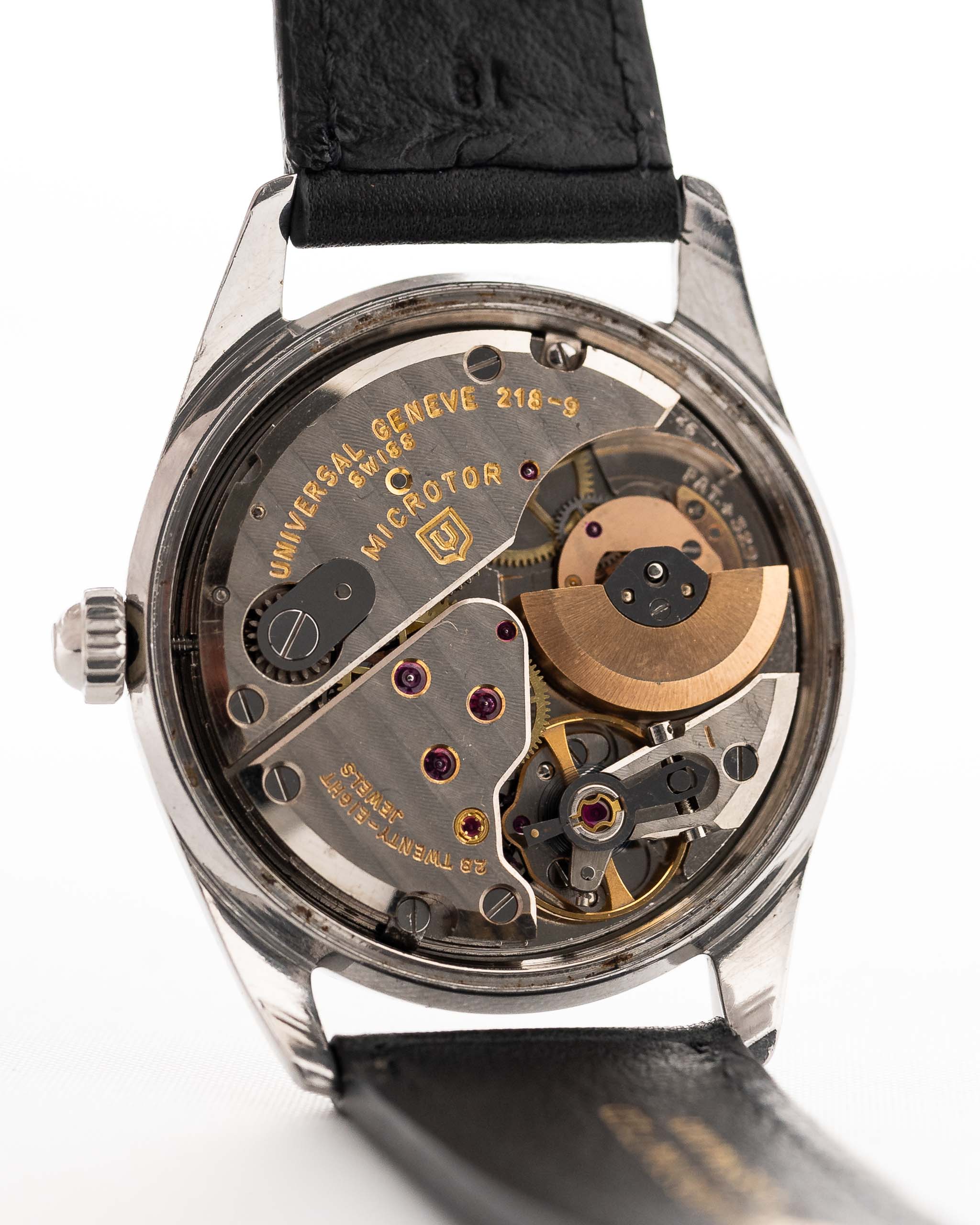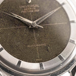 Universal Genève 20368 Polerouter Ref 20368 degli anni '60. 34 mm in acciaio inossidabile, movimento automatico a microtor, quadrante nero originale con patina e cinturino in pelle.