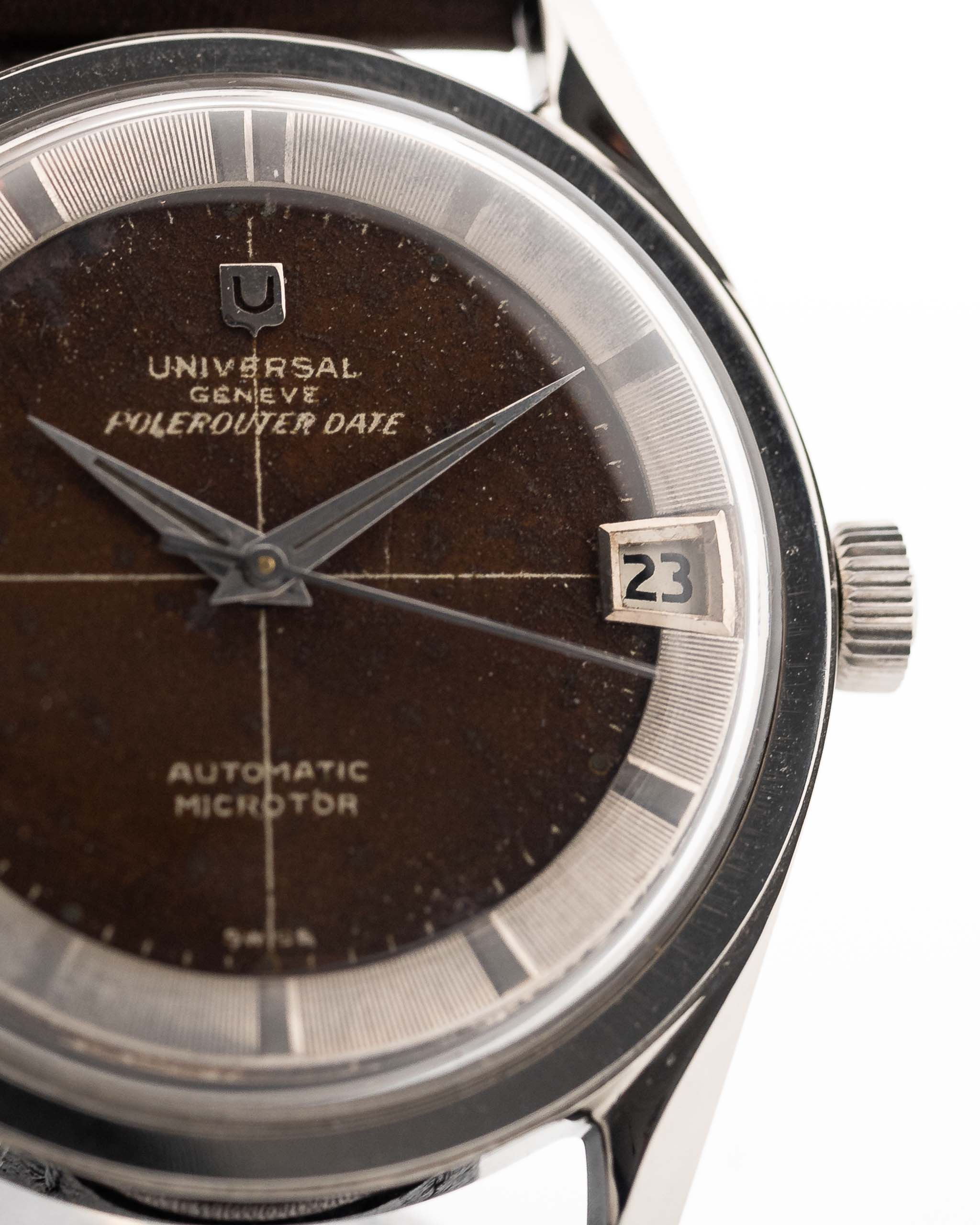 Our example, powered by the legendary Microtor Caliber 215, captures everything that makes the Polerouter iconic: technical elegance, aviation heritage, and bold design. The dial has aged beautifully into a warm tropical brown, adding stunning depth to the crosshair layout and steel chapter ring. It’s a watch that feels alive with history.