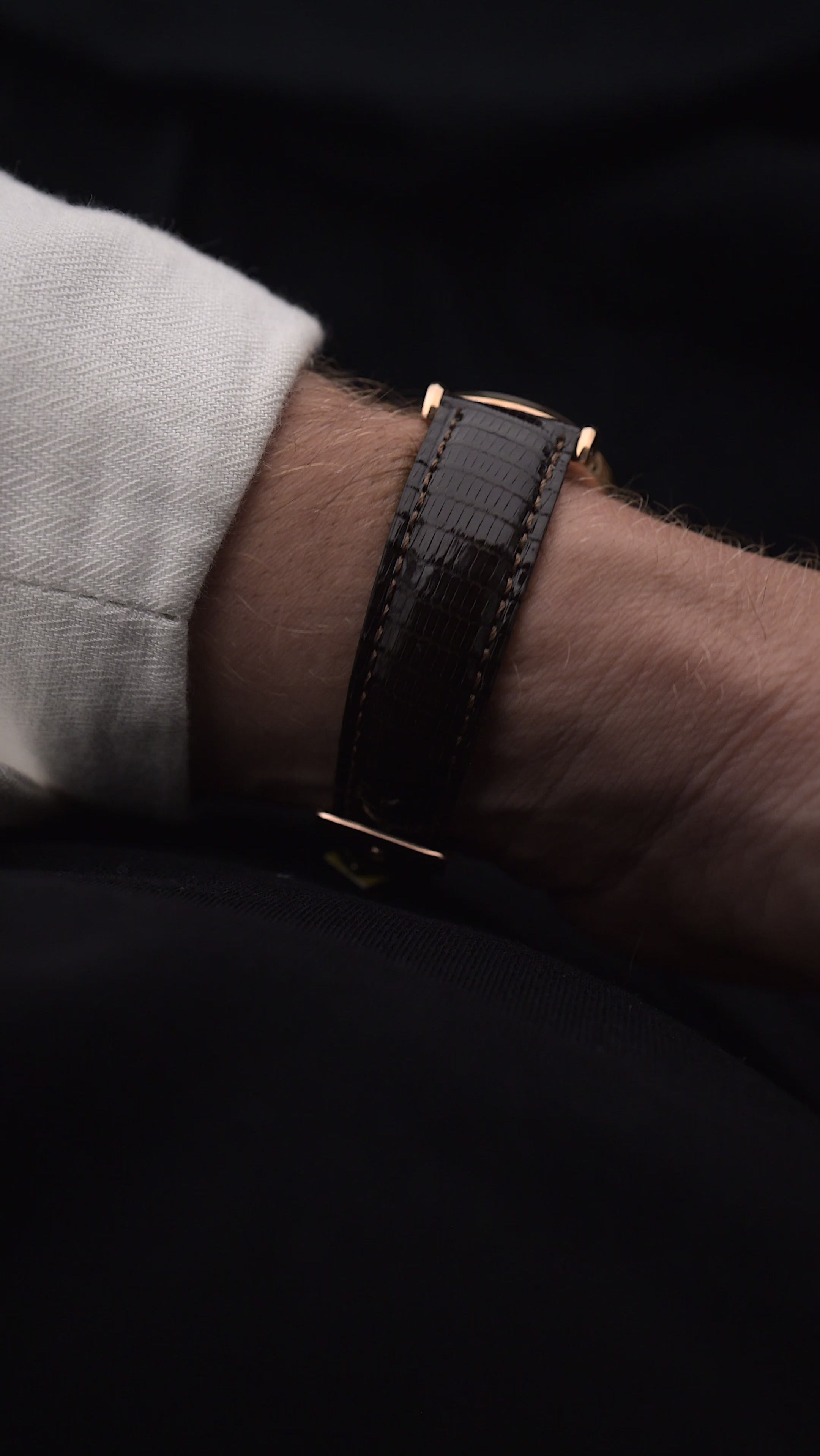 Presenta una cassa da 34 mm in oro rosa 18 carati con anse Bombé ribaltate ed è molto difficile trovarle in queste condizioni originali.