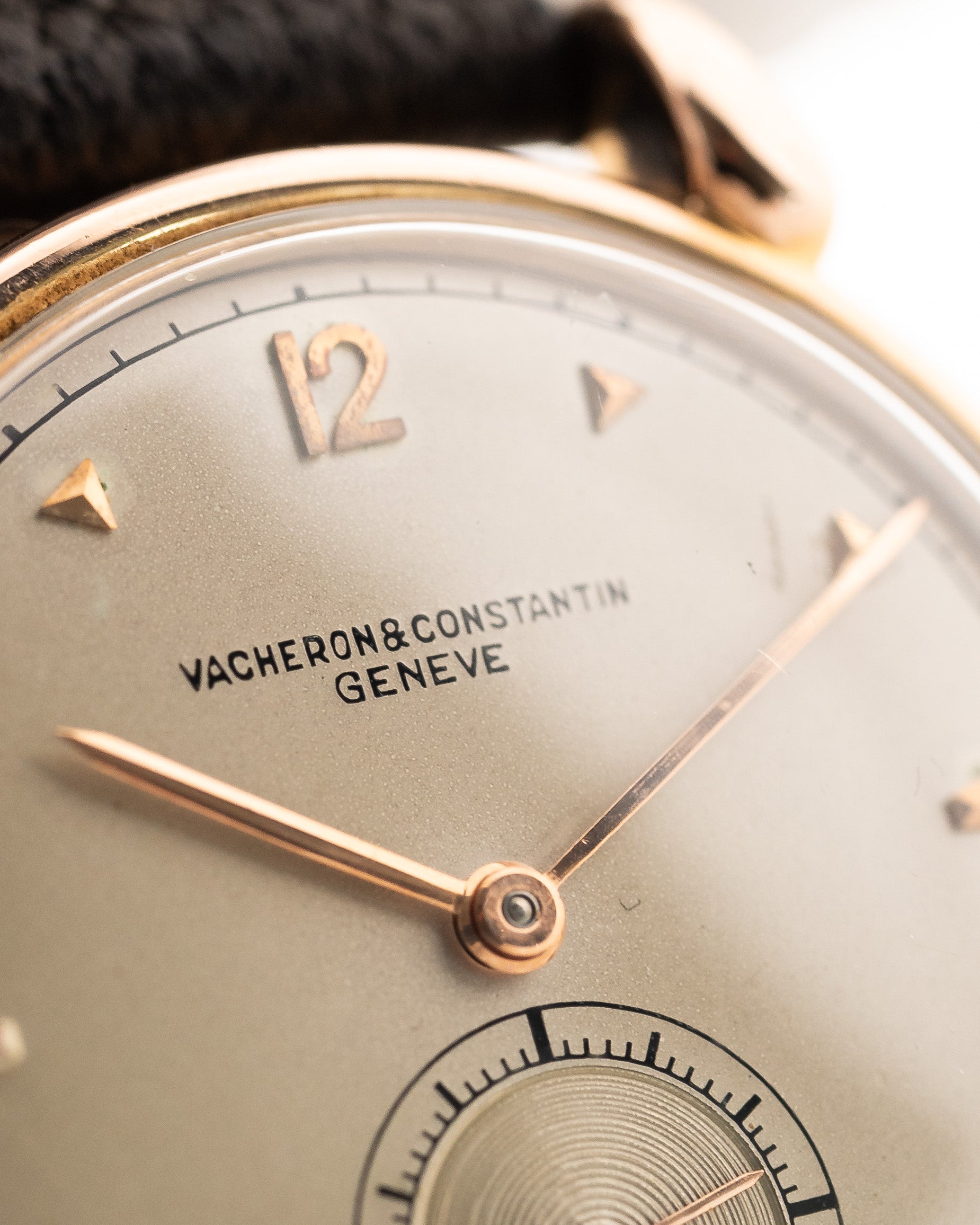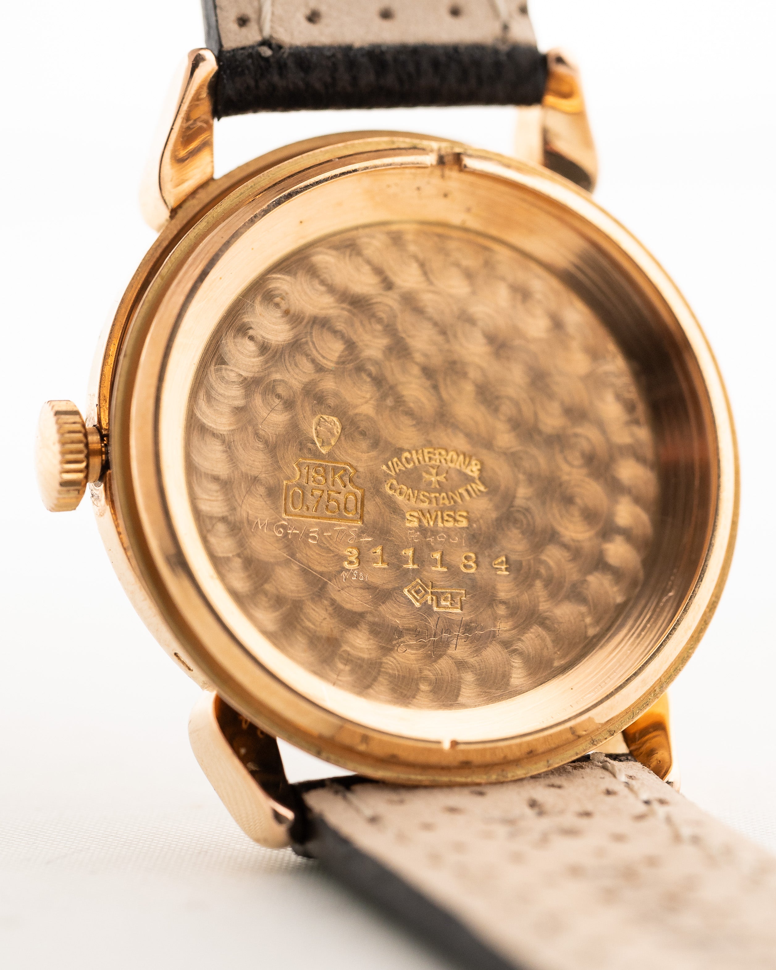 Qui abbiamo un bellissimo esempio di Vacheron Constantin solo tempo, 33 mm in oro rosa 18k con cassa Gerlach 18k Tear Drop degli anni Quaranta.