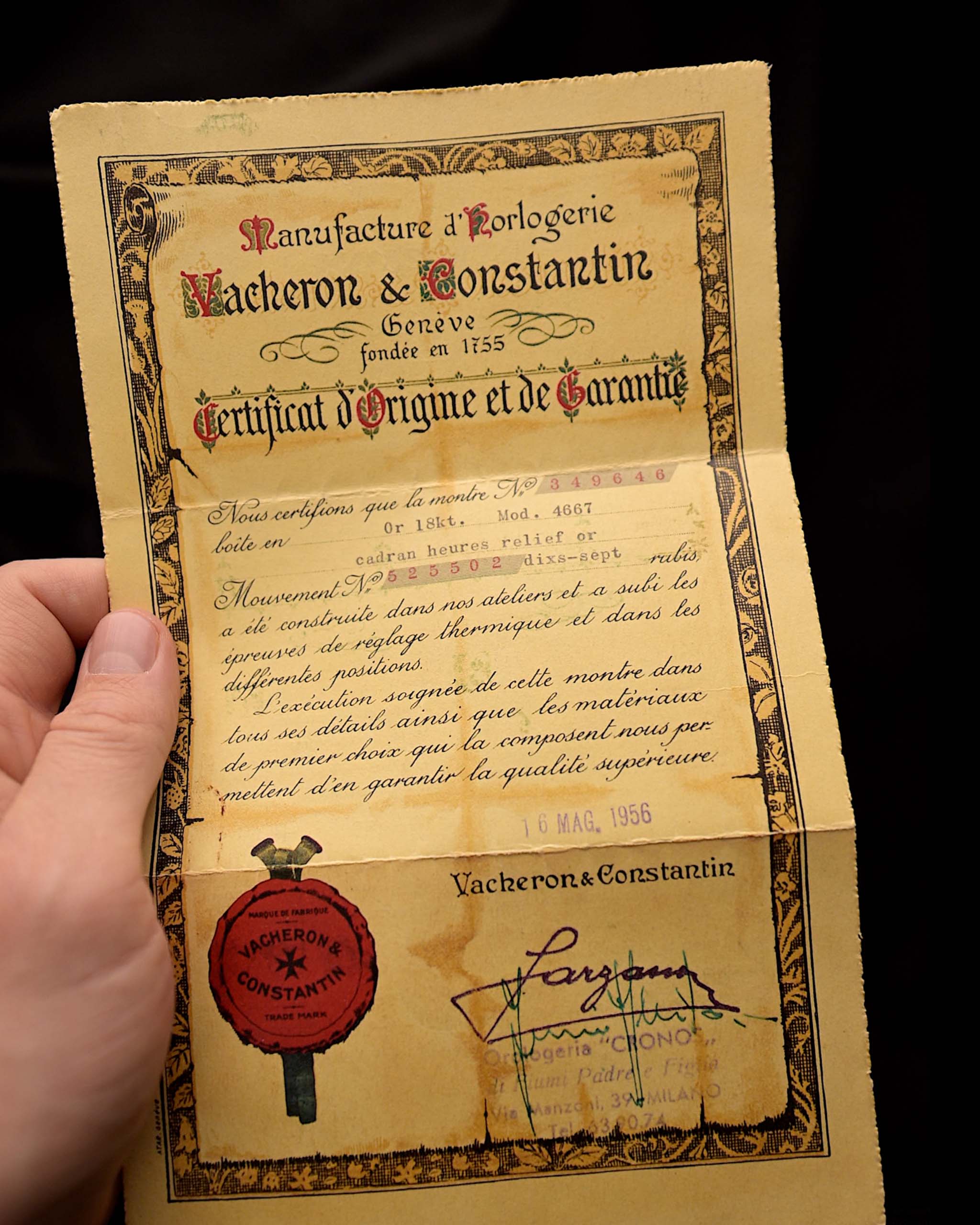 • Viene fornito con il certificato originale di Vacheron Constantin del 1956 a Milano.