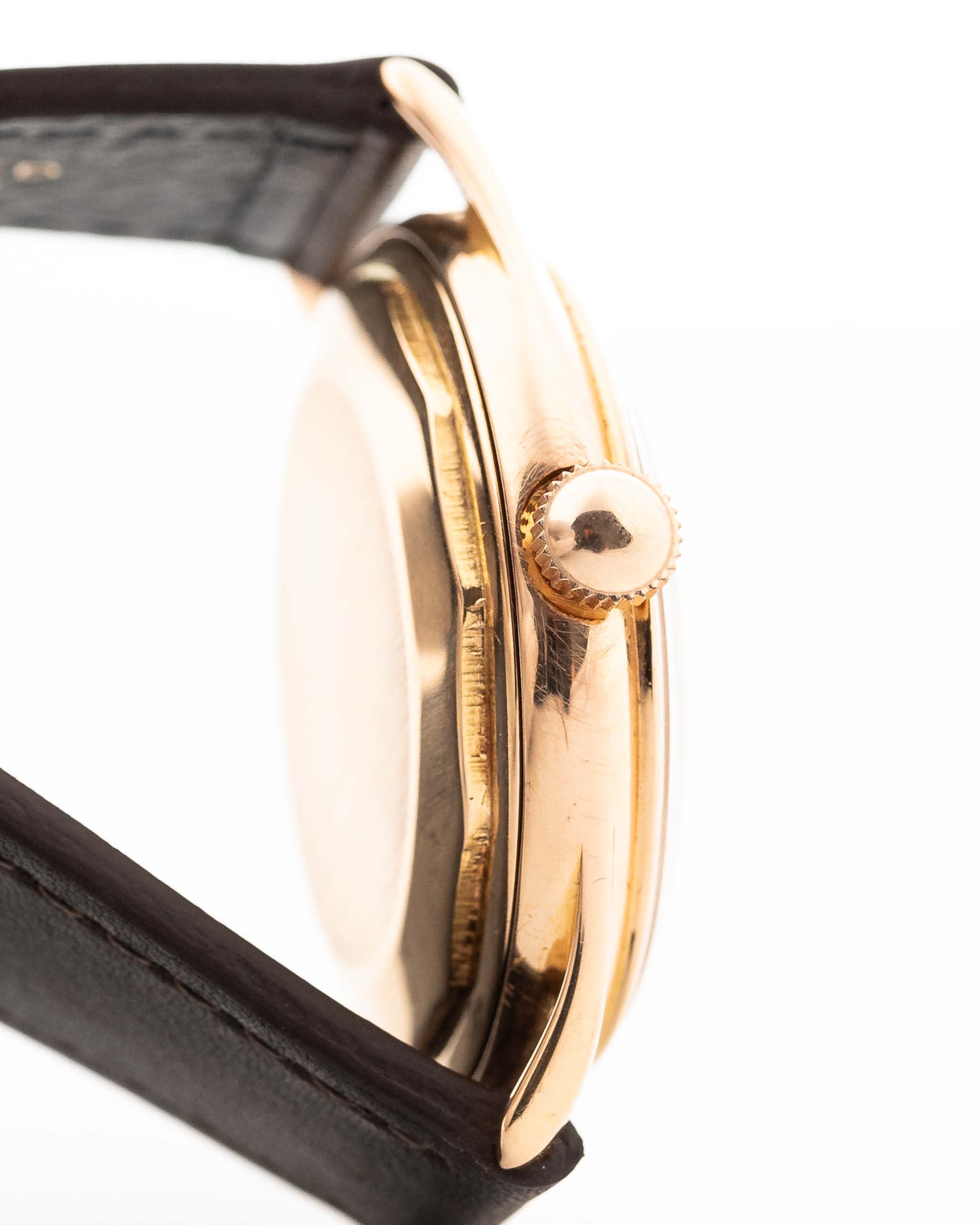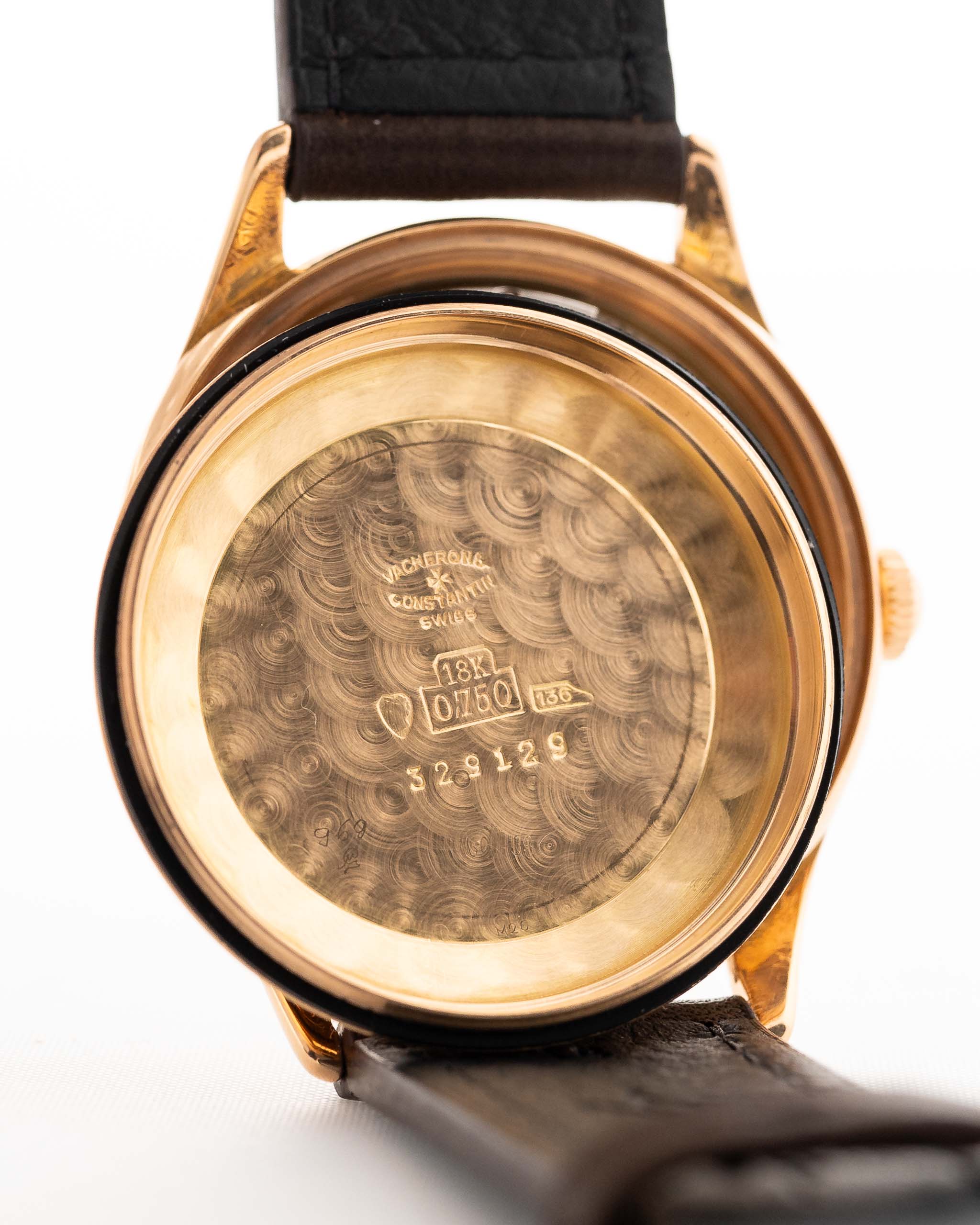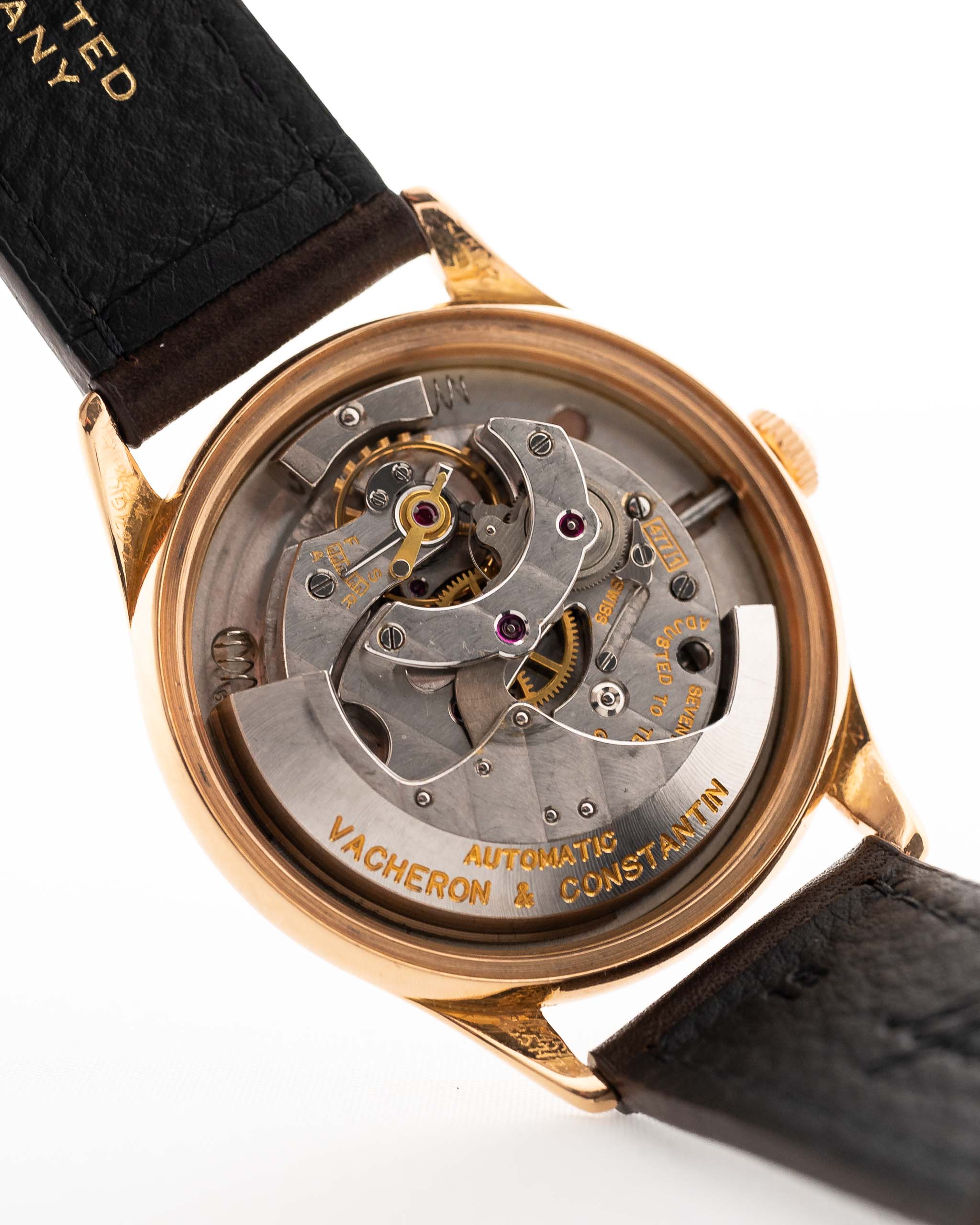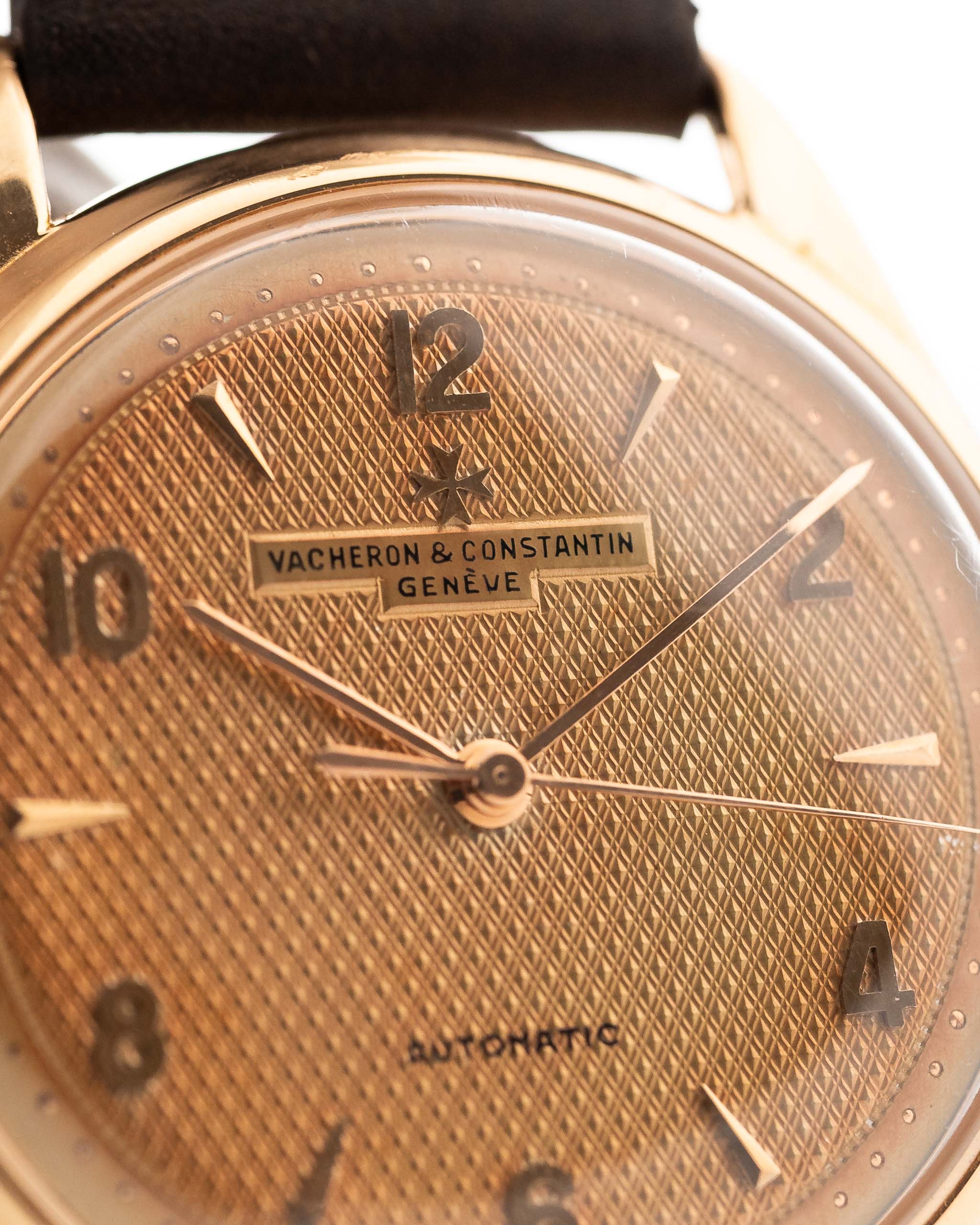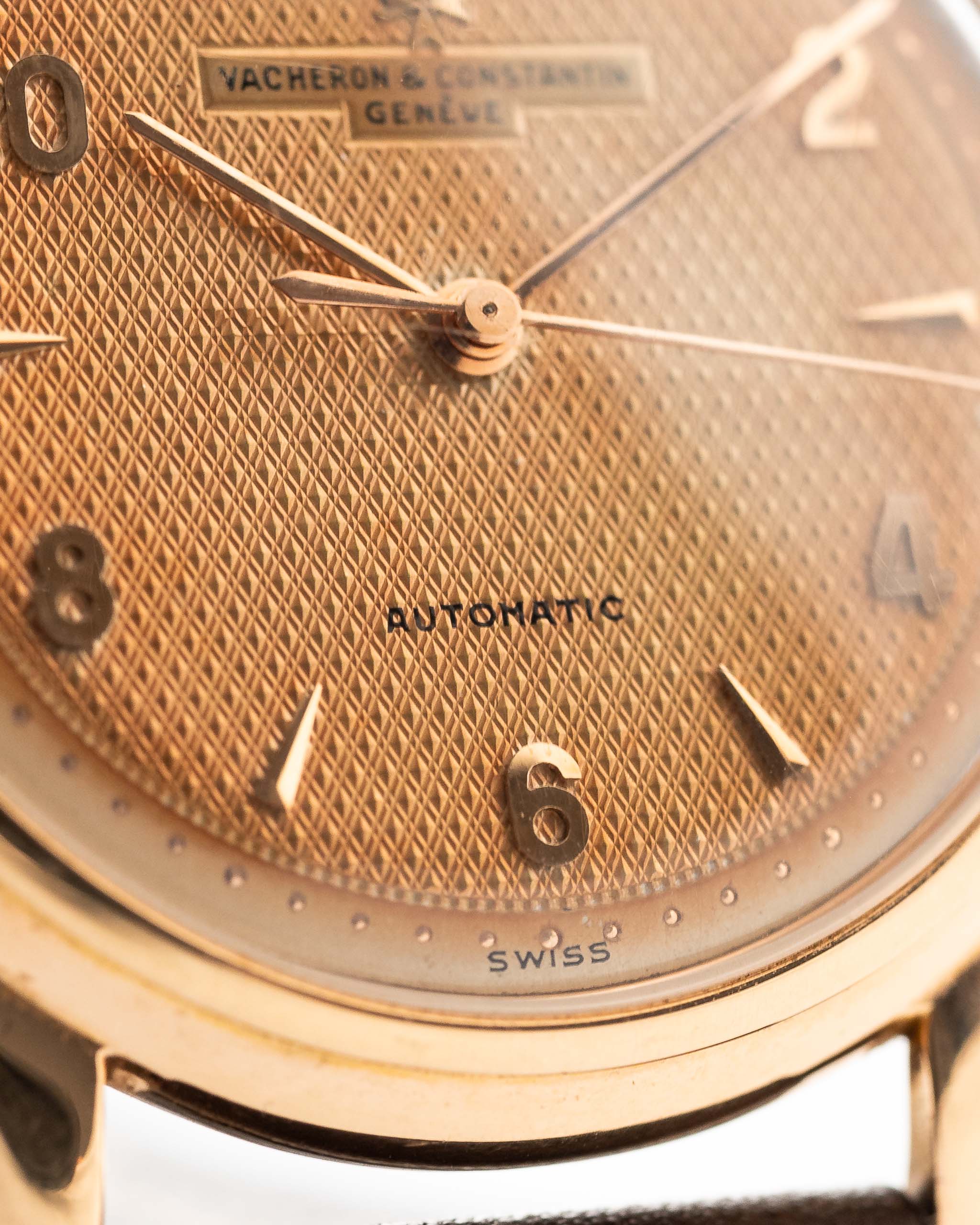 Qui abbiamo un rarissimo orologio Vacheron Constantin degli anni Cinquanta, splendidamente rifinito, con una cassa in oro rosa 18 carati e un quadrante Guilloché dal design sorprendente, con una disposizione armoniosa e una splendida patina calda.