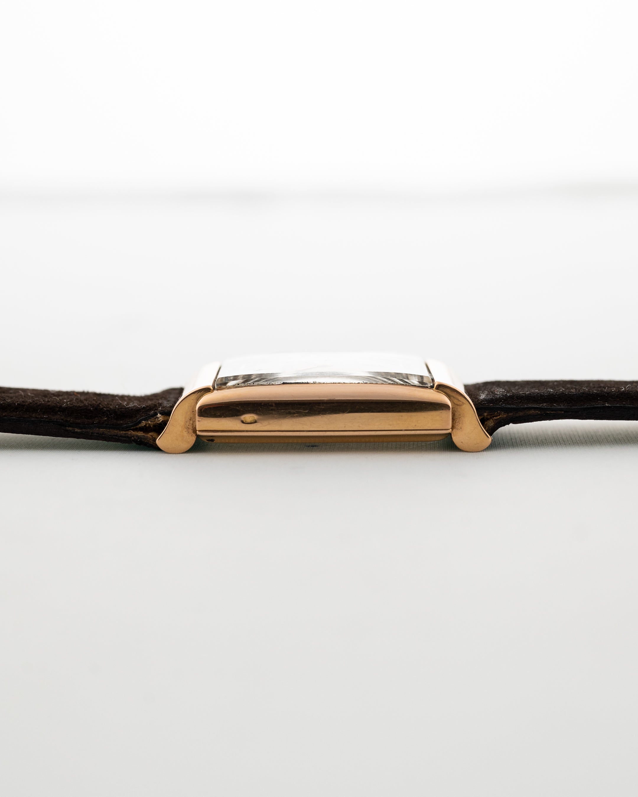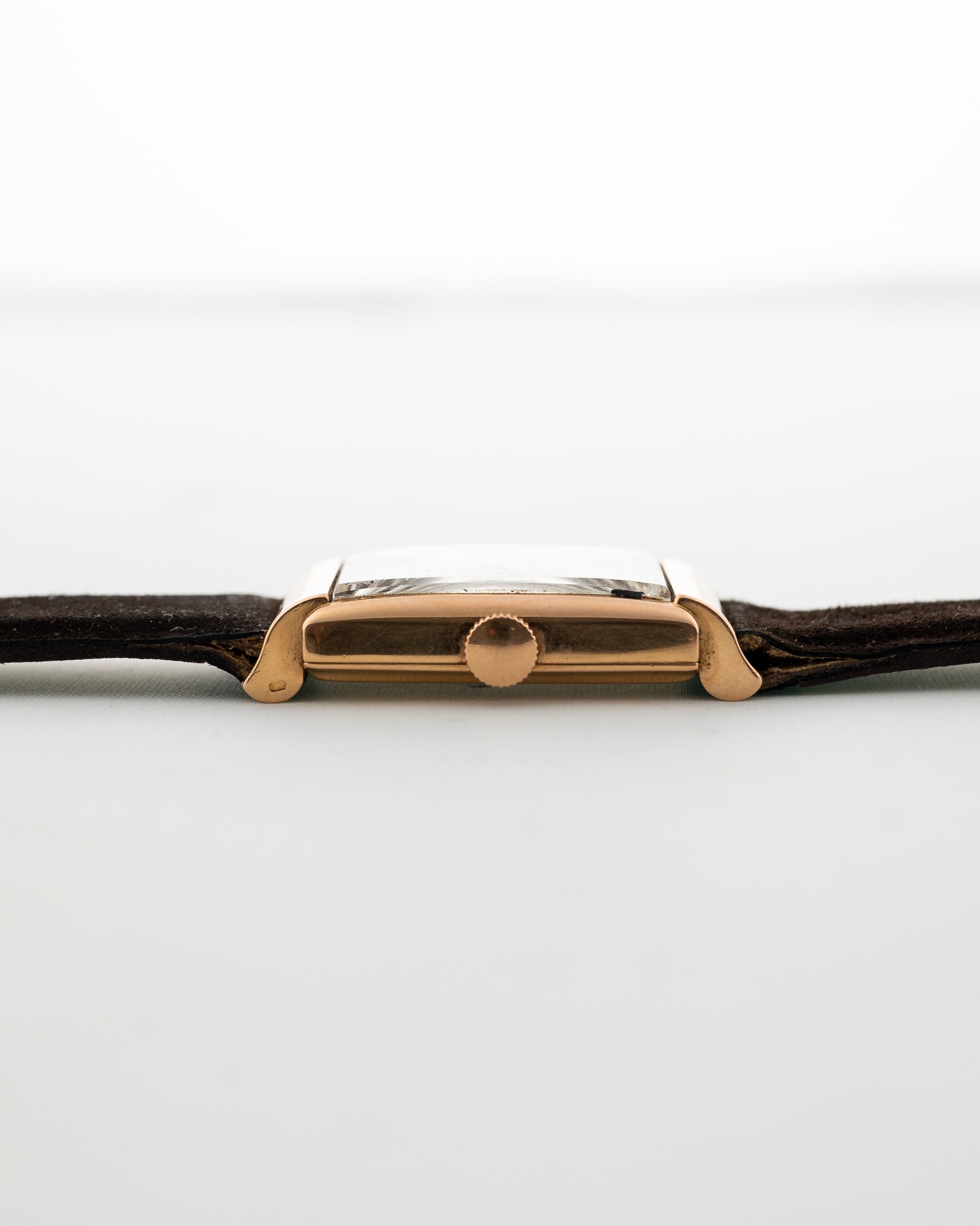 Questo pezzo in particolare si distingue per le sue splendide condizioni, il quadrante leggermente bicolore in argento e la robusta cassa in oro rosa 18 carati, che veste piuttosto grande a causa delle dimensioni maggiori da ansa a ansa.