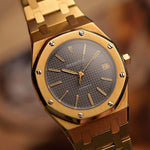 Our 1980 example, the 4100BA, is the full 18k yellow gold version and comes in absolutely stunning condition. The grey petit-tapisserie dial, produced by Stern Frères, is a work of art — bearing all the rich texture and timeless charm that defines early Royal Oaks.