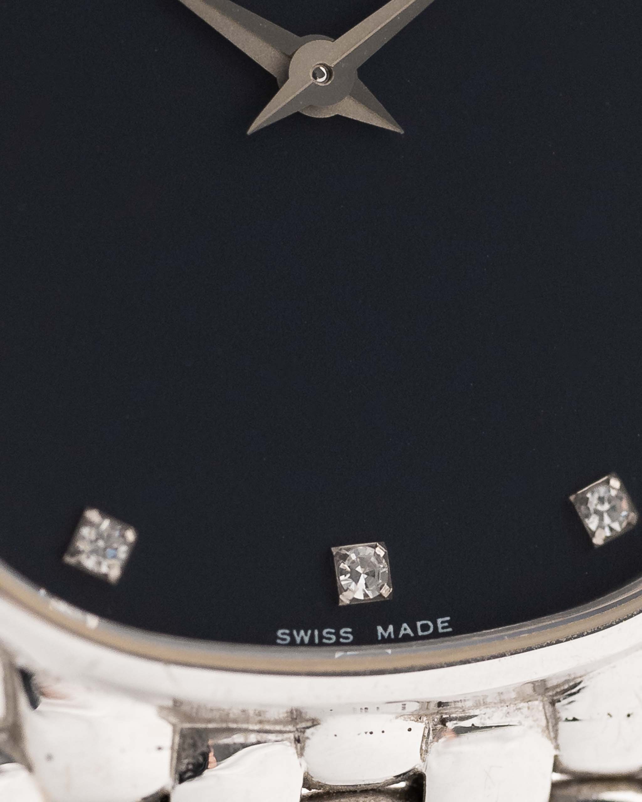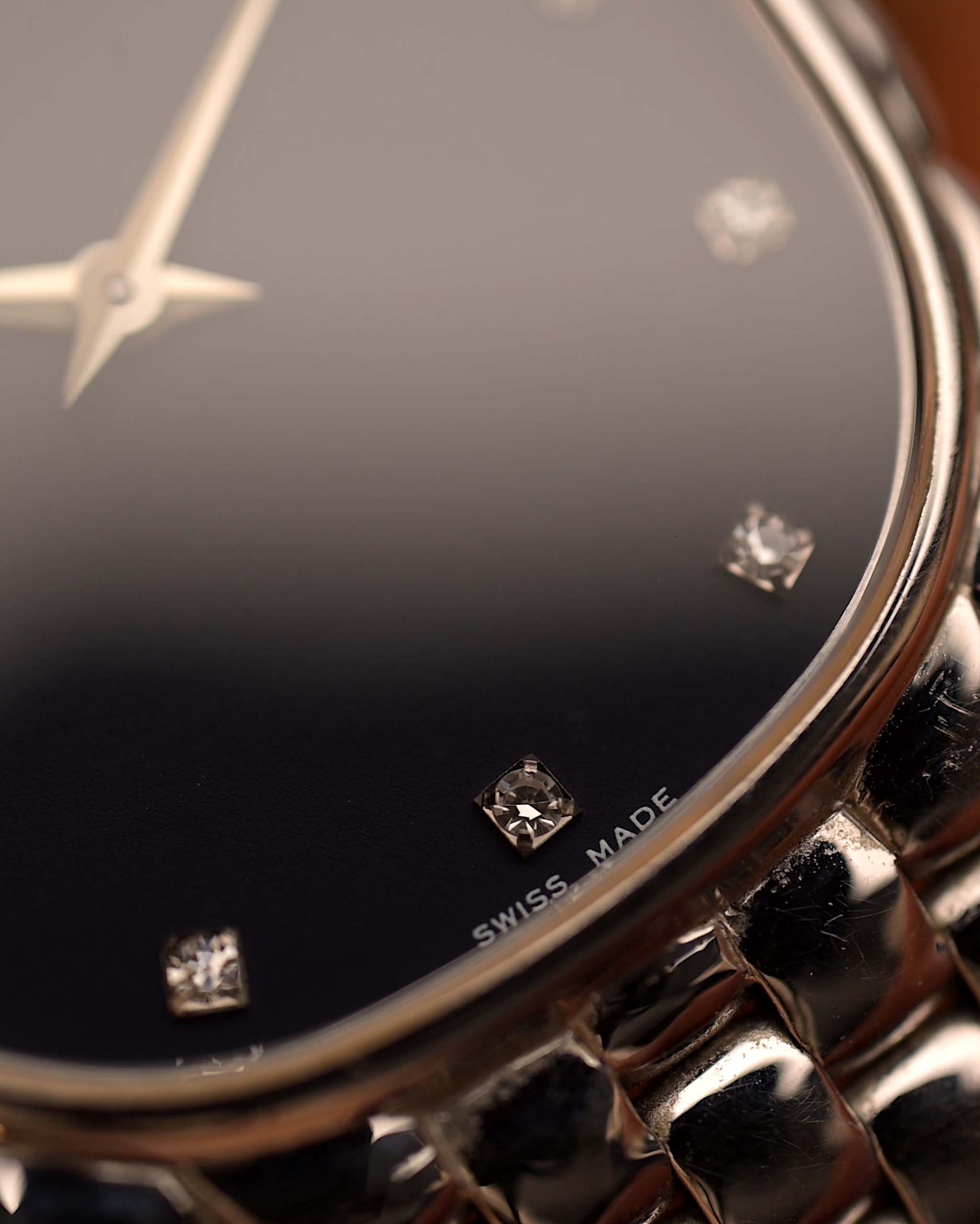 La cassa da 29 mm in oro bianco 18 carati è abbinata a un bracciale integrato in oro meticolosamente rifinito a mano, che conferisce all'orologio la sua caratteristica fluidità serpentina - una forma che sembra scivolare senza sforzo sul polso. Il quadrante blu notte, che brilla sotto diverse angolazioni di luce, è ornato da 11 indici di diamanti incastonati in fabbrica, che aggiungono una tranquilla opulenza al suo carattere minimalista.