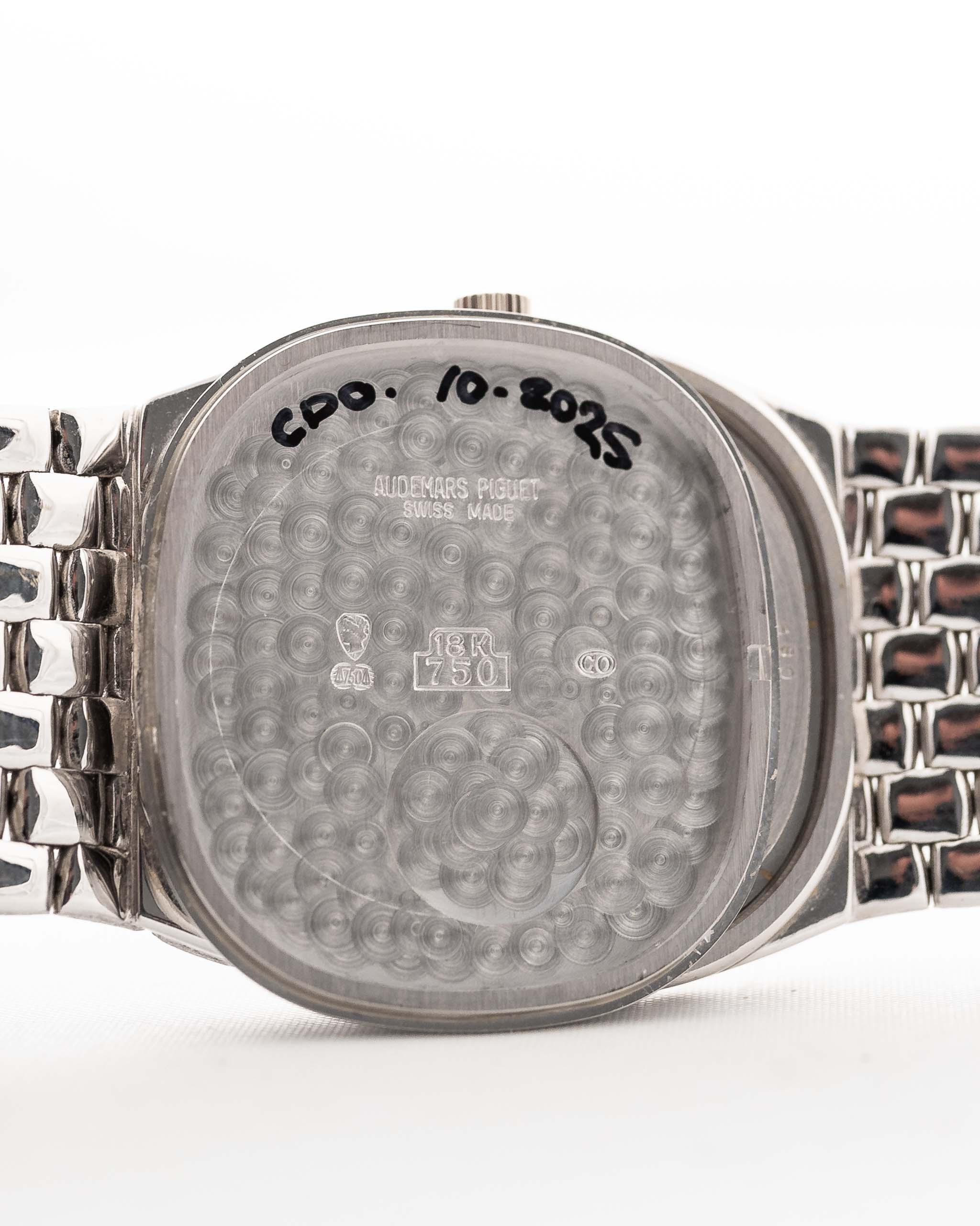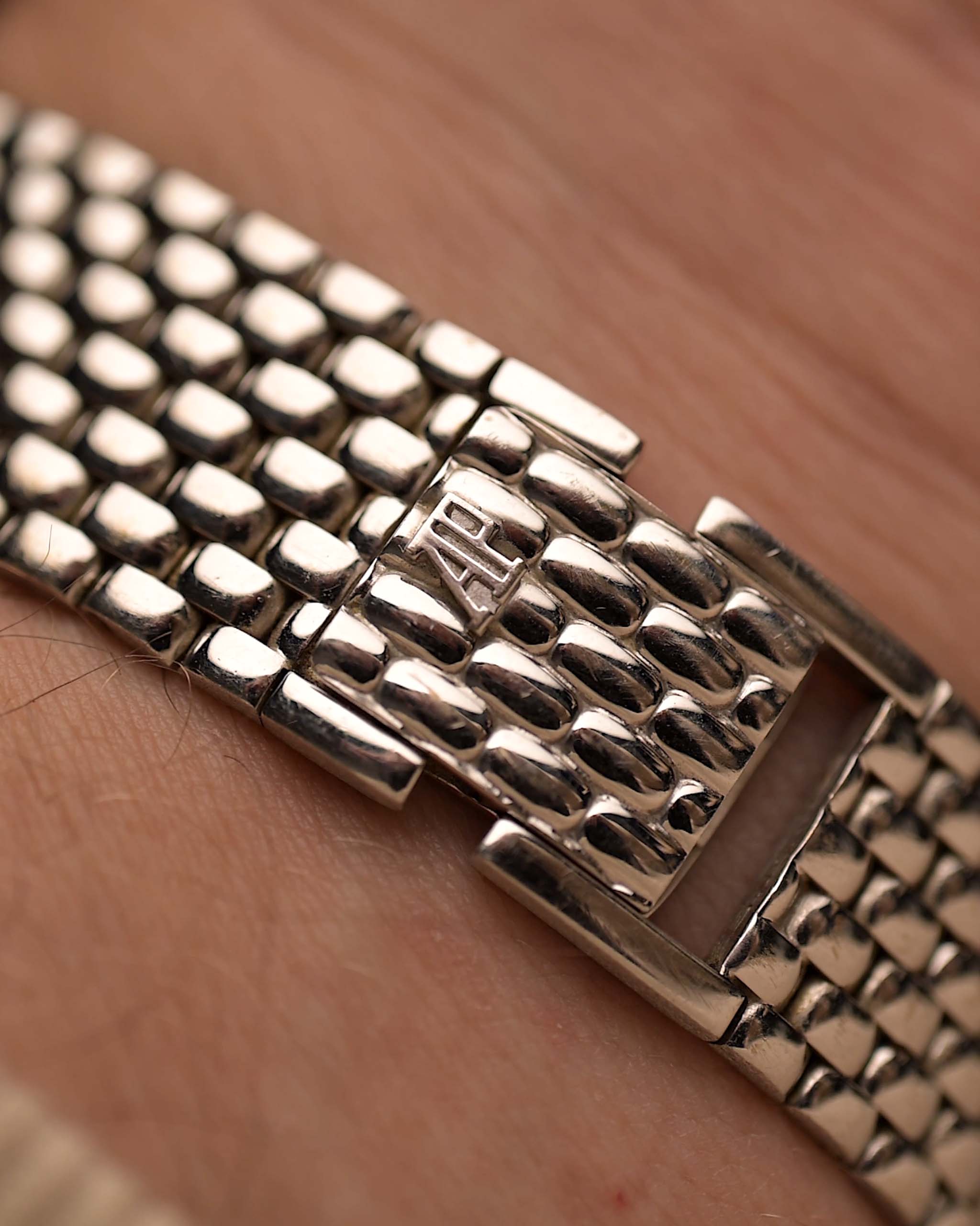 Primo piano di un orologio Audemars Piguet Cobra vintage con fondello in oro bianco 18 carati, bracciale in oro bianco, tenuto in mano con uno sfondo sfocato
