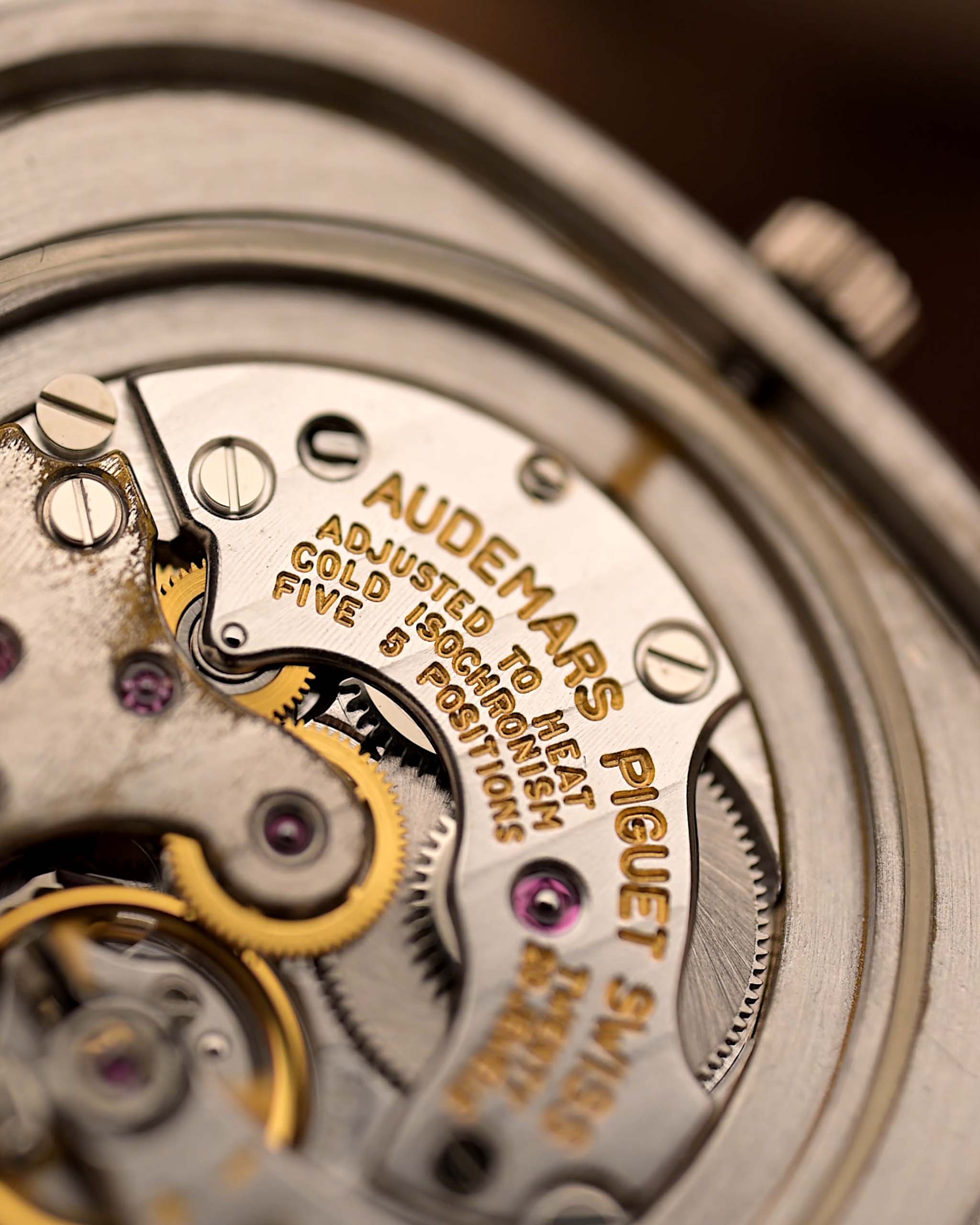 All'interno, il Calibro 2080 di Audemars Piguet, un movimento meccanico a carica manuale, offre un cronometraggio preciso in linea con le migliori tradizioni del marchio.