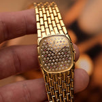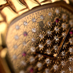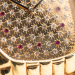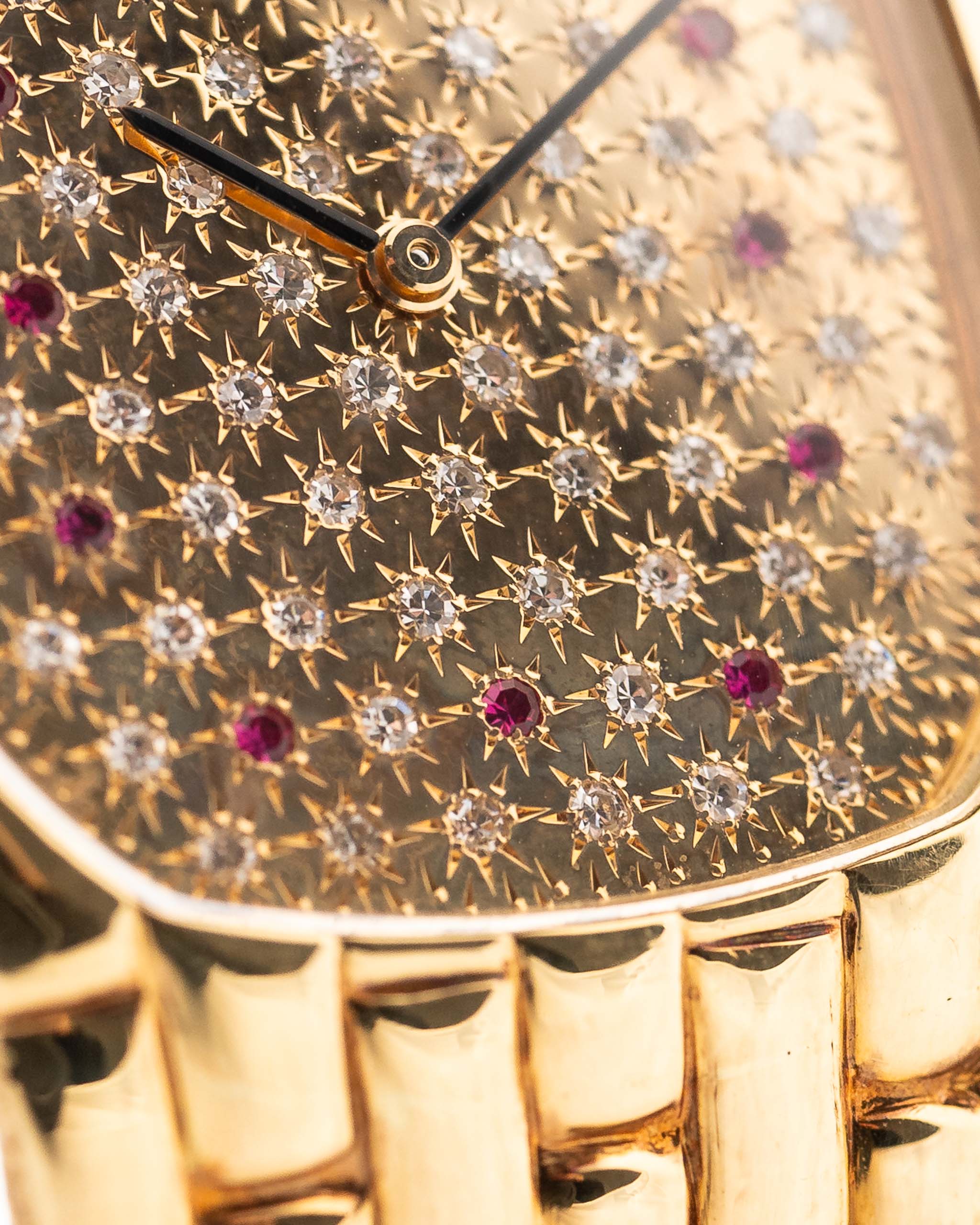 • Quadrante pavé originale mai toccato con diamante bianco e undici rubini come indici delle ore in condizioni impeccabili.