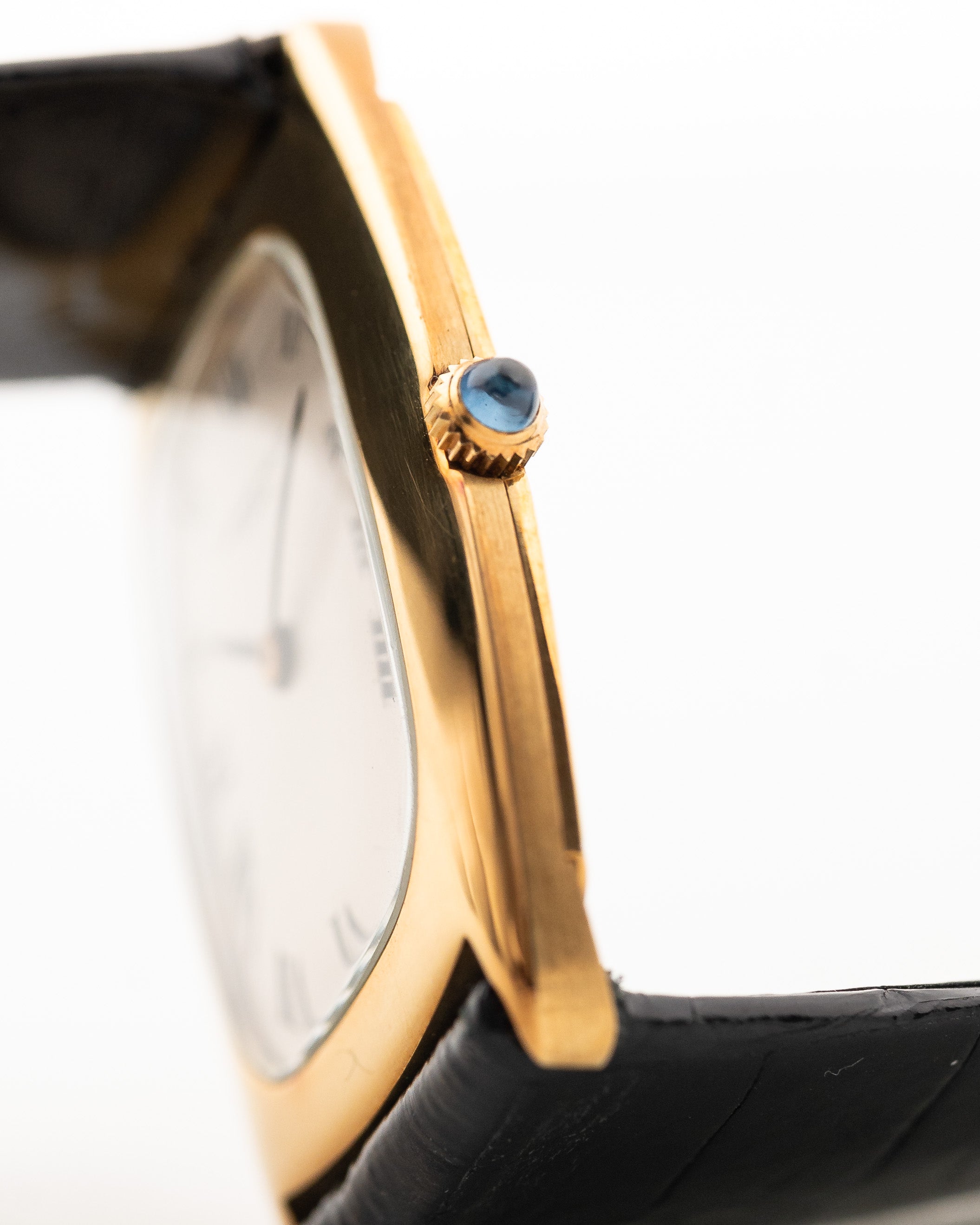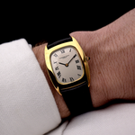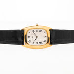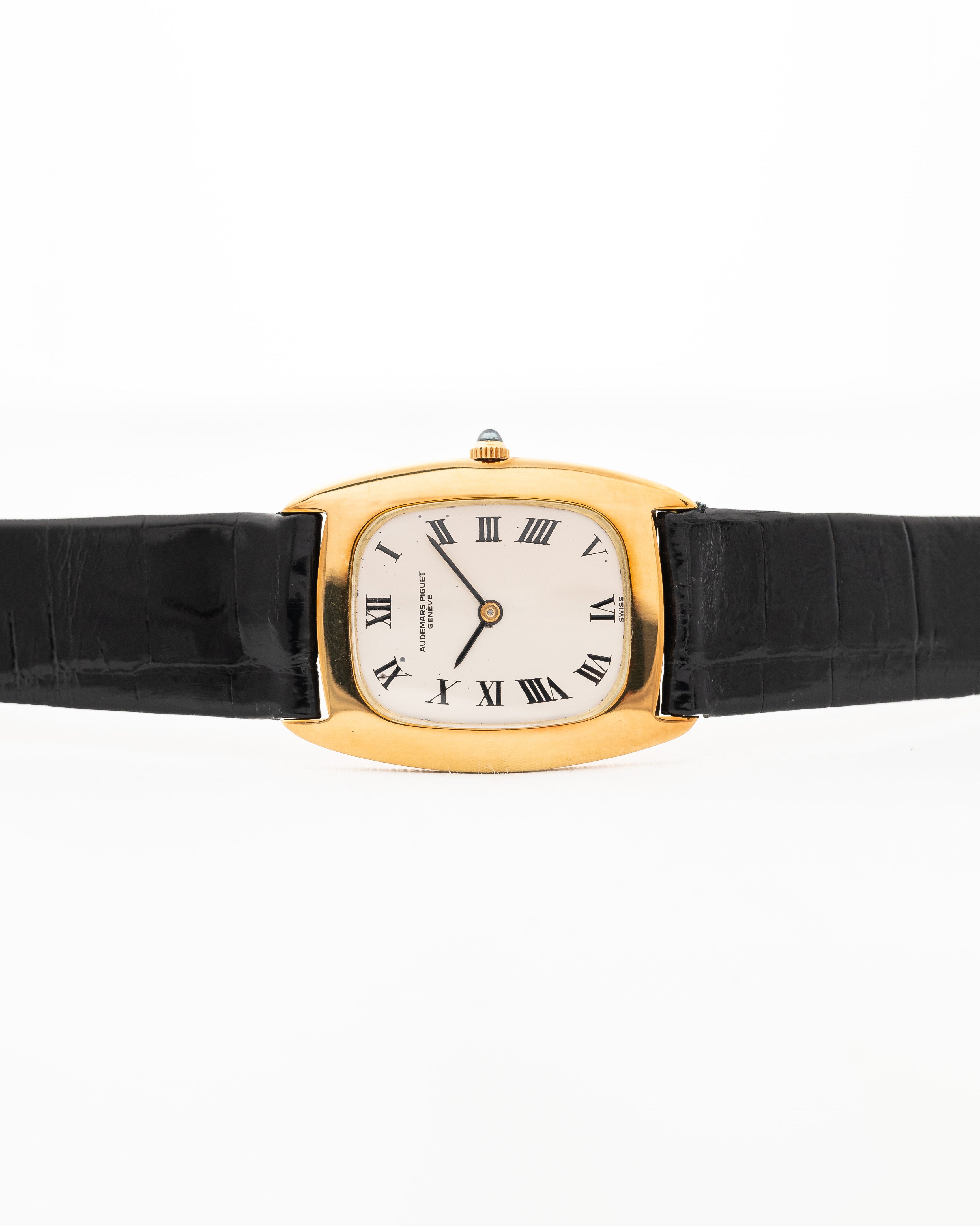 Ecco un orologio da sera Audemars Piguet in oro giallo 18 carati, splendidamente rifinito, con un design a cuscino ovale degli anni Settanta.