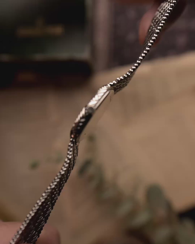 Questo raro Audemars Piguet della fine degli anni '70 è un esercizio di tranquilla opulenza. Realizzato interamente in oro bianco 18 carati, la sua cassa ottagonale-ellittica, unica nel suo genere, ospita un quadrante in onice nero impeccabile, punteggiato da dodici indici di diamanti incastonati in fabbrica: il lusso sobrio al suo massimo splendore.
