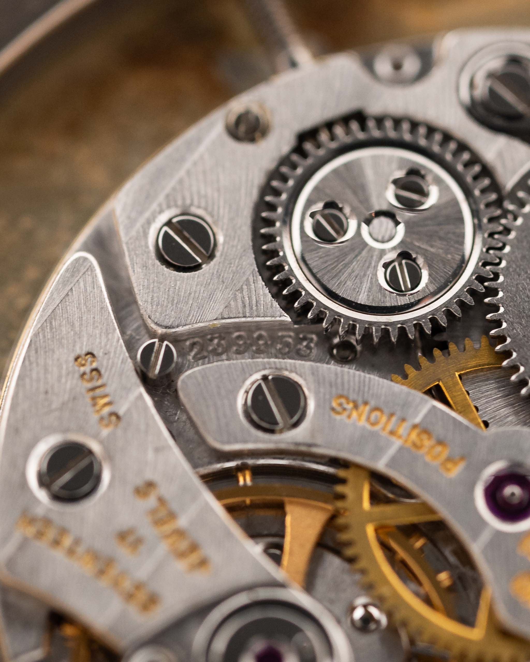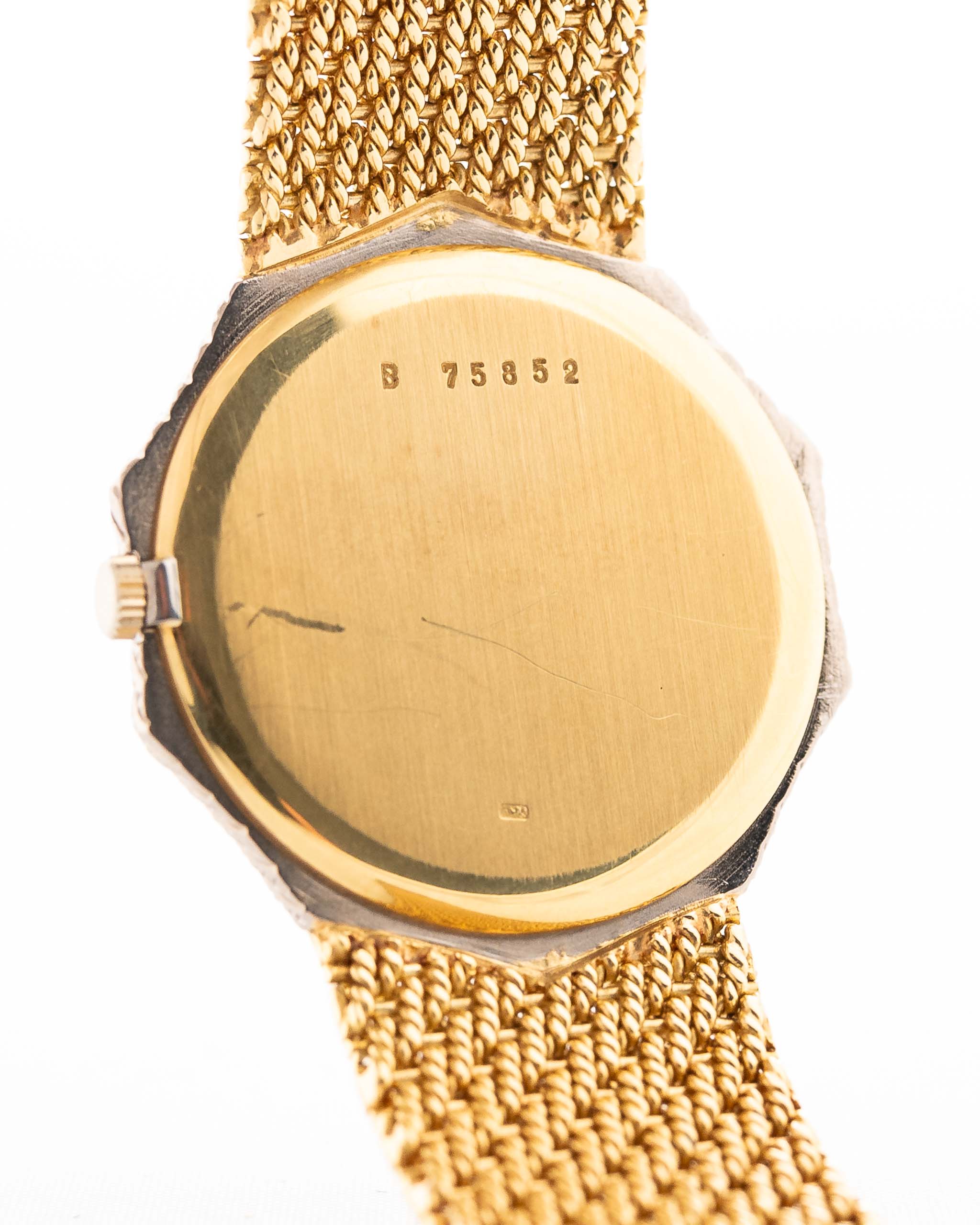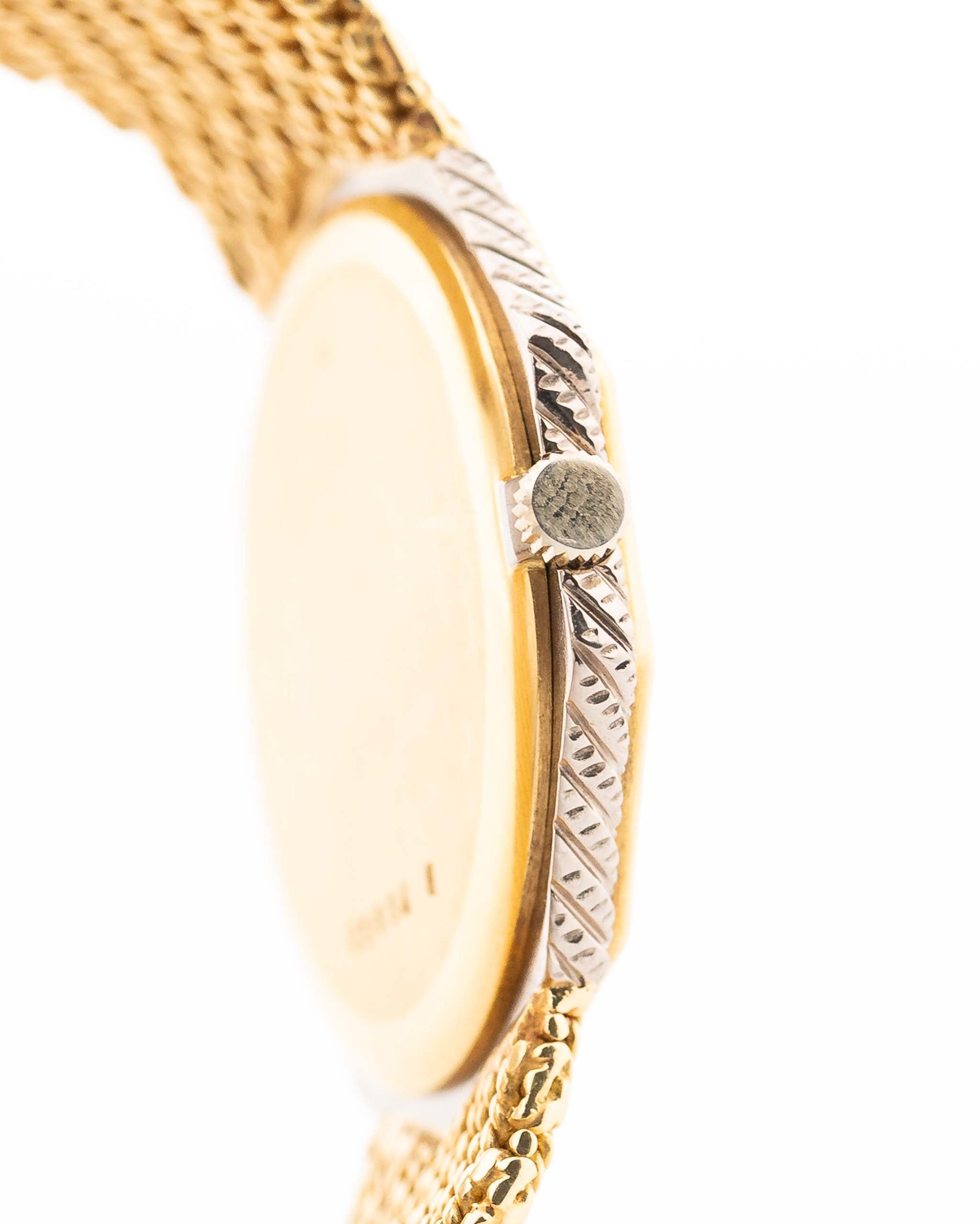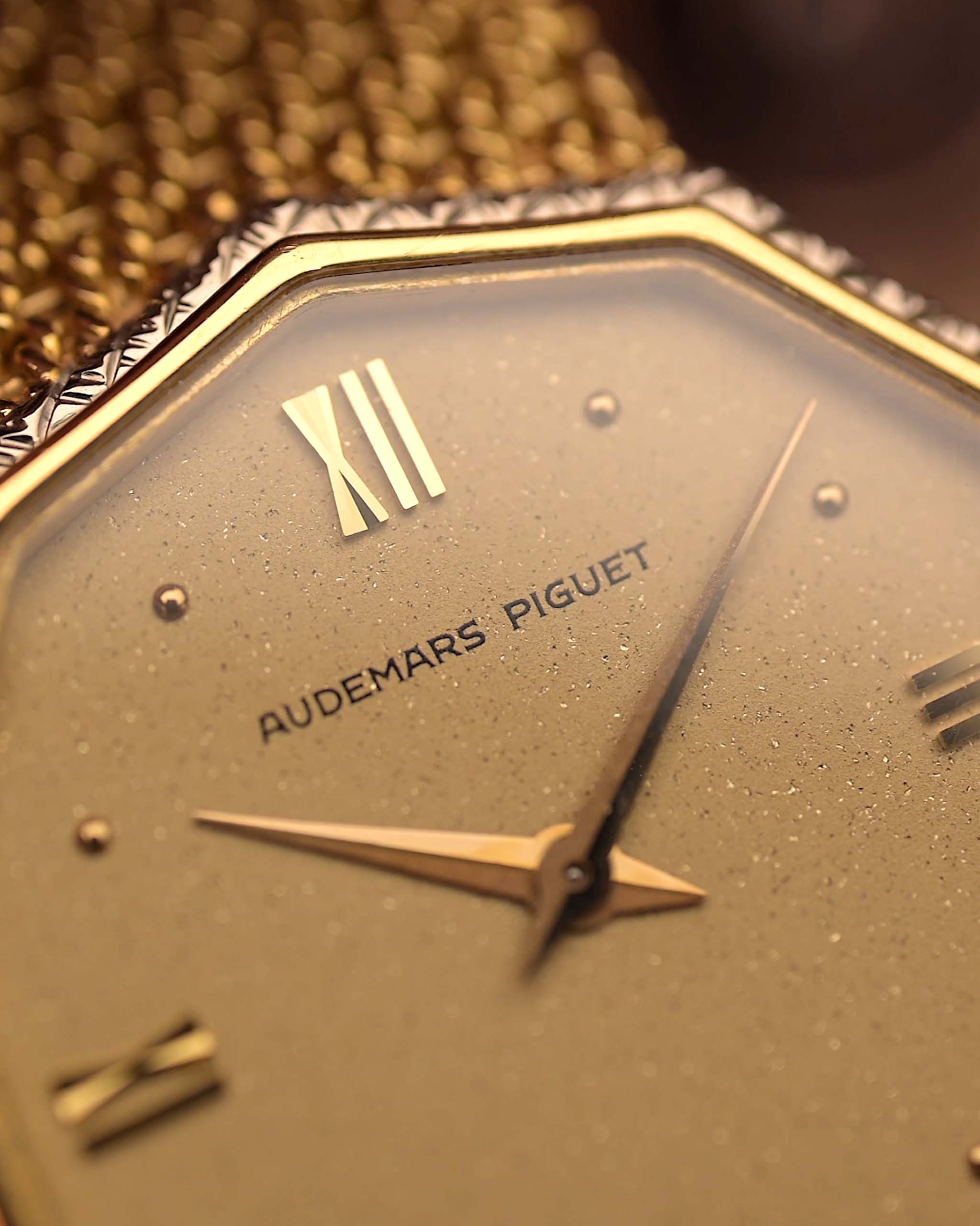 Un Audemars Piguet raro e sorprendente dei primi anni '80, caratterizzato dalla sua distintiva cassa ottagonale e dai raffinati dettagli bicolore. Realizzato in oro giallo 18 carati, l'orologio presenta un impeccabile quadrante in avventurina dorata con il logo AP, numeri romani a ore 12, 3, 6 e 9 e un'elegante lancetta alfa.