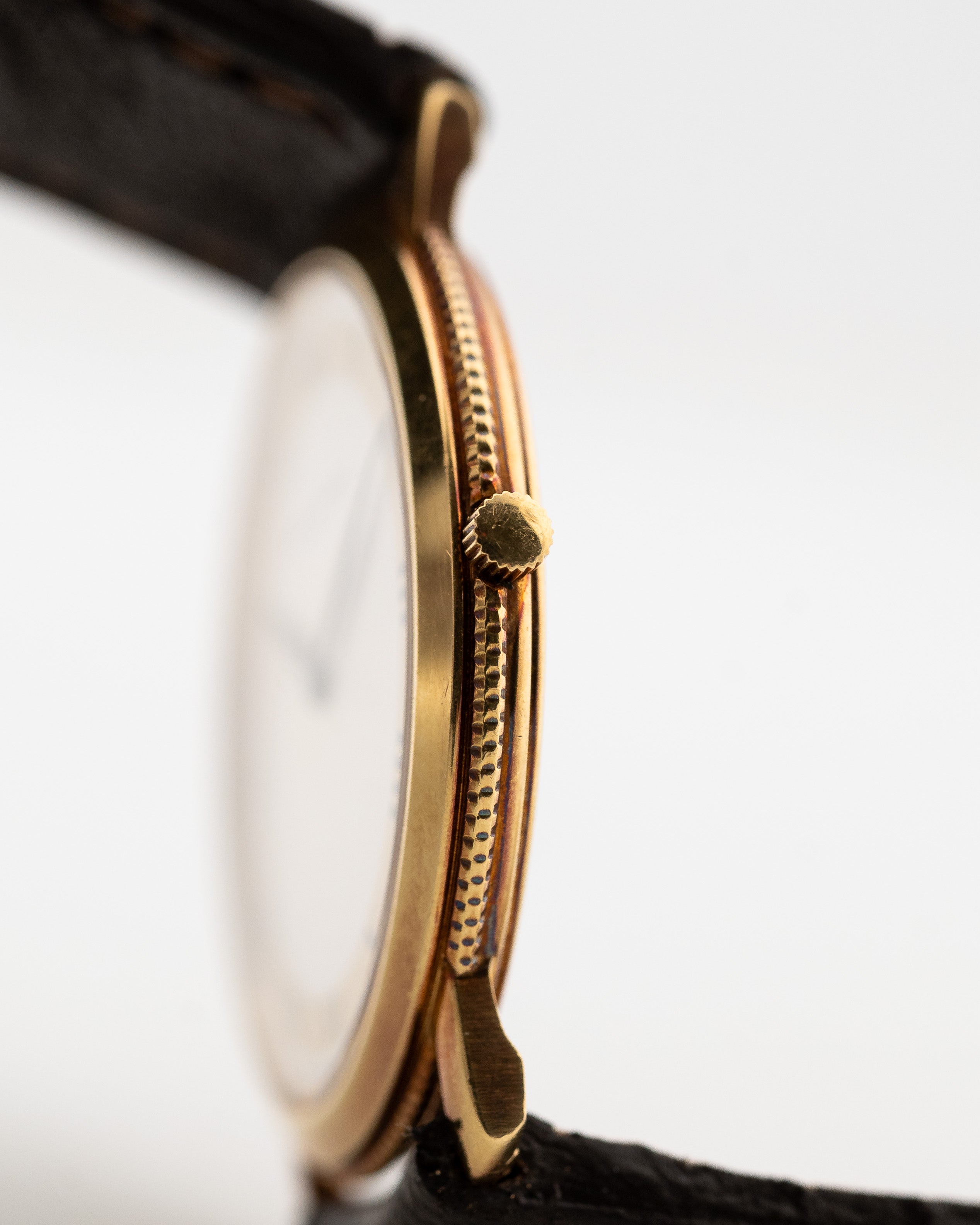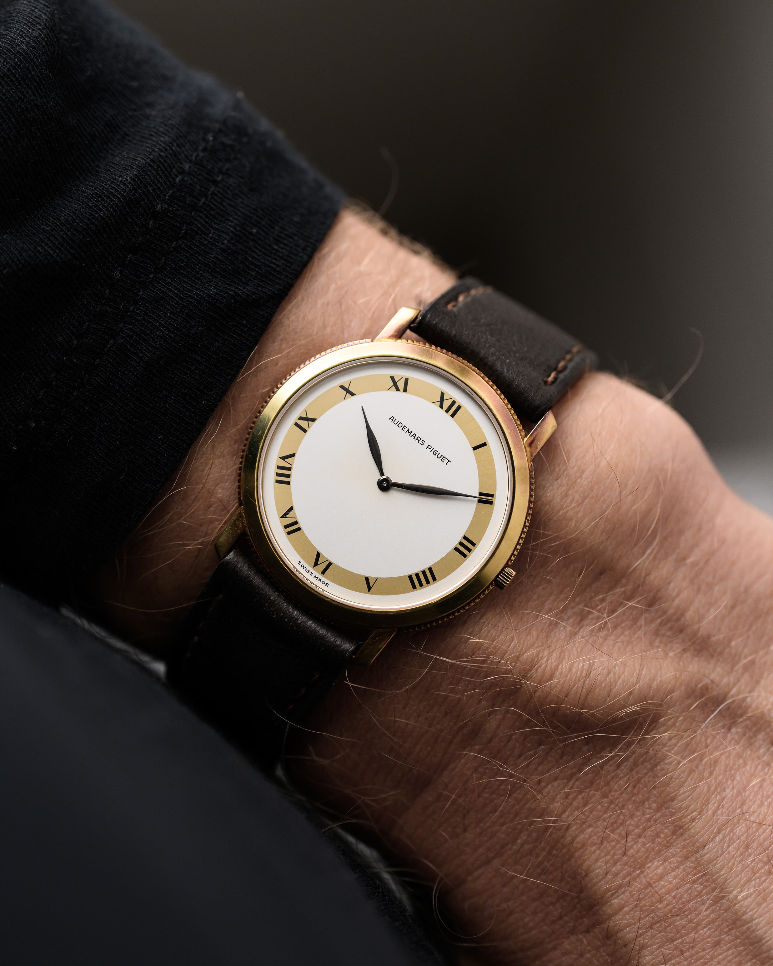 Qui abbiamo un orologio da abito Audemars Piguet degli anni '80, splendidamente rifinito, con un quadrante romano bicolore dal design sorprendente. Questo particolare pezzo si distingue per le sue belle condizioni non lucidate e per la robusta cassa ultrasottile in oro giallo 18 carati.