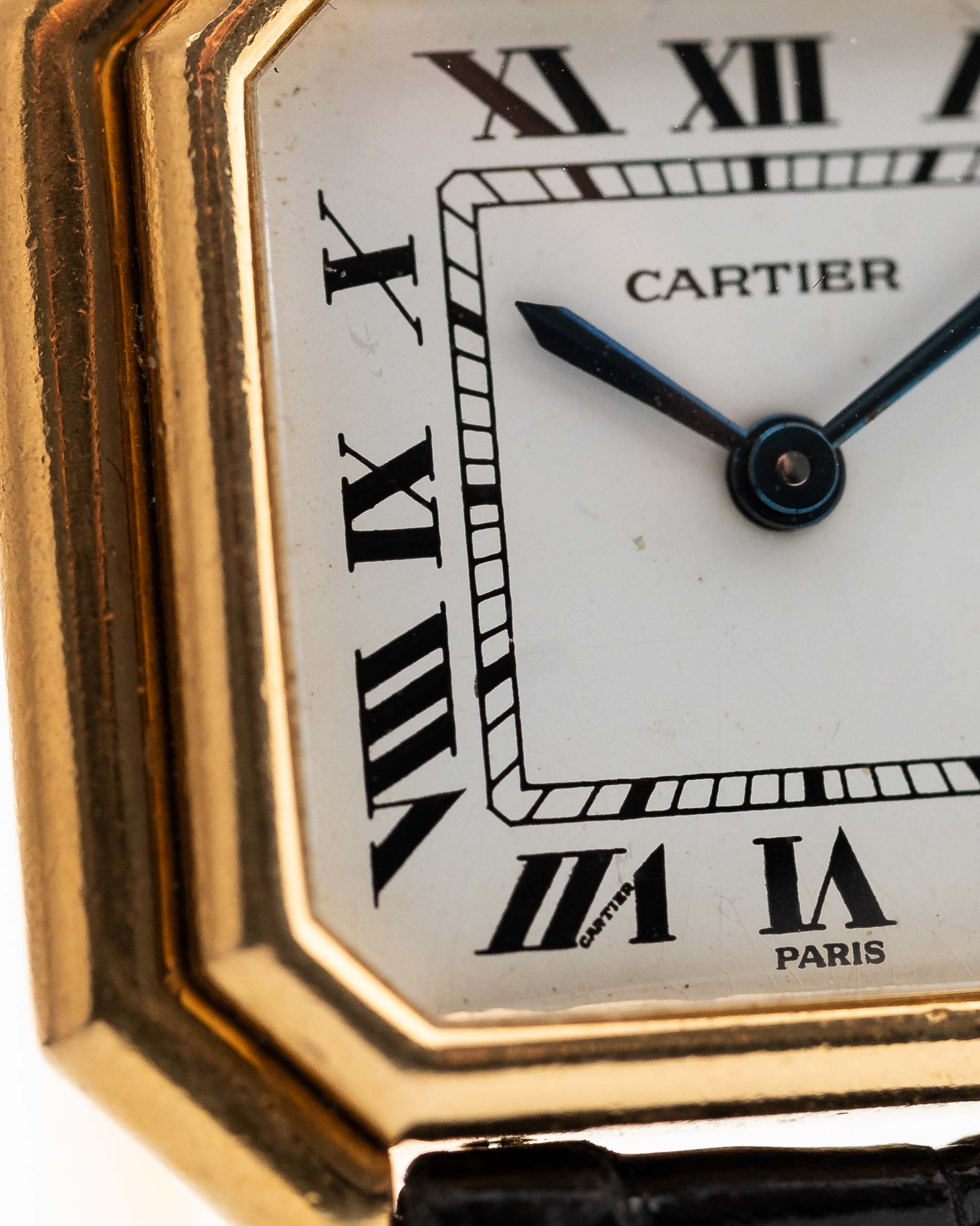Incassato in oro giallo massiccio 18 carati, l'orologio si presenta in modo splendido, conservando superfici nitide e linee forti. Abbinato al cinturino originale Cartier e alla fibbia d'oro abbinata (oltre a un cinturino aggiuntivo per un uso pratico), questo pezzo unisce rarità, eleganza e fascino parigino inconfondibile.