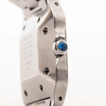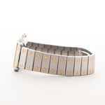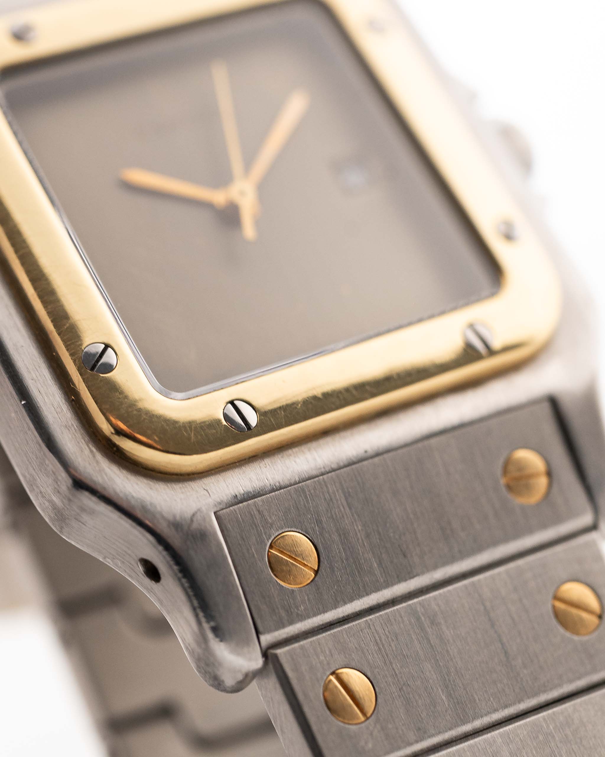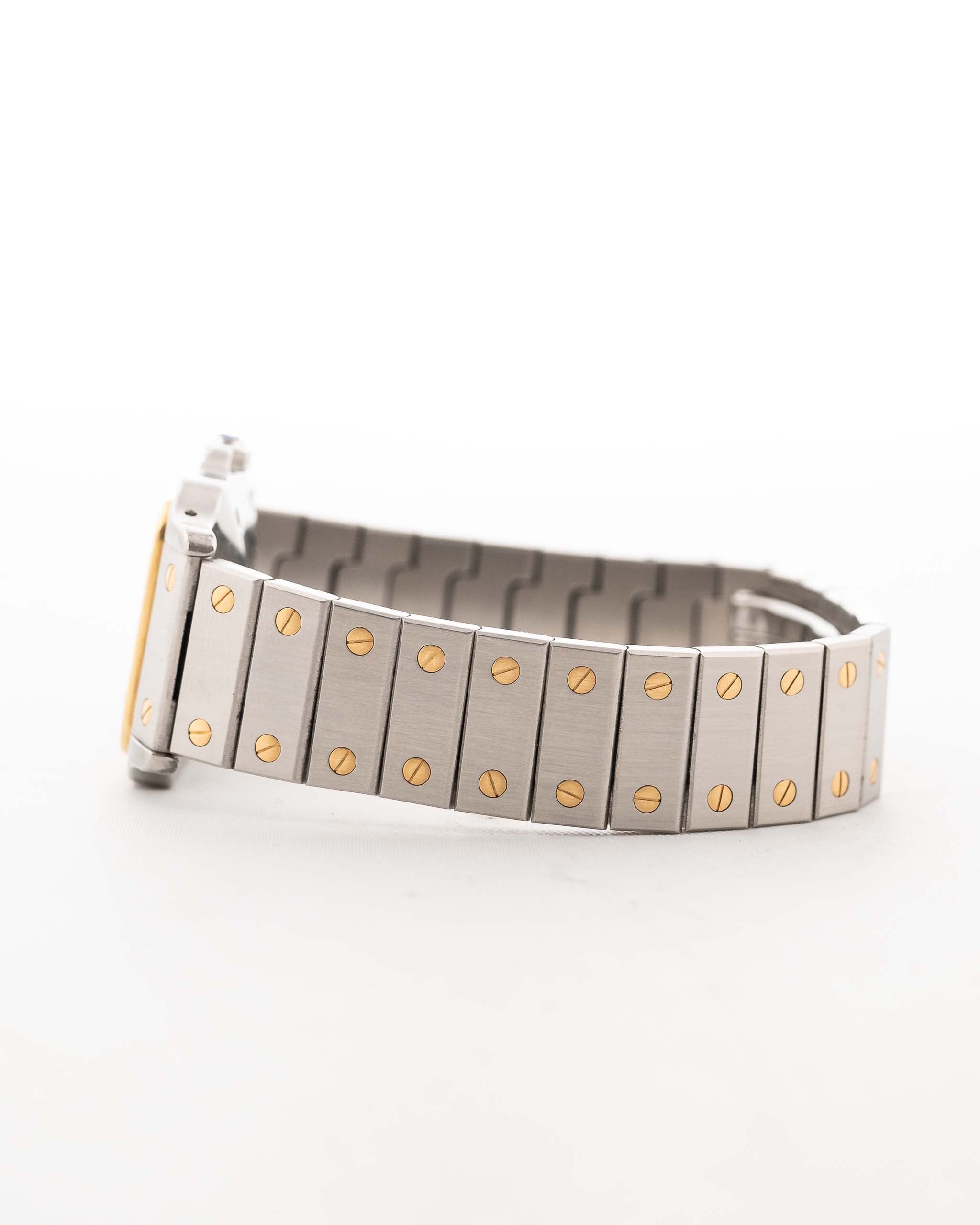 Questo Cartier Santos Carrée in acciaio inossidabile bicolore colpisce per il suo quadrante grigio ardesia spazzolato o cosiddetto "fantasma", le lancette a gladio dorate e, naturalmente, l'iconico bracciale Cartier Santos in acciaio inossidabile con accenti dorati. Questa versione è decisamente meno comune, il che la rende ancora più desiderabile.