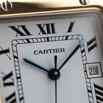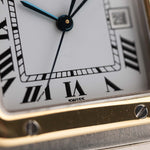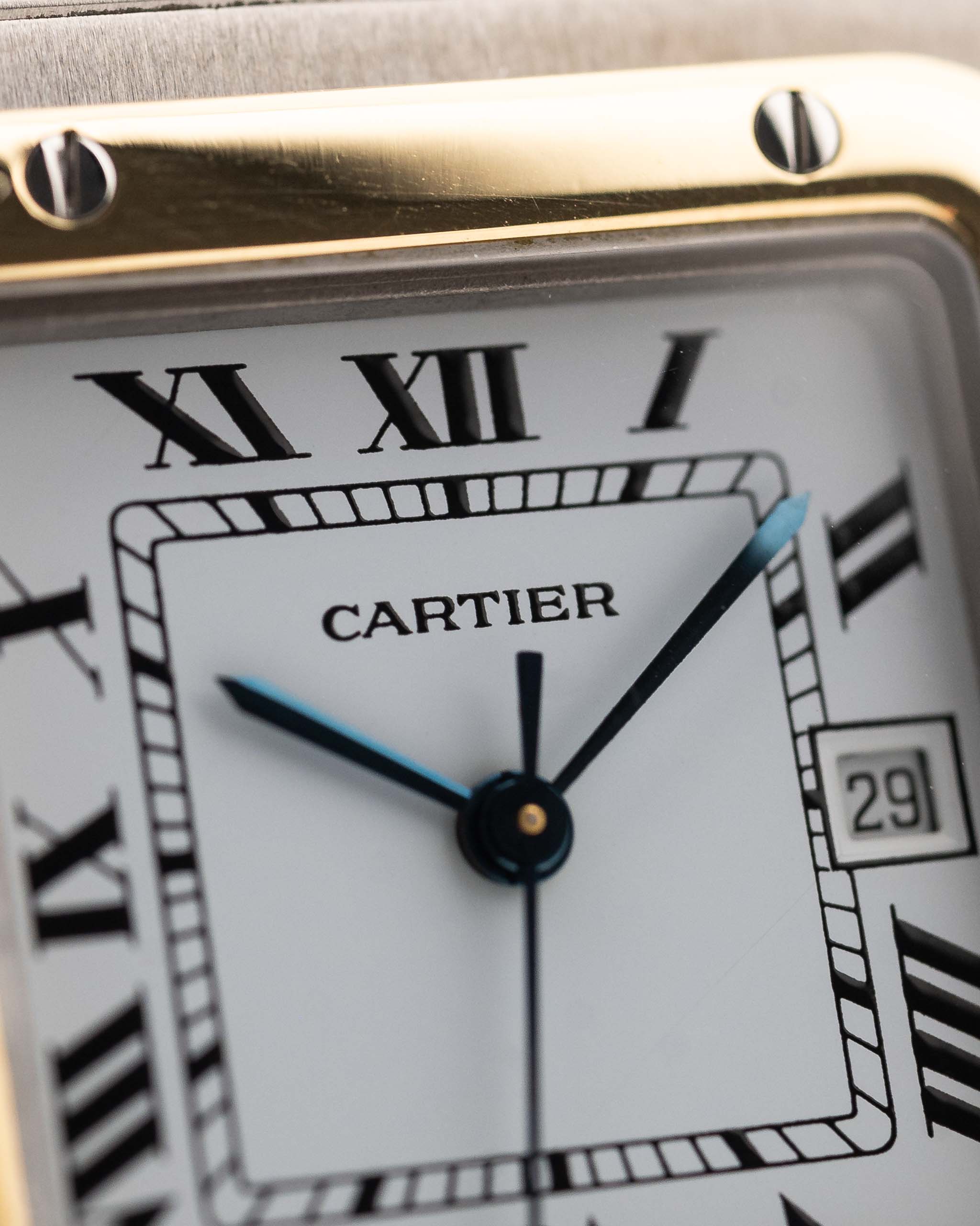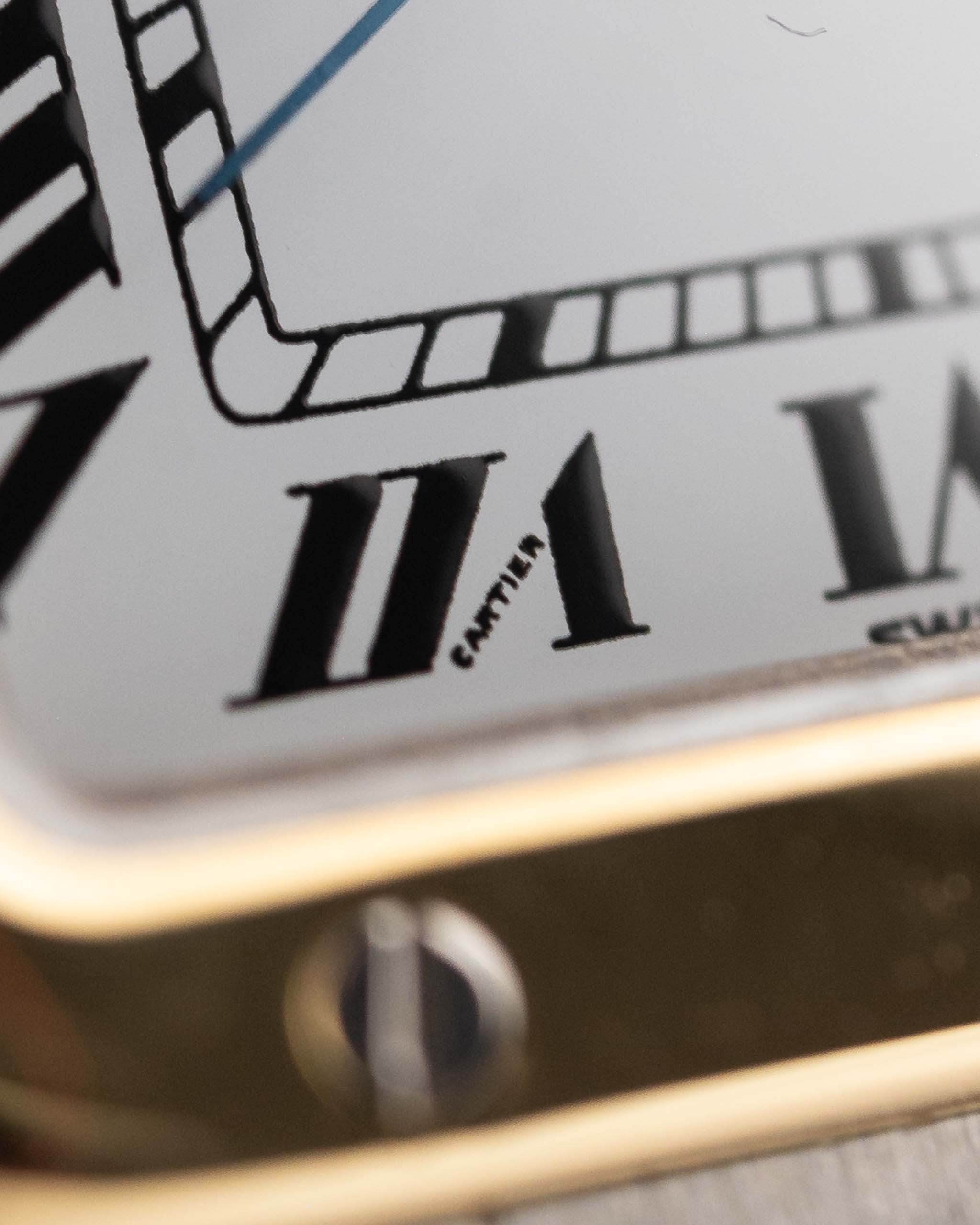 Orologio Cartier Santos d'epoca Carrée 2961 Bicolore 1980 acciaio inossidabile quadrante oro 18k primo piano