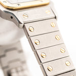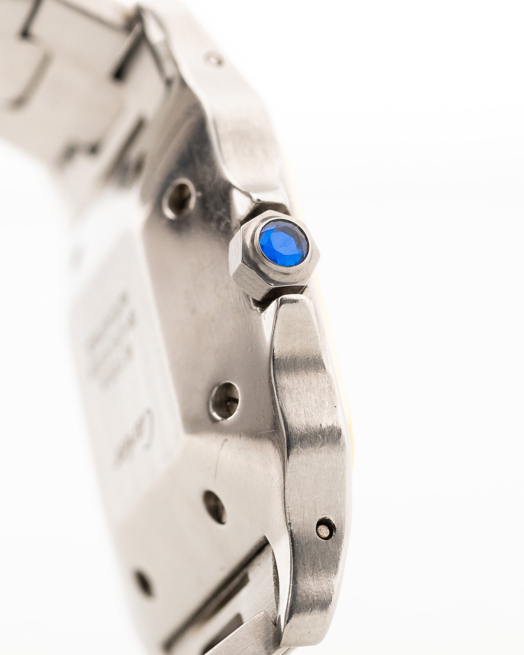 Questo Cartier Santos Carrée in acciaio inossidabile bicolore colpisce per il quadrante bianco, le lancette in acciaio azzurrato e, naturalmente, per gli accenti in oro 18 carati.