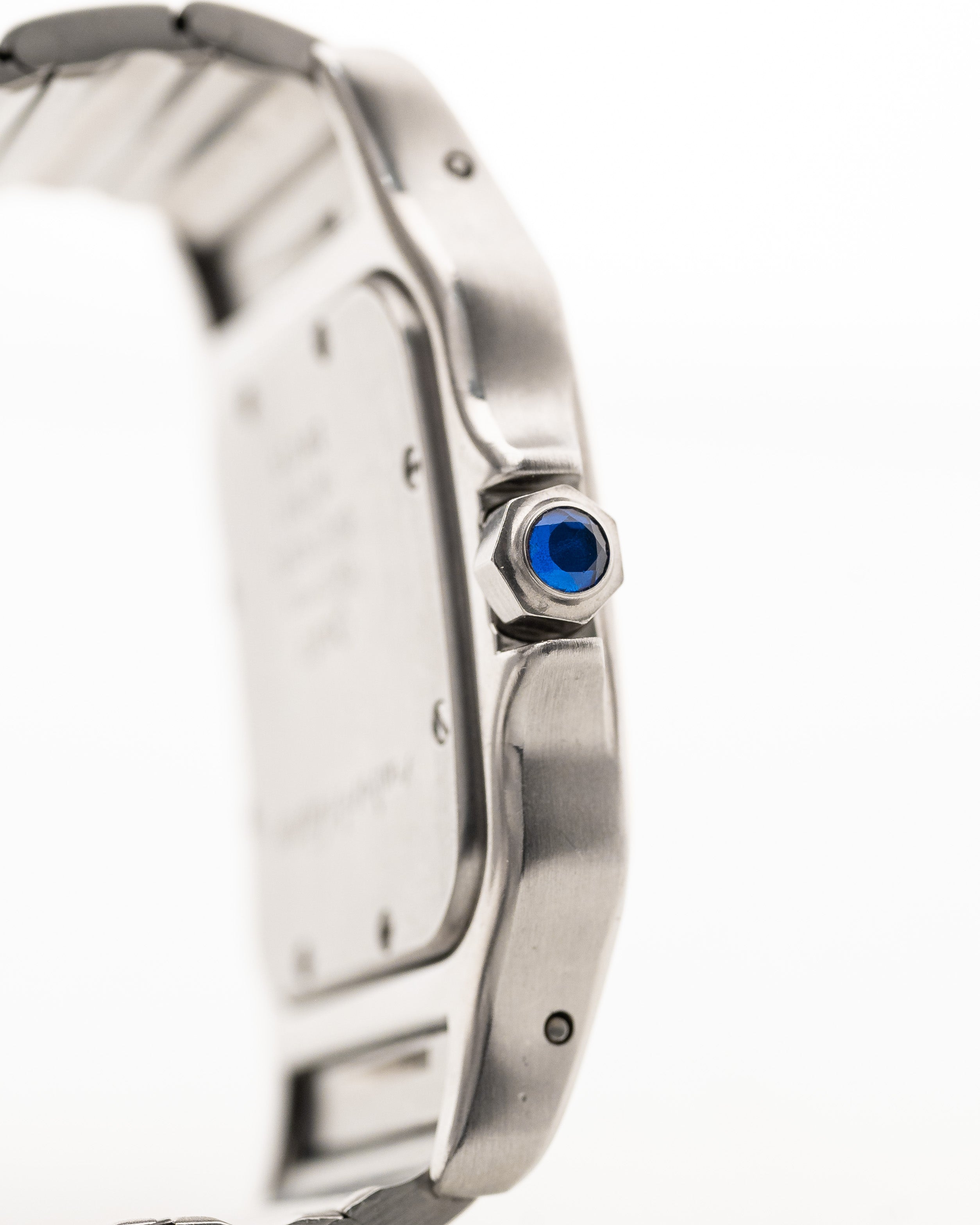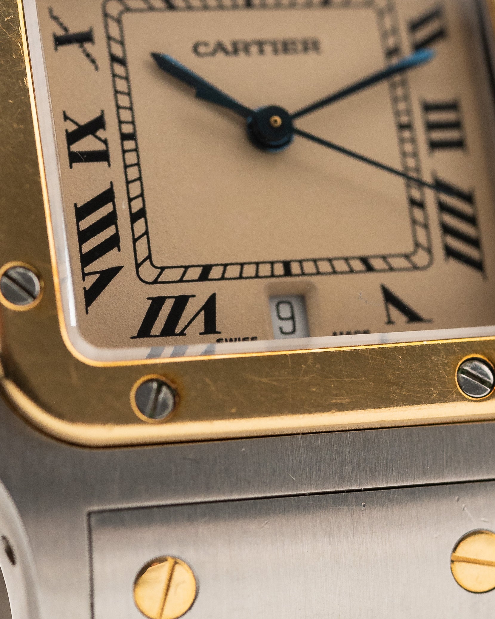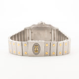 Questo Cartier Santos Galbée in acciaio inossidabile bicolore colpisce per il suo bellissimo e rarissimo quadrante marrone, le lancette in acciaio azzurrato e, naturalmente, i numeri romani neri.