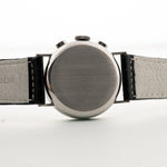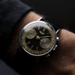 Questa bellezza è un cronografo a due registri con uno splendido quadrante smoking. Con dimensioni di 33 mm, la cassa a gradini in acciaio inossidabile ha un design pulito. Presenta anse sottili e piccoli pulsanti cronografici a pillola. Per questa età, le condizioni del quadrante sono impeccabili.