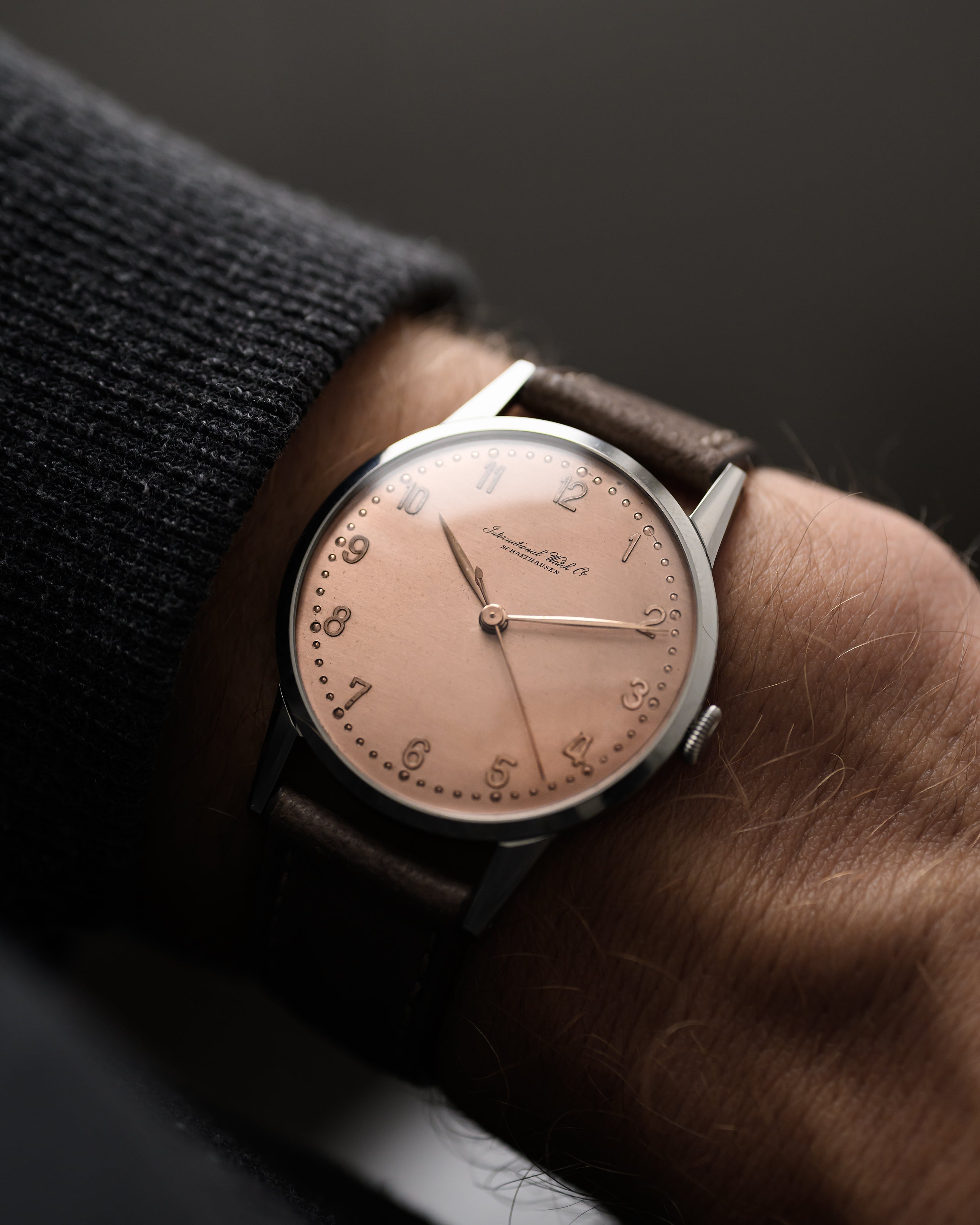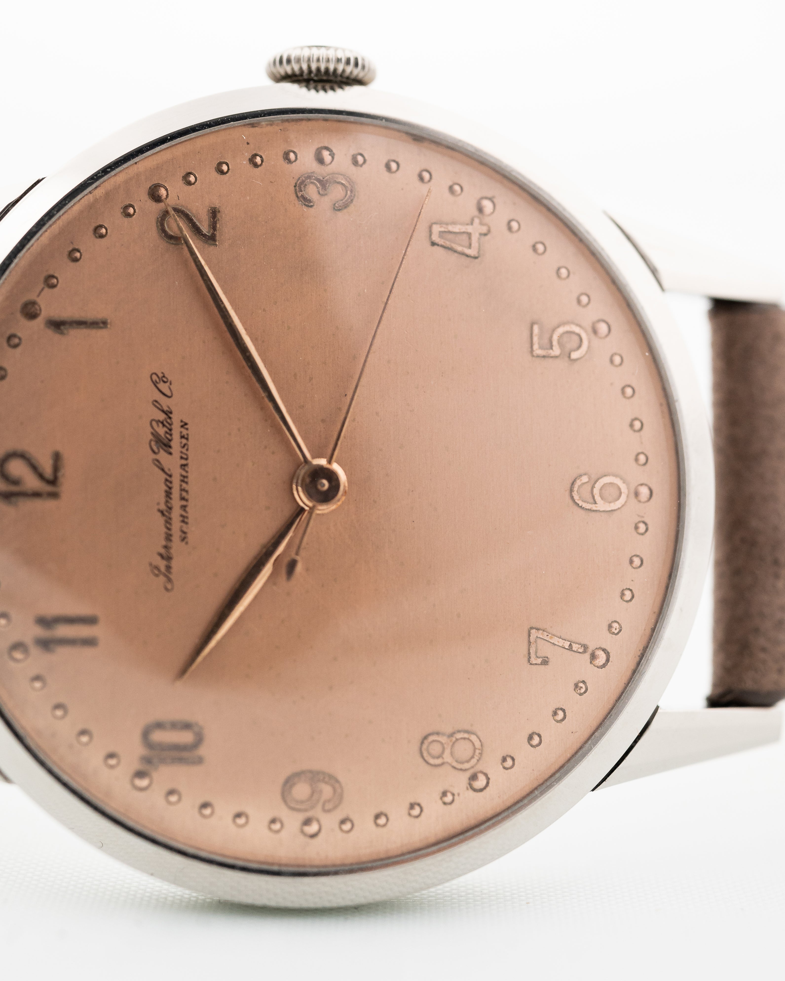 IWC ha prodotto un'ampia varietà di orologi da polso fin dall'inizio, dagli orologi da sera a quelli per l'aviazione. Questo esemplare, in acciaio inossidabile con anse leggermente angolate, rimarrebbe una costante nelle collezioni di chiunque, soprattutto perché ha un rarissimo quadrante color salmone in ottime condizioni.
