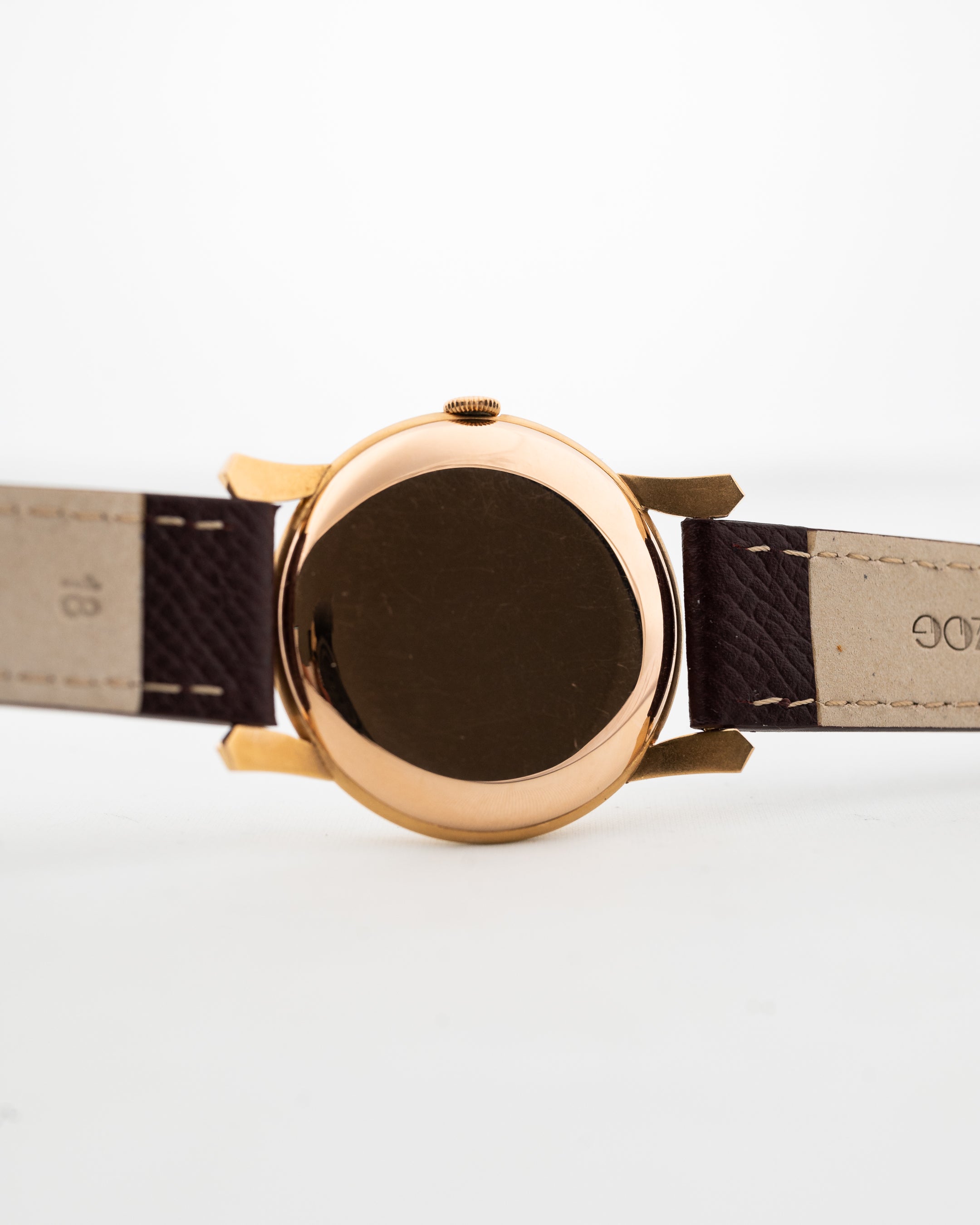 IWC ha prodotto un'ampia varietà di orologi da polso fin dall'inizio, spaziando dagli orologi da abito a quelli per l'aviazione. Questo esemplare, in oro rosa 18 carati con anse bombate, rimarrebbe una costante nelle collezioni di chiunque, soprattutto perché si presenta in condizioni eccezionali.