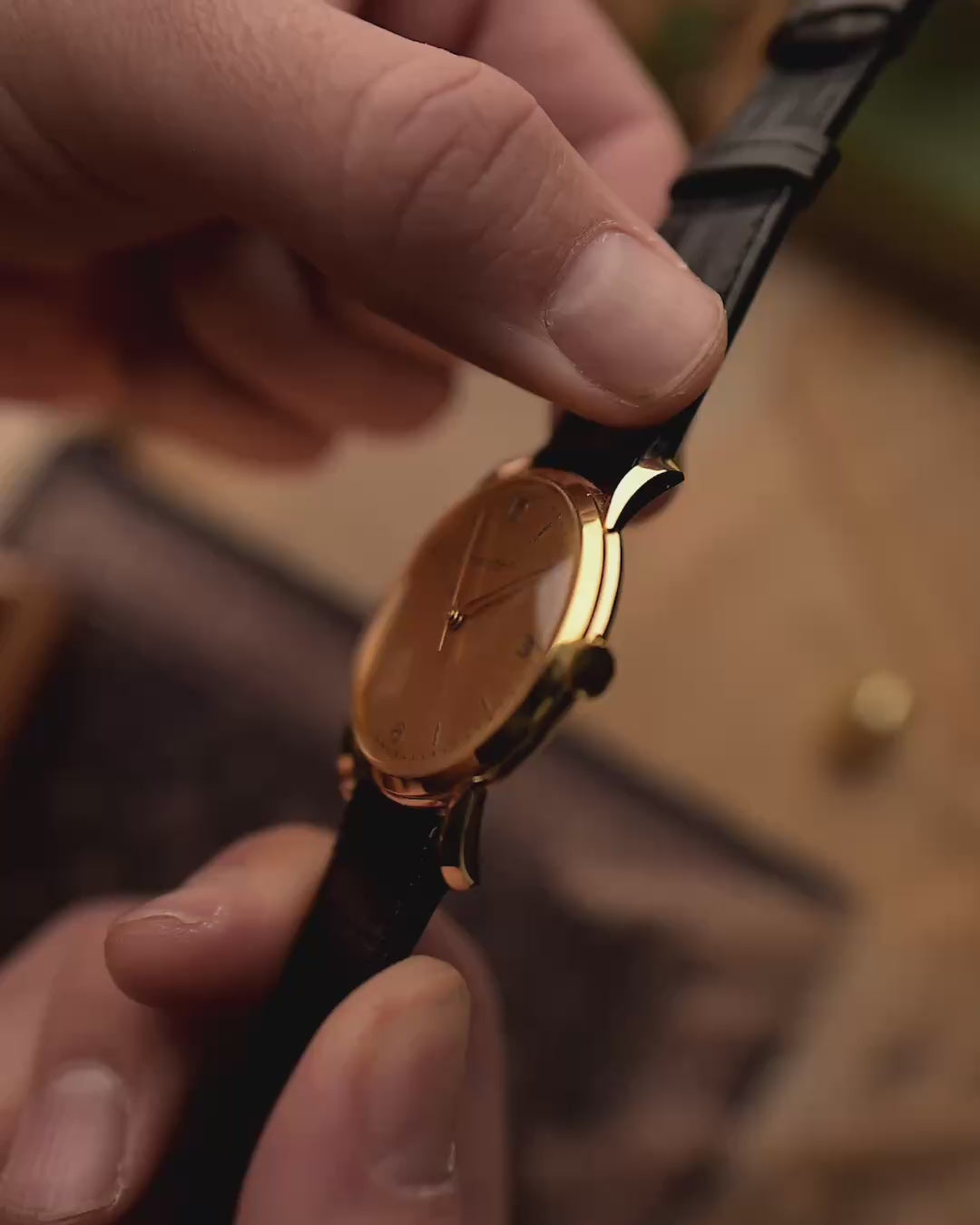 Il suo quadrante dorato, intatto e naturalmente invecchiato con una delicata patina, si abbina senza sforzo al calore della cassa. Classico, raro ed elegante senza tempo, questo è un pezzo di spicco per il collezionista esigente, che unisce il passato e il presente con tranquilla sicurezza.