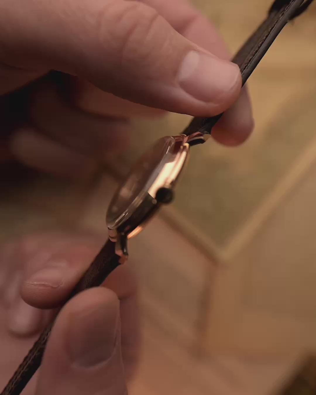Questo raro orologio da cerimonia IWC Calibro 89 del 1968 offre un mix eccezionale di raffinatezza discreta e struttura della cassa sorprendente. Realizzato in oro rosa 18 carati, la caratteristica distintiva è senza dubbio le anse scultoree a "pinna di squalo", che conferiscono un tocco audace e architettonico all'estetica pulita e minimalista.