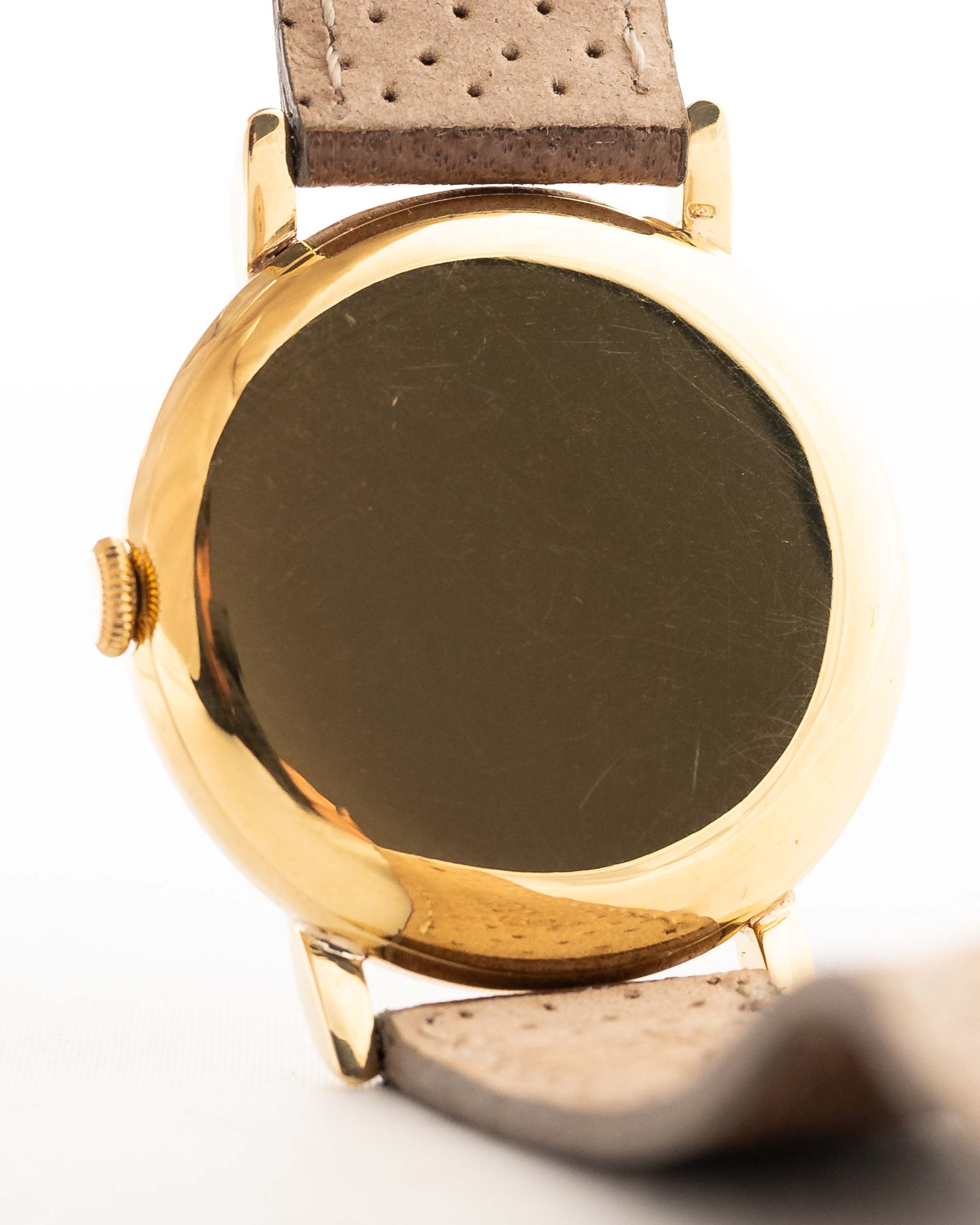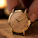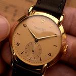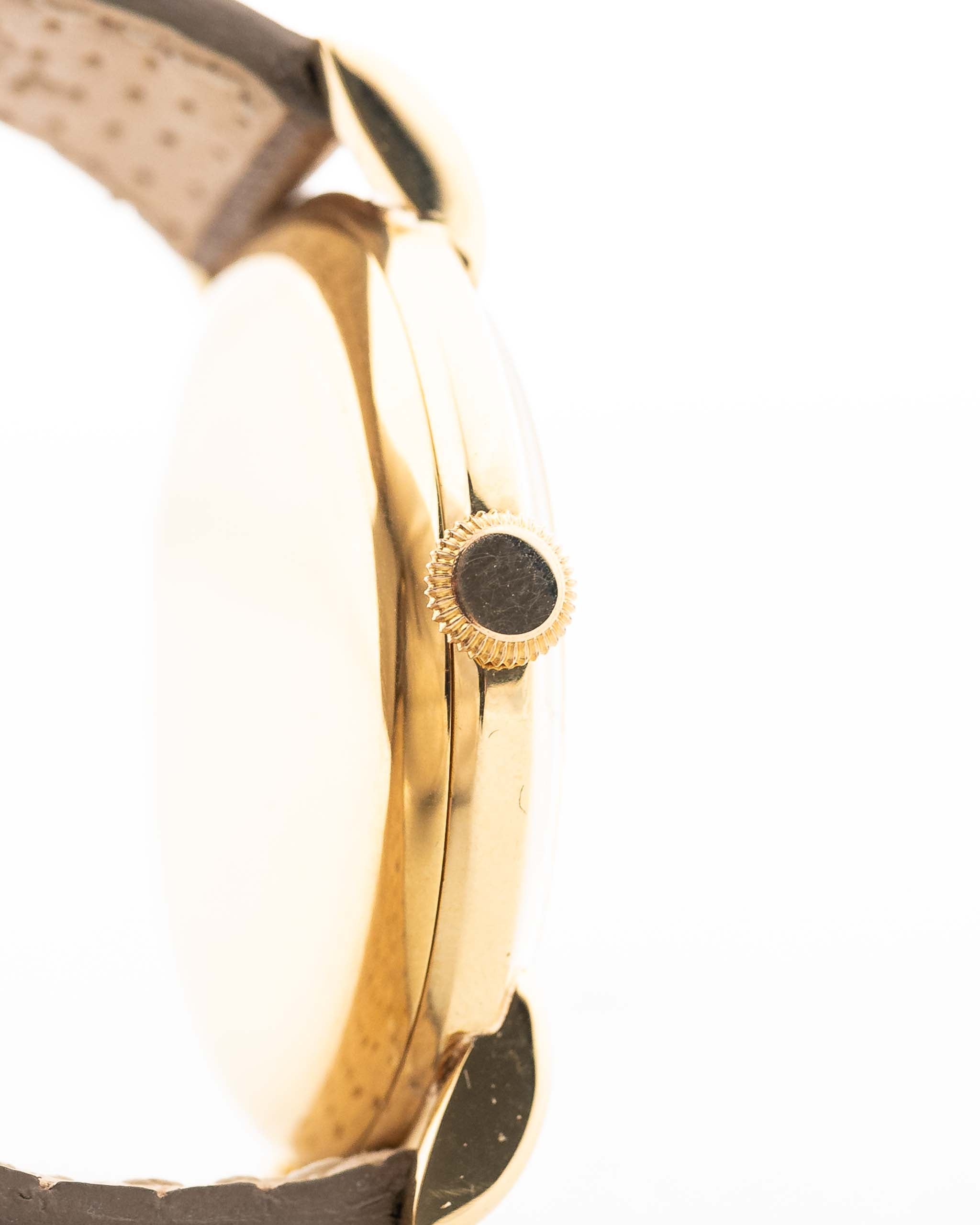 Questo eccezionale orologio da sera IWC del 1947 incarna l'epoca d'oro dell'orologeria svizzera, combinando l'integrità meccanica con la sobrietà visiva. Alloggiato in una cassa sovradimensionata da 37 mm in oro giallo 18 carati, il suo design è elevato da grandi anse a goccia che aggiungono presenza e portamento al polso.