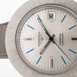 Ecco il Longines Admiral oversize "disco volante" o "Ufo", in acciaio inossidabile con un'enorme cassa 42 e uno splendido quadrante argentato con indici blu.