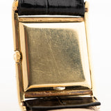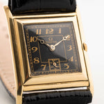 Presenta una cassa quadrata in oro giallo 14 carati con anse fisse sottili e leggermente tornite e uno splendido quadrante nero Art Déco con numeri arabi.