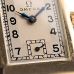 Questo raro orologio da polso Omega del 1935 incarna la raffinatezza dell'epoca Art Déco. Racchiuso in una cassa rettangolare in oro giallo 14 carati, appare notevolmente più grande di quanto suggeriscano le sue dimensioni, conferendo al polso un profilo elegante e di grande impatto.
