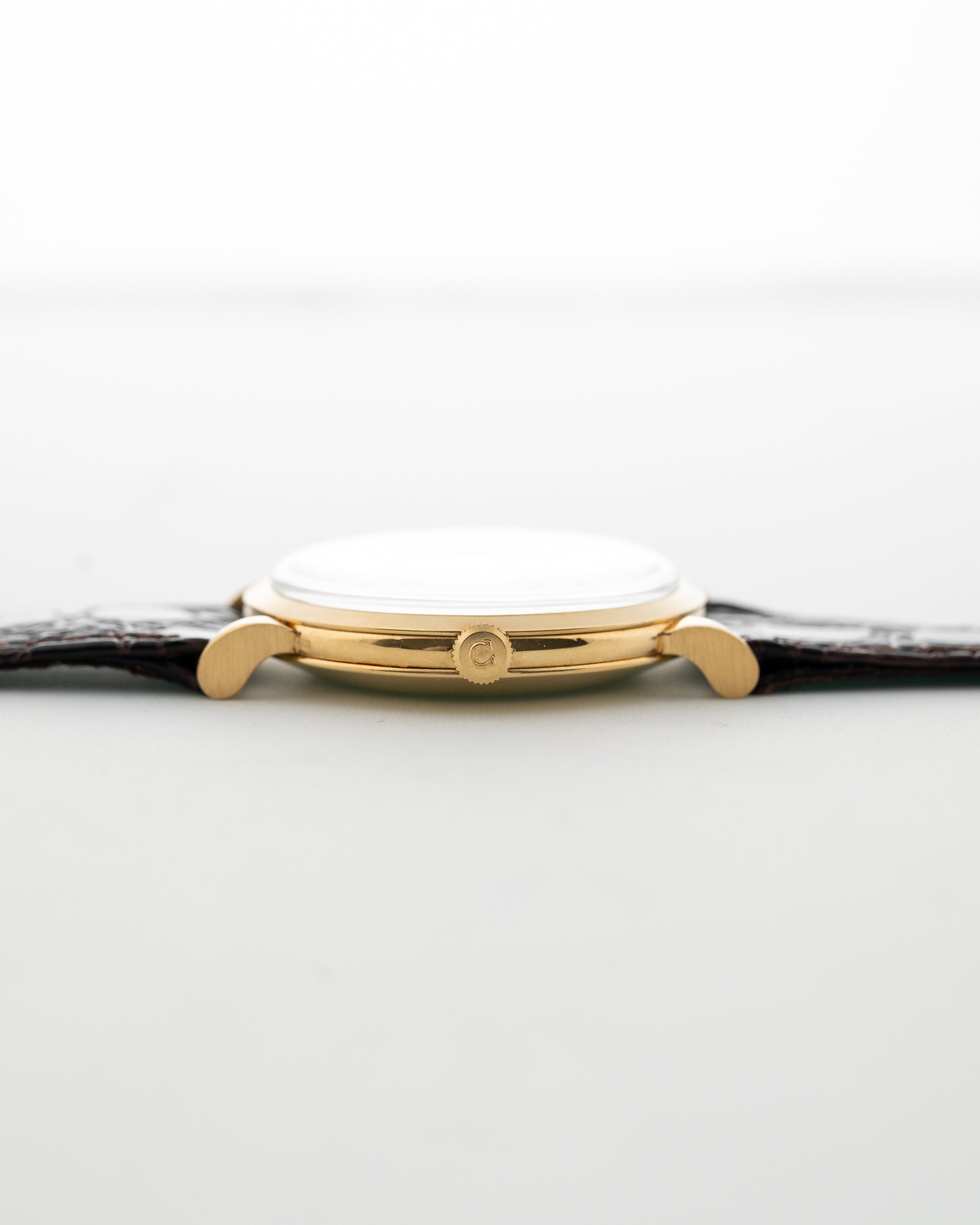 Qui può vedere un affascinante e rarissimo Pre-Seamaster realizzato da Omega nel 1950. Presenta una cassa da 35 mm in oro giallo 18 carati con bellissime anse tornite, un bellissimo quadrante bianco/argento e indici a bastone 18 carati.