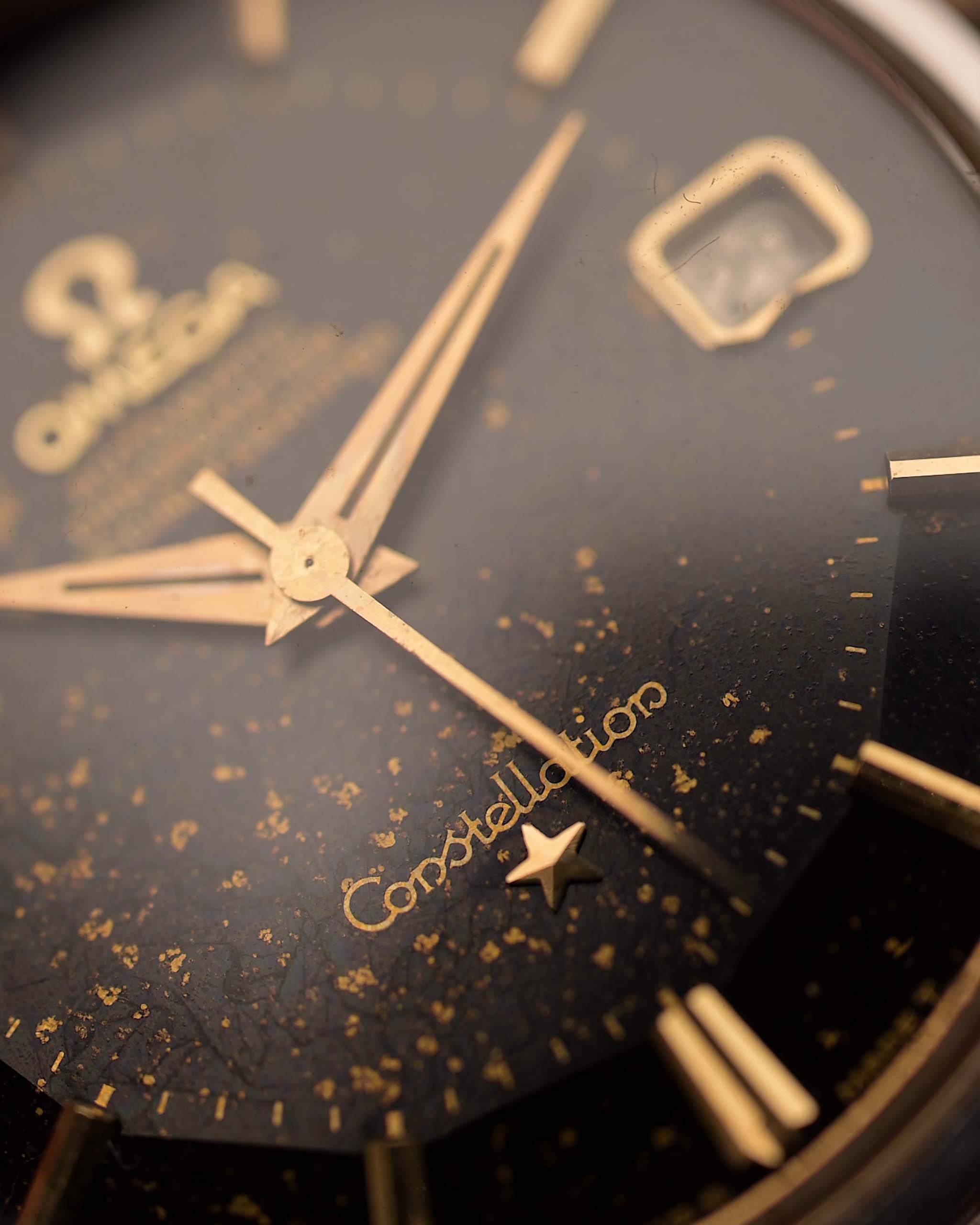 La cassa in acciaio inossidabile da 34 mm mostra una geometria nitida e contorni eleganti, bilanciati dal caratteristicoquadrante dorato a tortiglione - un segno distintivo inconfondibile dei primi Constellation. Gli indici a bastone sottili e le lancette dauphine sfaccettate completano il quadro, catturando l'ideale di metà secolo di raffinata sobrietà. Questo modello ha sviluppato una patina unica che ci ricorda il cielo notturno pieno di stelle.