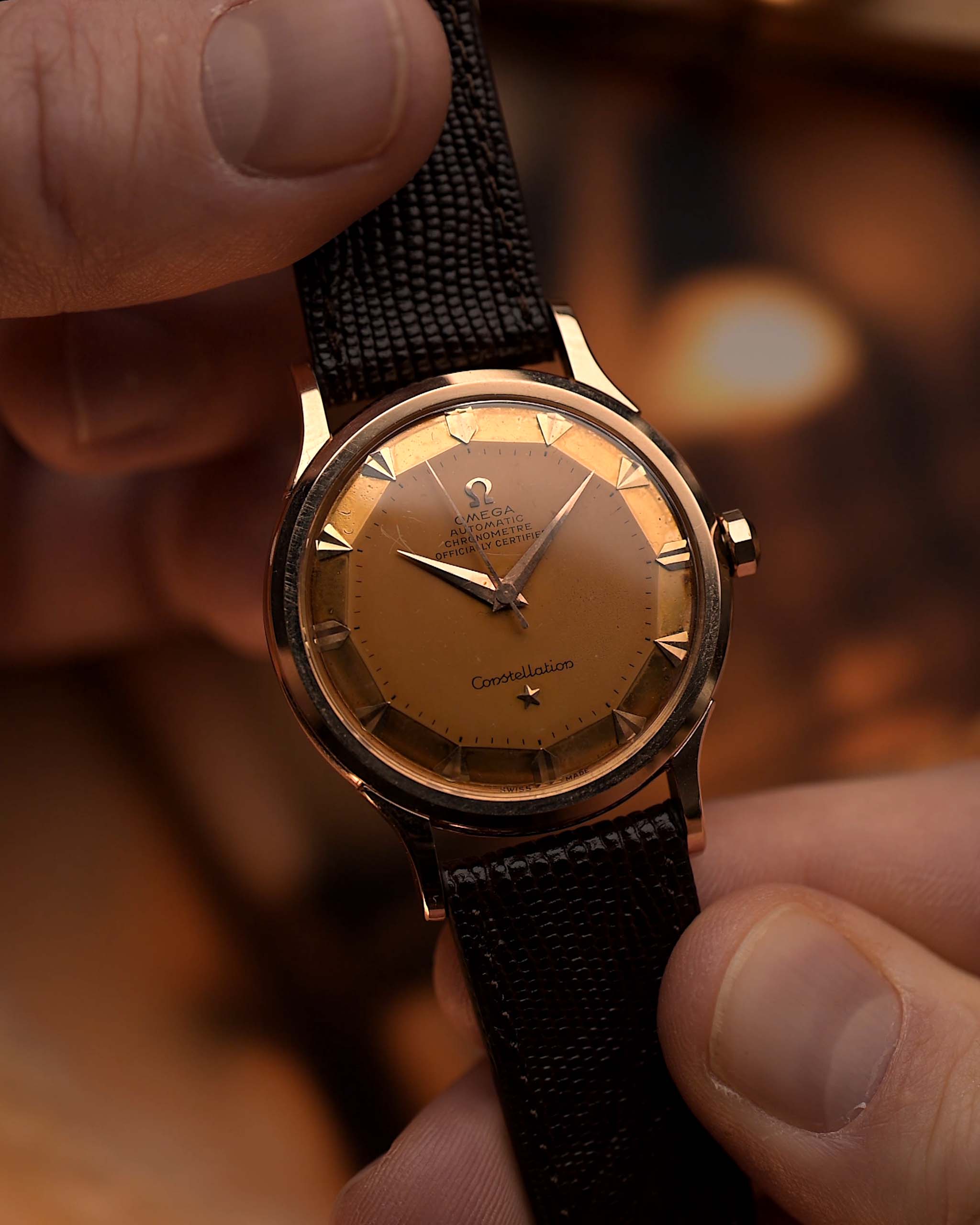 Questo Omega Constellation del 1958 rappresenta l'apice dell'orologeria svizzera della metà del secolo. Realizzato in oro rosa 18 carati, presenta l'iconico quadrante pie pan, un linguaggio di design che conferisce profondità, simmetria e presenza, il tutto in una cassa dalle dimensioni perfette di 35 mm.