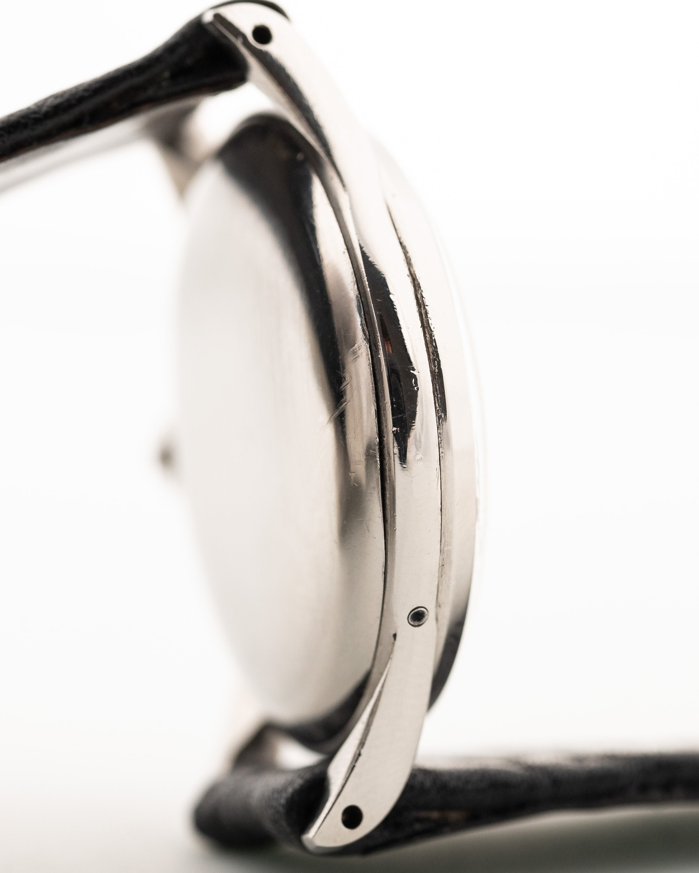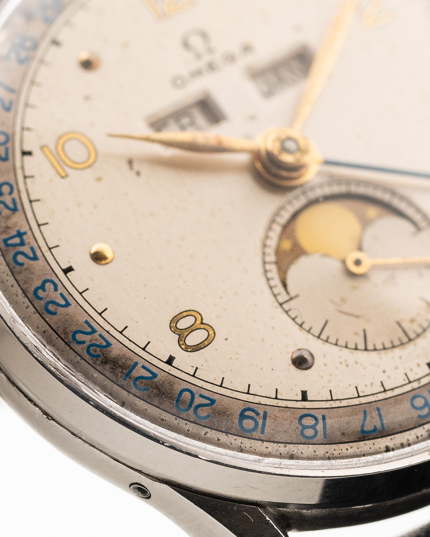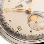 Il quadrante presenta le finestrelle del giorno e del mese nella metà superiore e una fase lunare all'interno del grande quadrante dei secondi nella metà inferiore. La cremagliera esterna del quadrante è caratterizzata da un'impressionante minuteria blu per la data. Le lancette a foglia sono tutte in ottime condizioni, così come la lancetta della data in acciaio azzurrato.