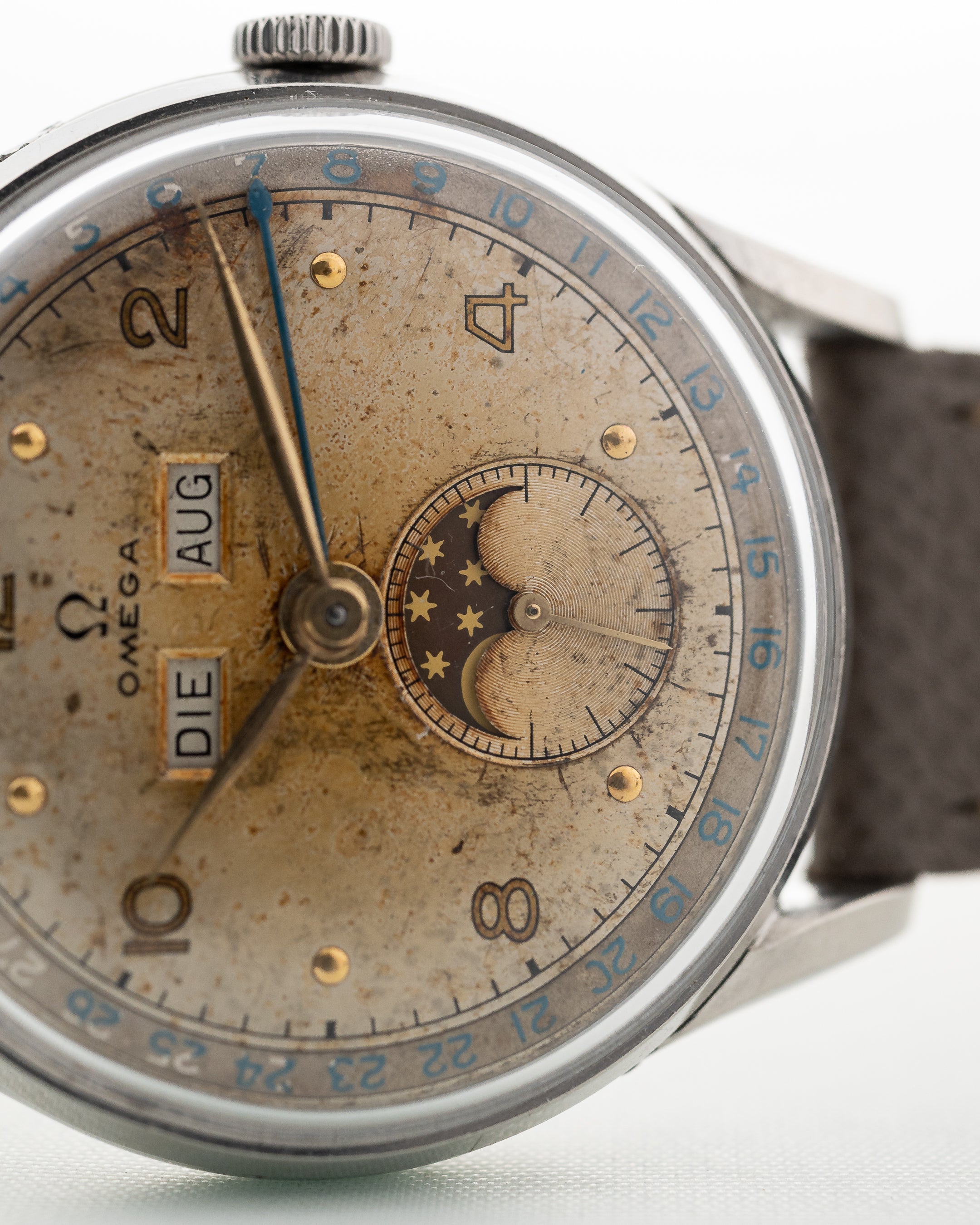 Il quadrante presenta le finestrelle del giorno e del mese nella metà superiore e una fase lunare all'interno del grande quadrante dei secondi nella metà inferiore. La cremagliera esterna del quadrante è caratterizzata da un'impressionante minuteria blu per la data. Le lancette a foglia d'oro sono tutte in condizioni superbe, così come la lancetta della data in acciaio azzurrato - il quadrante ha sviluppato una patina forte e calda che ci ricorda un po' la mappa di un tesoro segreto.