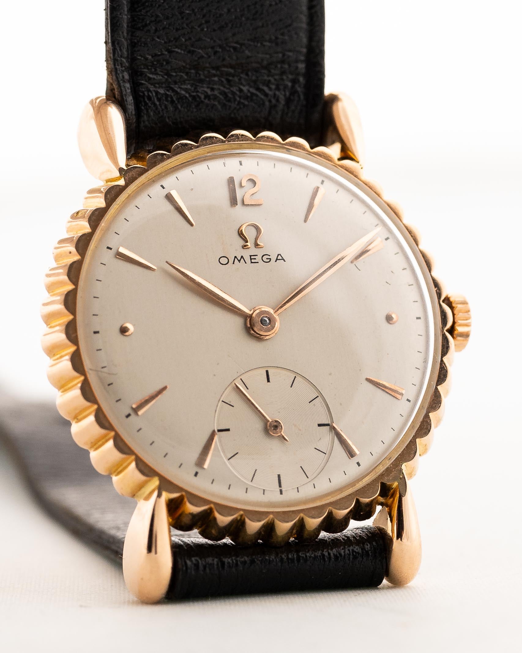 Questo Omega del 1947 è qualcosa di veramente unico. Questo design della cassa si trova molto raramente - in queste condizioni è quasi impossibile. La cassa da 32 mm è leggermente più grande a causa dello speciale design della cassa. Il quadrante pulito di colore argento con secondi sussidiari e la bella cassa in oro rosa, le lancette e il logo Omega applicato in oro rosa lo portano a un altro livello di orologi da cerimonia.