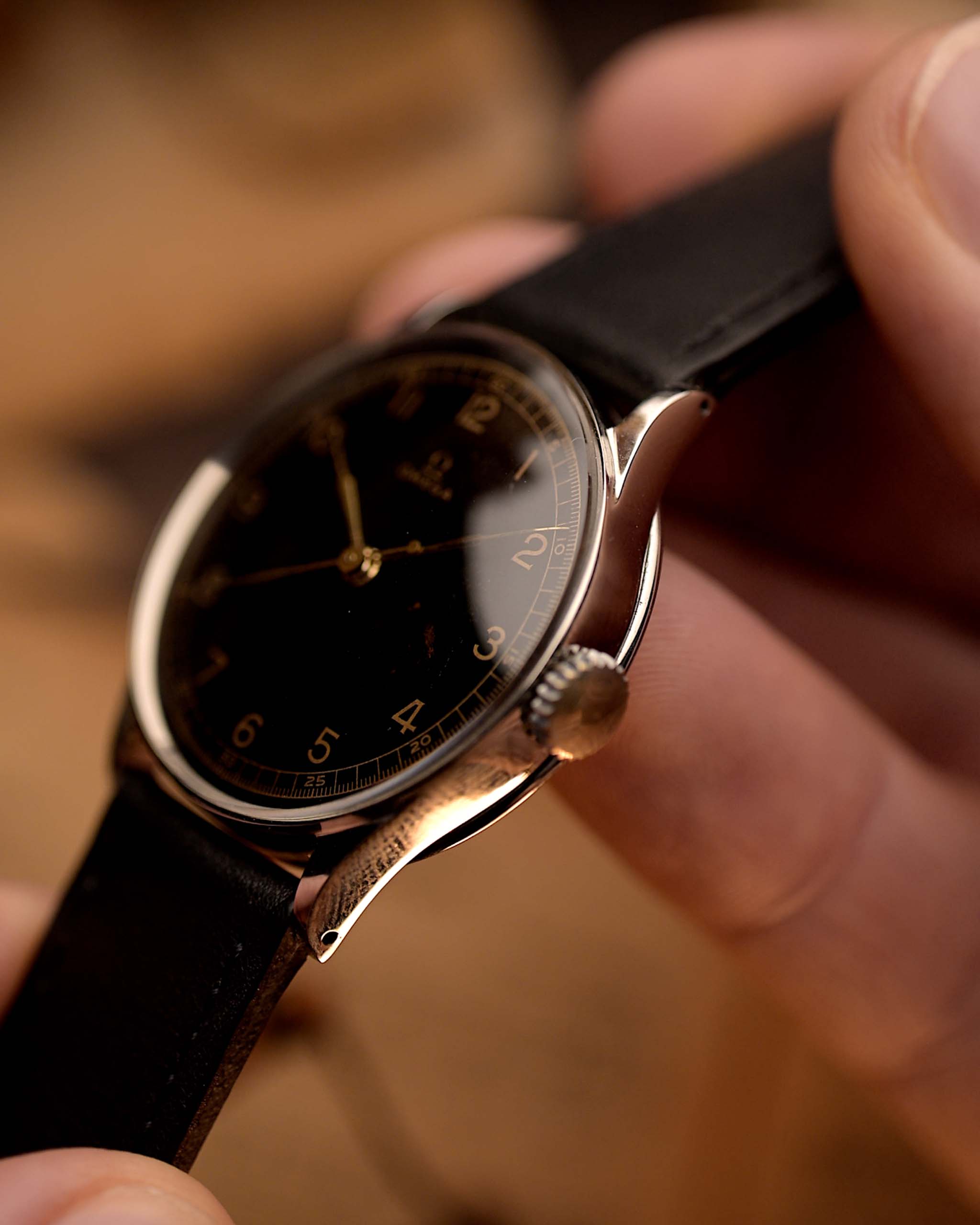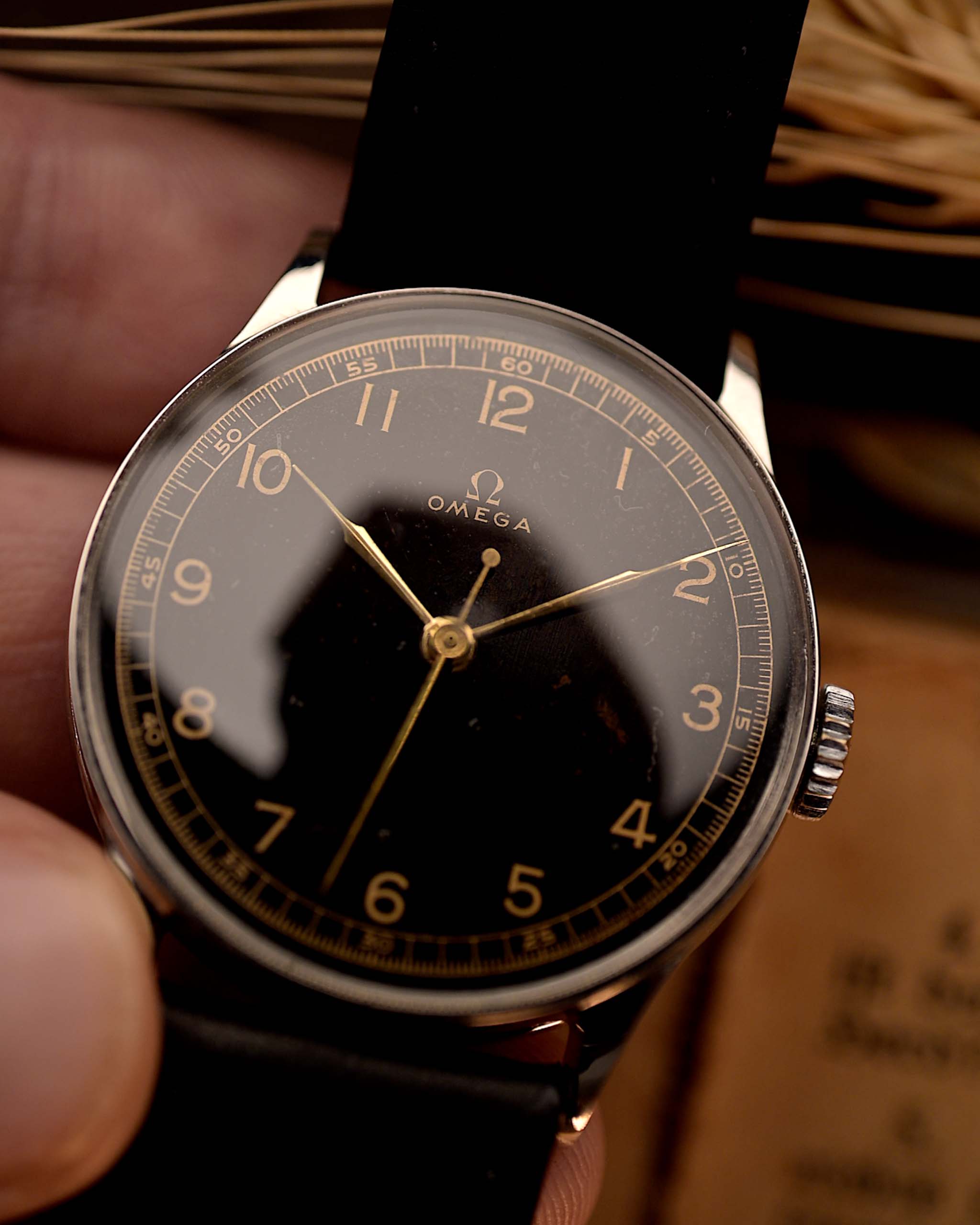 Questo Omega del 1939 è un esempio eccezionale di orologeria svizzera dei primi del Novecento - e un vero gioiello da collezione. Il suo quadrante originale nero lucido e dorato, con numeri arabi dorati e lancette a siringa dorate abbinate, irradia eleganza e carattere. Quadranti come questo sopravvivono raramente in condizioni così belle.