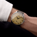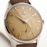 Questo Omega del 1954 ha tutto ciò che si desidera in un orologio da sera: una cassa ben bilanciata da 35 mm, un ottimo quadrante a nido d'ape con secondi sussidiari e splendide lancette in oro rosa e indici in oro rosa sovrapposti molto eleganti.
