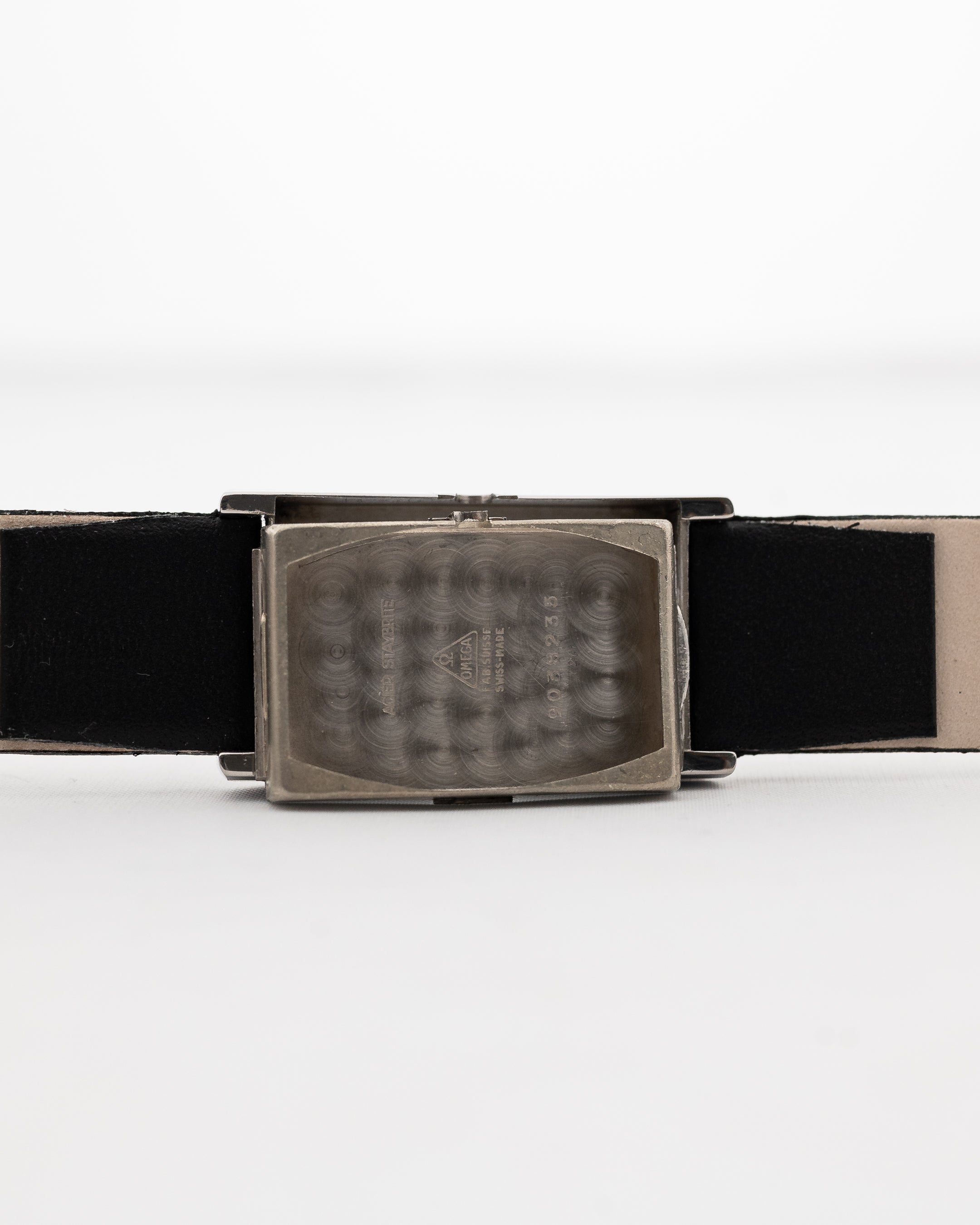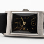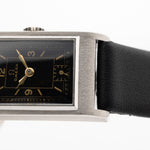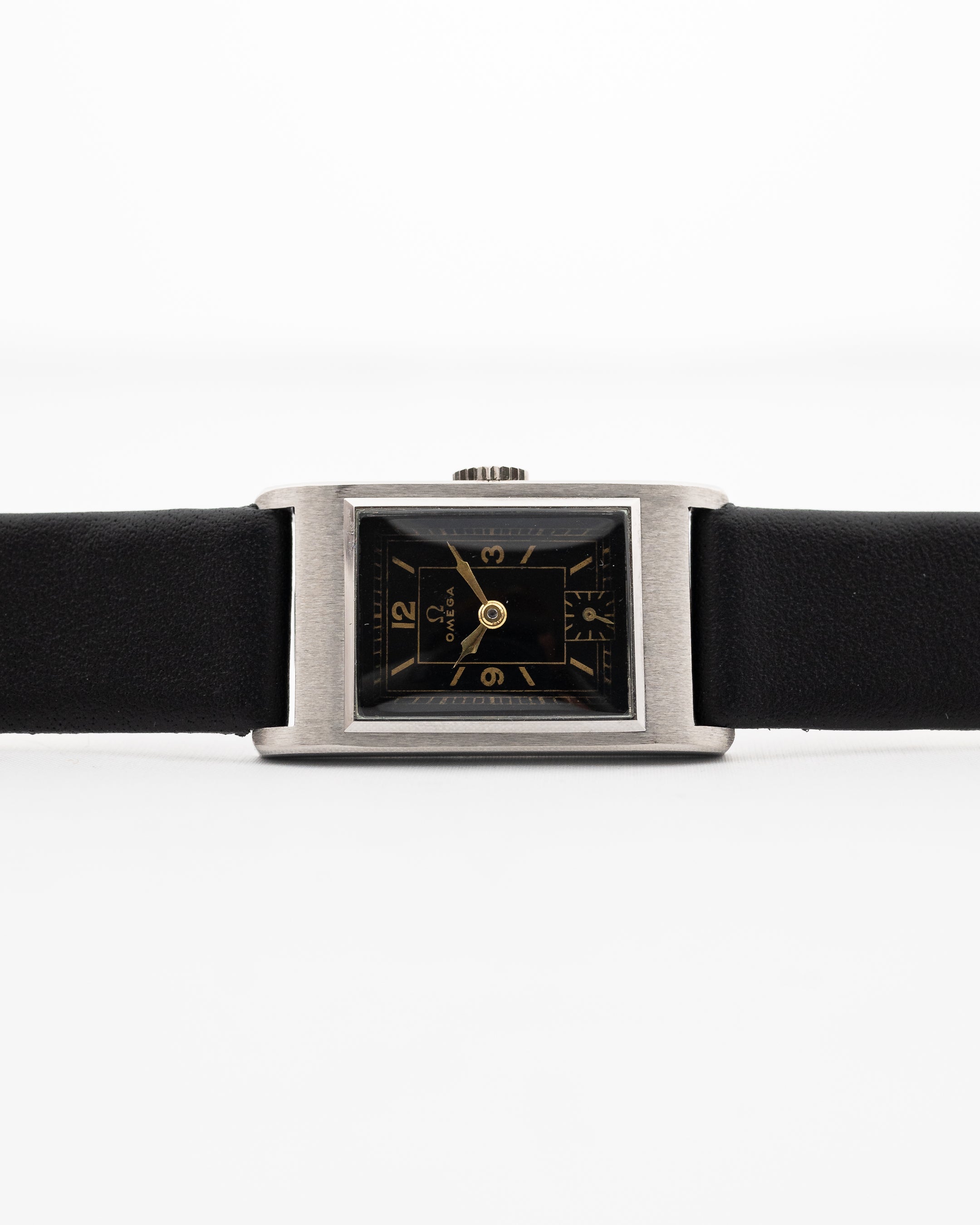 Questo non è il primo Omega Art Deco Dress Watch di cui ci siamo innamorati. Questo esemplare presenta un'enorme cassa rettangolare in acciaio ed è reso ancora più attraente dal suo splendido quadrante nero lucido con numeri arabi Art Déco, secondi sussidiari e una meravigliosa e unica lancetta in oro. E la ciliegina sulla torta è la splendida condizione.