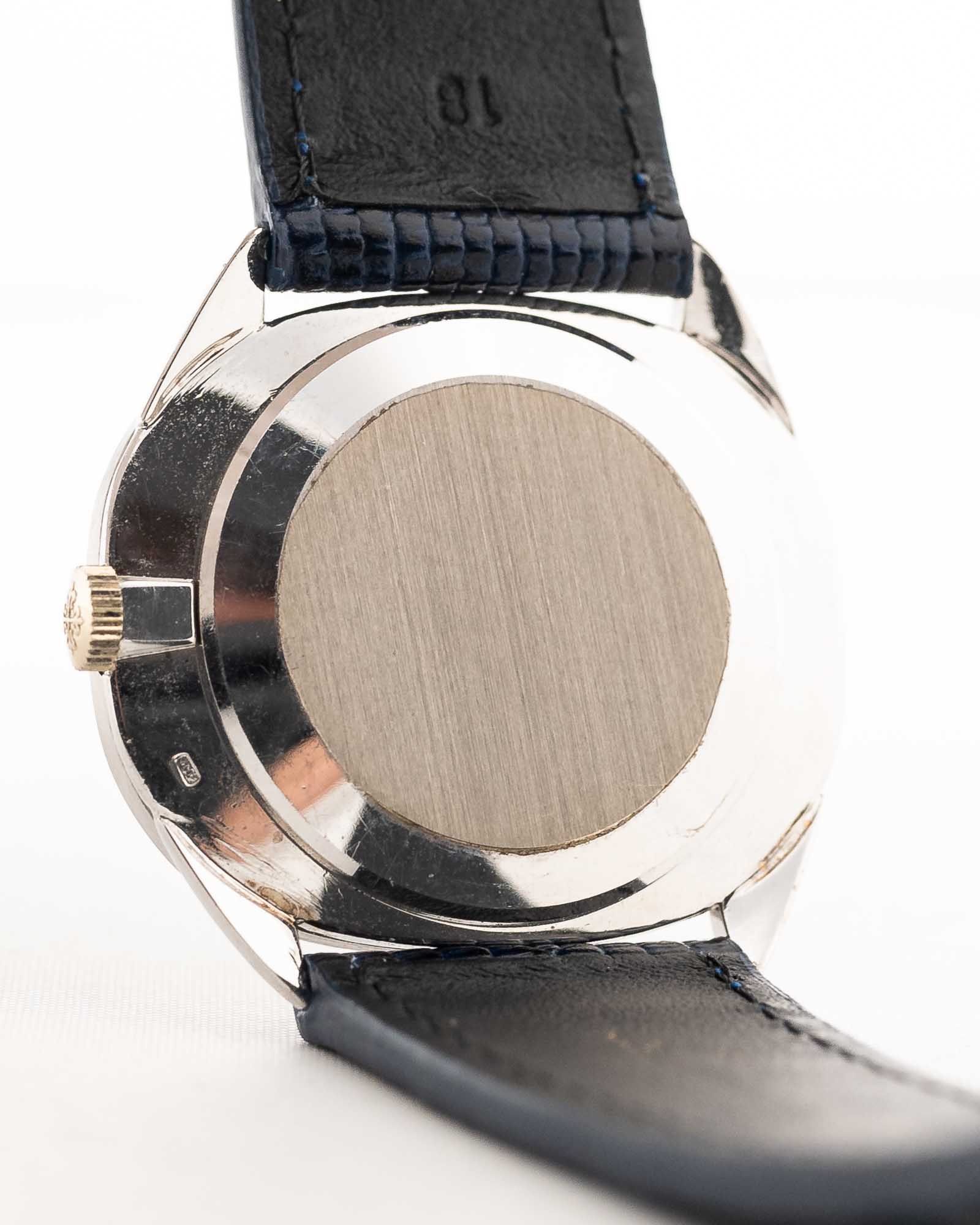 Con il suo perfetto equilibrio tra forma rotonda e rettangolare, il Patek Philippe Ellipse è da tempo considerato un capolavoro di proporzioni. Questo modello Ref. 3545 degli anni '70 esemplifica l'eleganza architettonica del modello, con la sua armoniosa cassa in oro bianco 18 carati e lo splendido quadrante blu guilloché Sigma che irradia una brillantezza sobria.